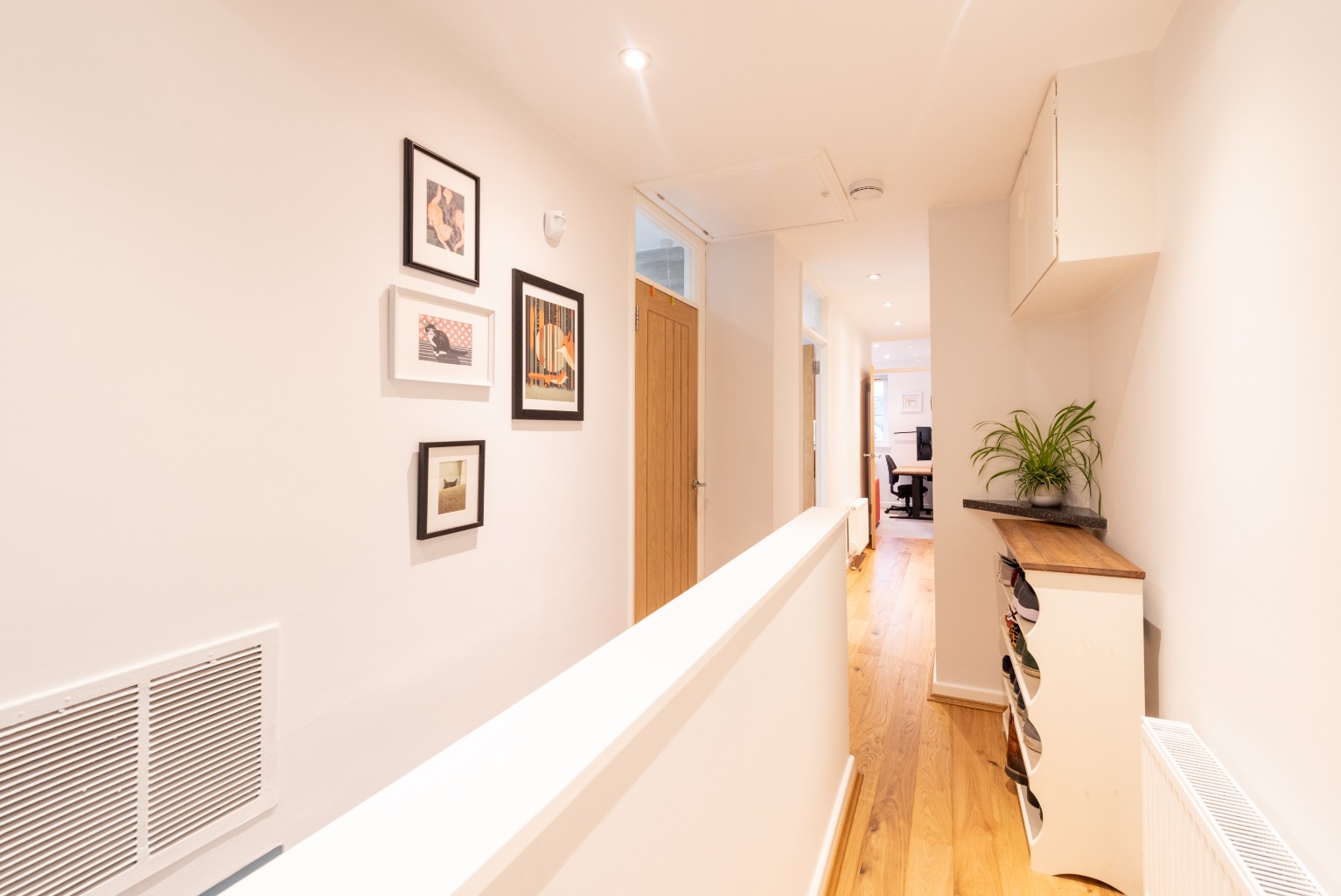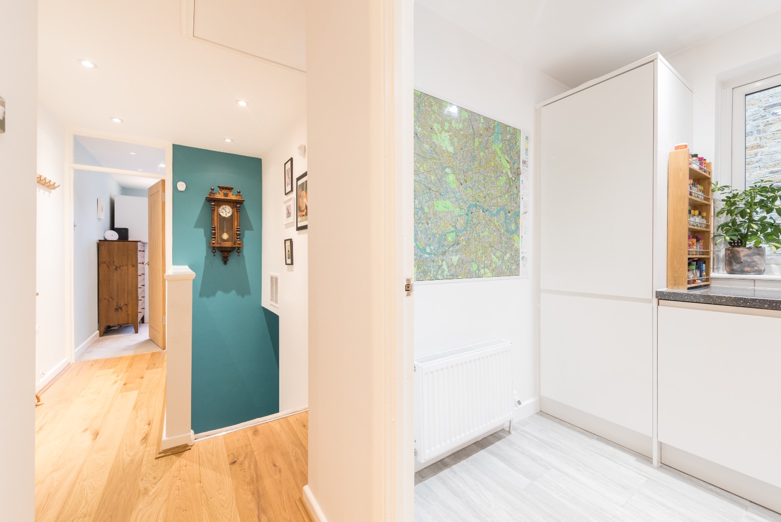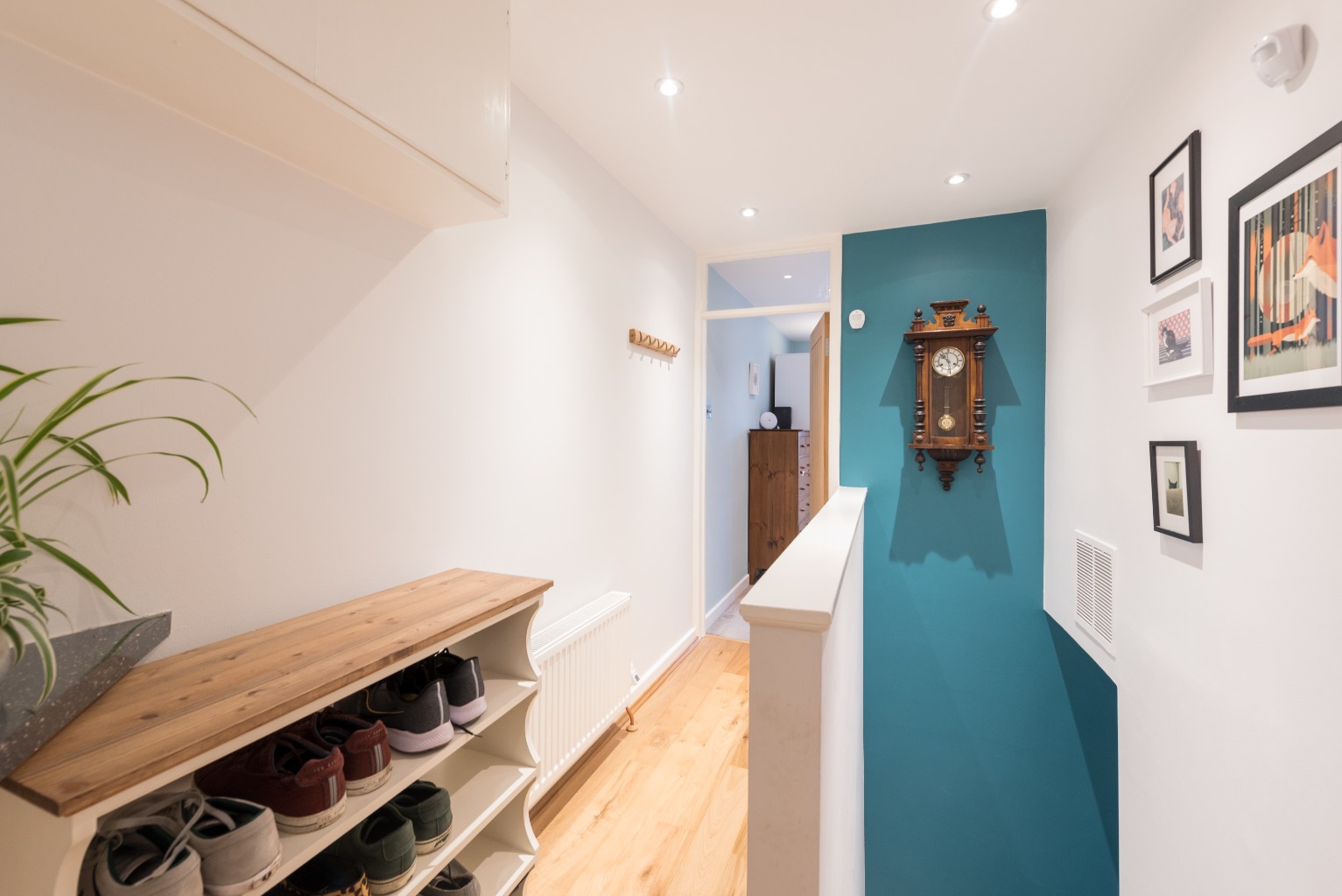 The property is on the first floor of the building containing four apartments, and has its own private access door and parking space. The wall leading up the stairs is painted in a deep teal green, offering a vibrant and warm welcome as you enter. As you ascend the carpeted stairs, the landing area including newly installed engineered wood flooring underfoot, provides access to the whole apartment.