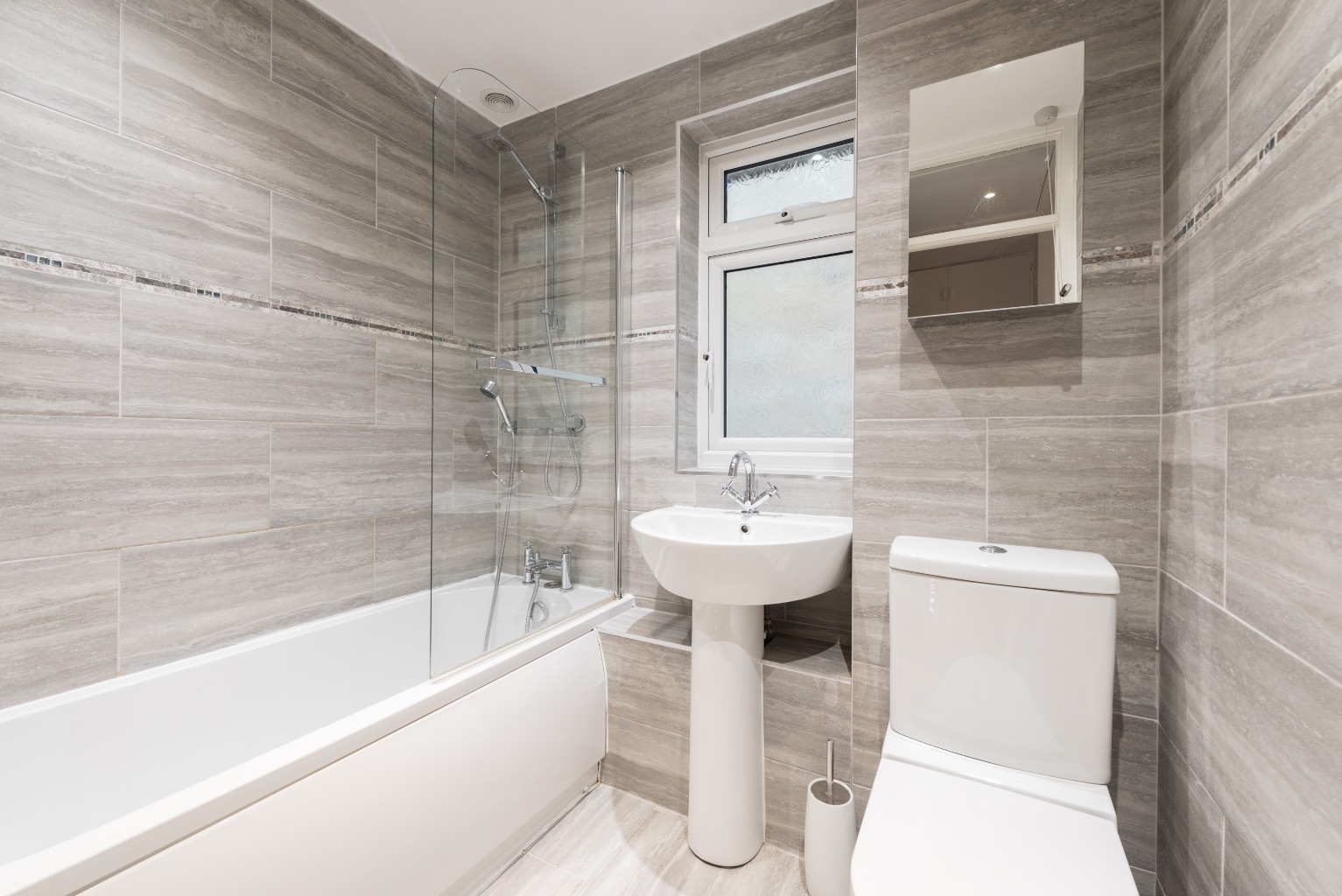 A little further down the hallway is the bathroom, again recently fitted and using the same grey flooring as the kitchen, along with stylish grey slate tiles floor-to-ceiling on every wall – a bathroom that wouldn't look amiss in a bespoke boutique hotel. There's a white end-fill bath with overhead shower and glass screen, a deep D shaped sink and a fitted toilet. There's also a mirrored cabinet to store away your personal products and toiletries. Again, there's an understated and sophisticated feel to this space, and the quality of the finish will ensure this bathroom looks great for years to come.