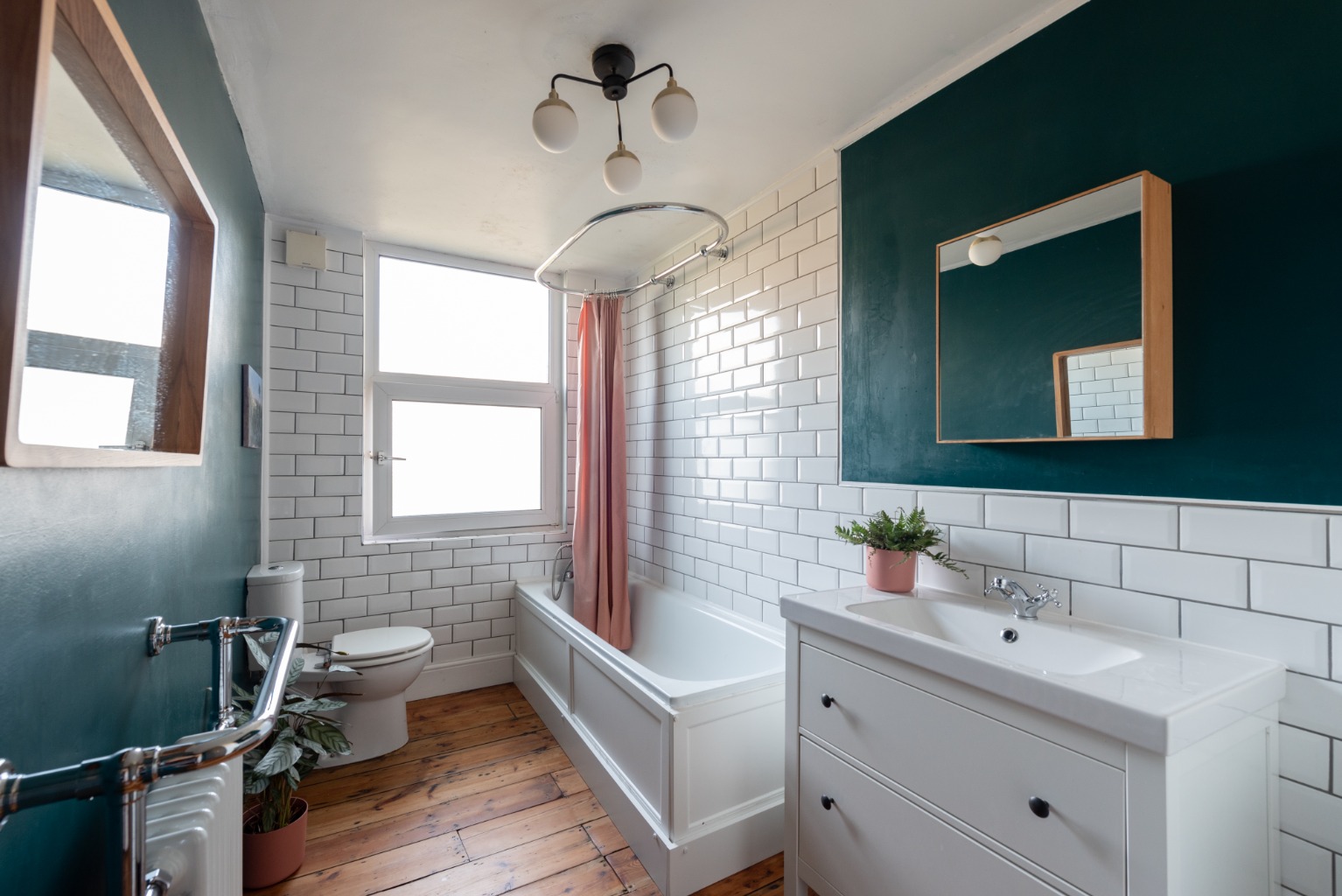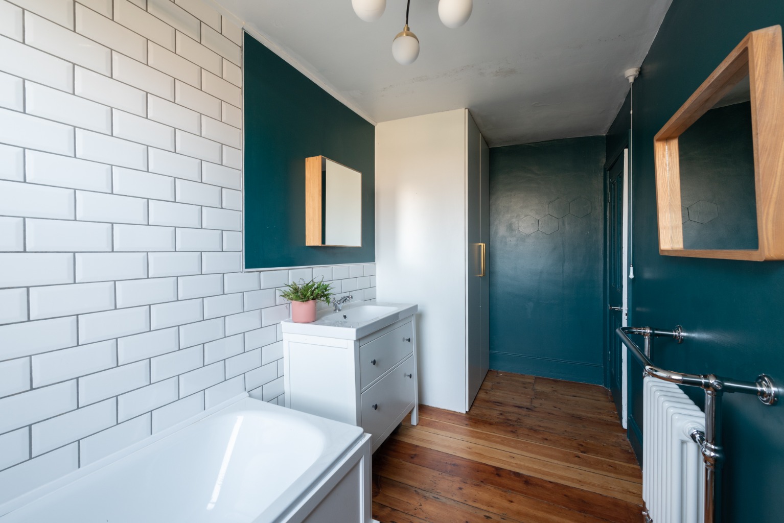 Off this rear hallway too, you have the period panelled door to your family bathroom, also benefiting from the wooden flooring and large window that are the hallmarks of this property. The room is stylishly decorated with floor to ceiling metro tiling on two walls, not only giving a contemporary edge to the room but making it a breeze to keep clean, too. The gleaming white of these tiles is enhanced by the clever use of a chic teal colour on the painted walls. You have a minimalist three lamp chandelier adding a modern twist, contrasting with the more traditional chrome fittings of your over-bath shower and ‘school radiator’ style radiator and towel rail. There’s a shaker-style panelled bath and a modern white vanity unit to house your cosmetics. You have even more storage on hand with a large, built-in floor to ceiling cupboard, which is perfect for stashing everything away, so you can maintain the clean lines of the property.
