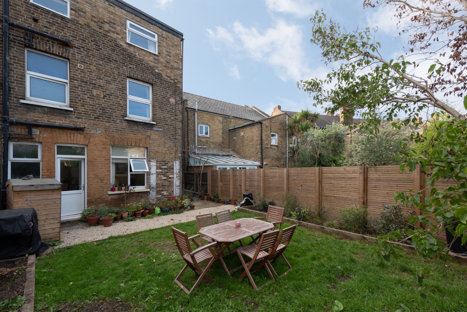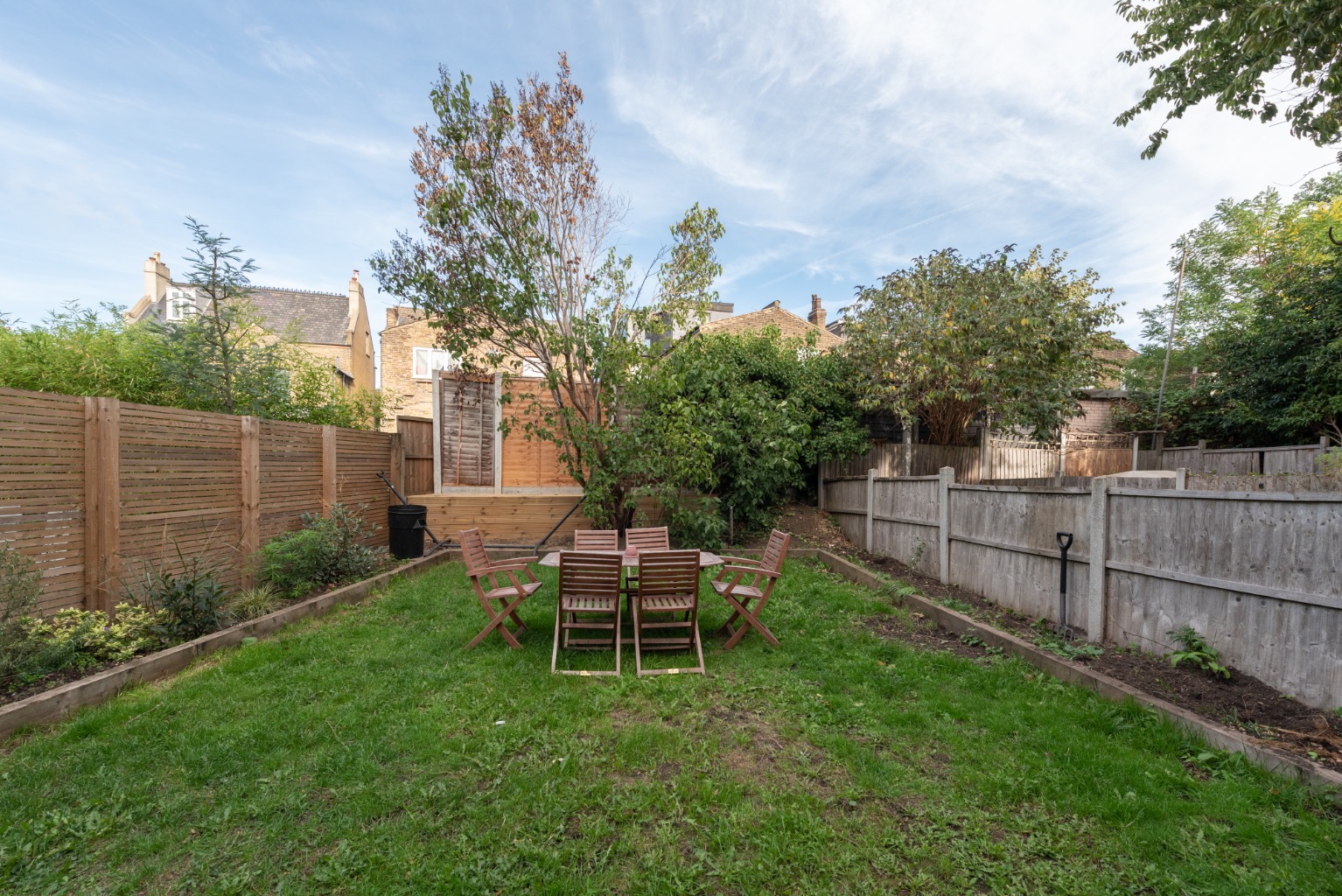 To the rear, your garden is a good-sized communal garden. You own an area of this garden yourself, but the owner has chosen for the whole area to be configured to share, so that everyone gets to benefit from a larger space, and could easily be split by a prospective owner. There’s plenty of room to relax and entertain. You have a terraced area next to the property, then a lawn which takes up the majority of the garden, surrounded by borders edged by sleepers.