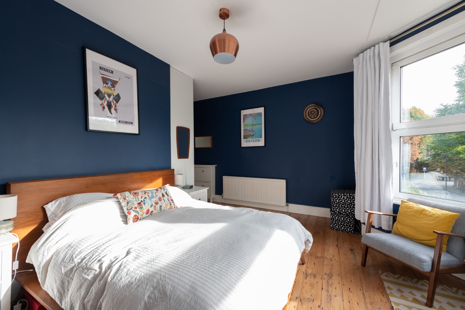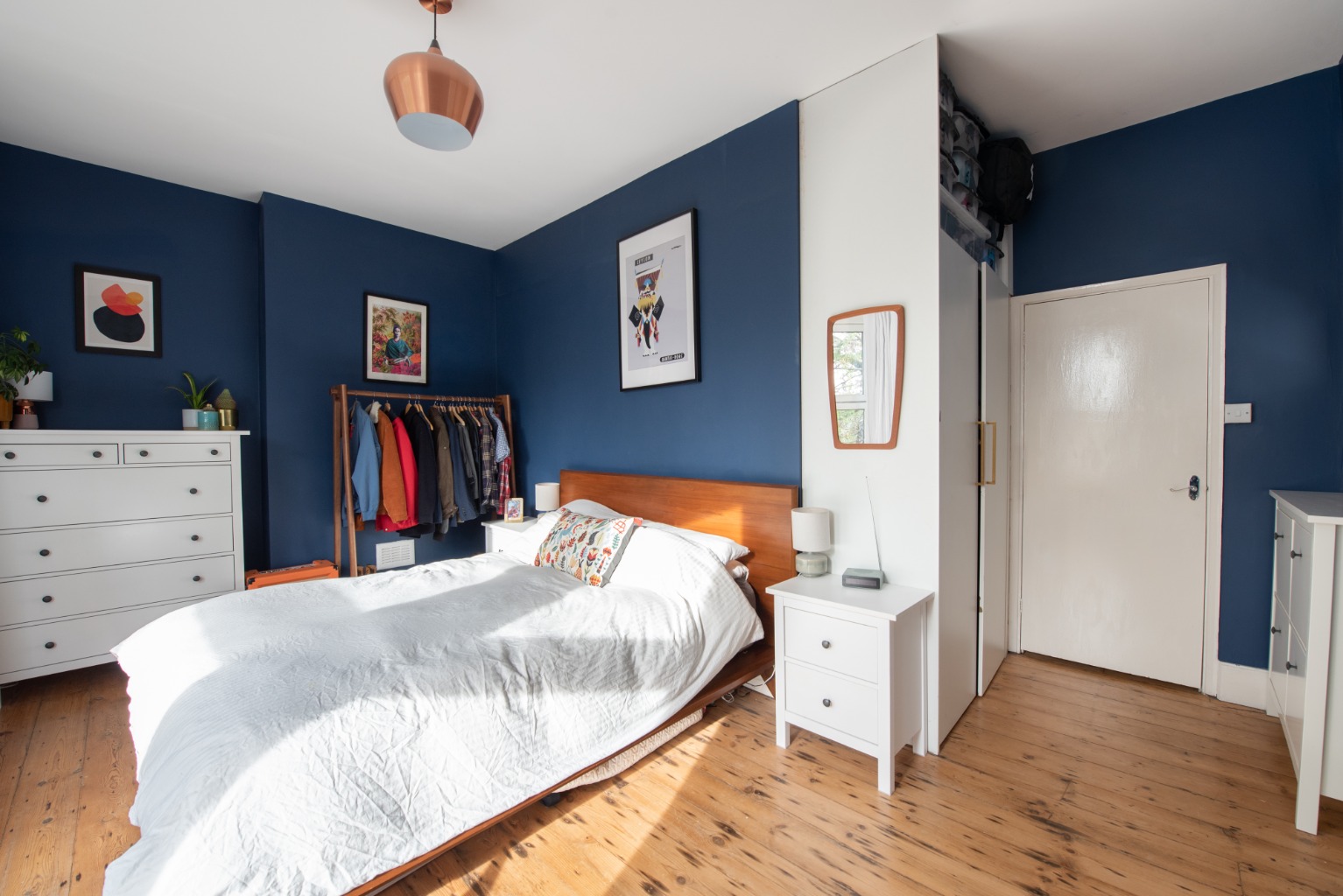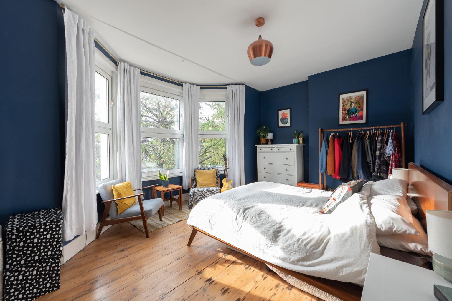 To your left, you’ll find bedroom one. Situated at the front aspect of the property, this room is absolutely stunning, benefitting from a bay window formed from three enormous windows which finish at ceiling height, which means your bedroom is flooded with natural light. This is a grand, impressive bedroom of spacious proportions, decorated in a smart navy blue, with its characterful original floorboards giving a warmth to the ambiance. You have generous storage in your bedroom already built-in, with an enormous floor to ceiling double height double wardrobe, finished in white with stylish brass handles. A truly beautiful room to rest and relax in and a highlight of this lovely property.