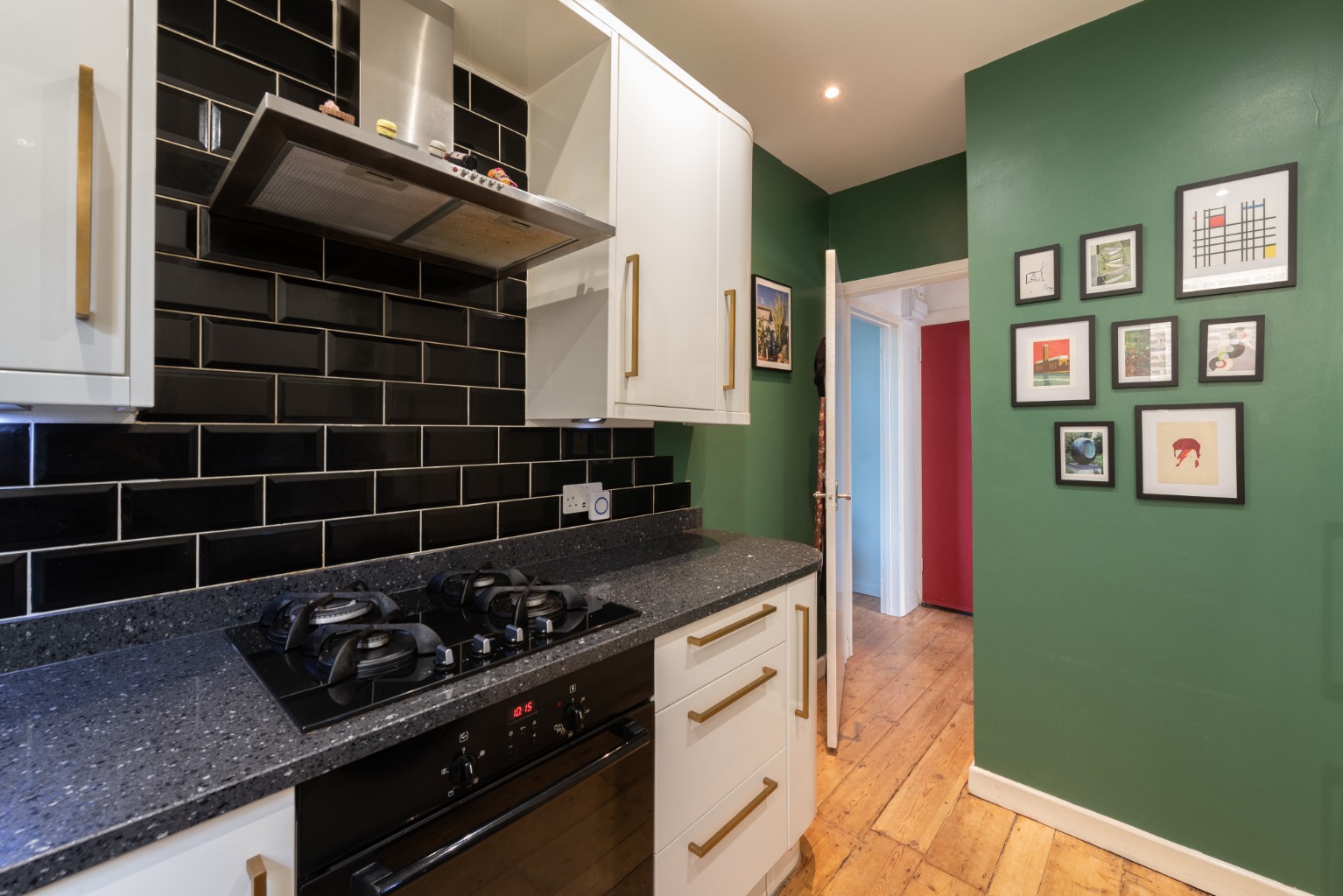 Immediately opposite your front door is the door to your kitchen, which runs across the rest of the width of the property, with a large window to the side aspect. It’s a bright room with plenty of natural light and recessed LED lighting for when the sun goes down. Your kitchen units are clean, white gloss with the same brass handles as the bedroom storage cupboard – small, thoughtful touches that tie decorative scheme of the whole property cohesively together. The organic feel of your kitchen is created by the use of forest green walls, the ergonomic curves of the units and the ever-present wooden flooring. Smart grey worktops and black metro tiling add a slick, urban contrast. The kitchen has been carefully designed and equipped – you have the benefit of an integrated fridge and freezer hidden behind the glossy units, there’s a gas hob and you have a dishwasher as well as space for a washing machine.
