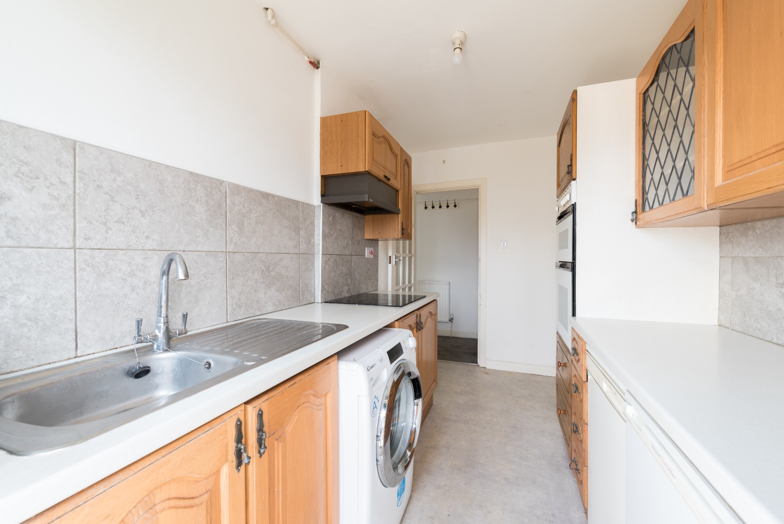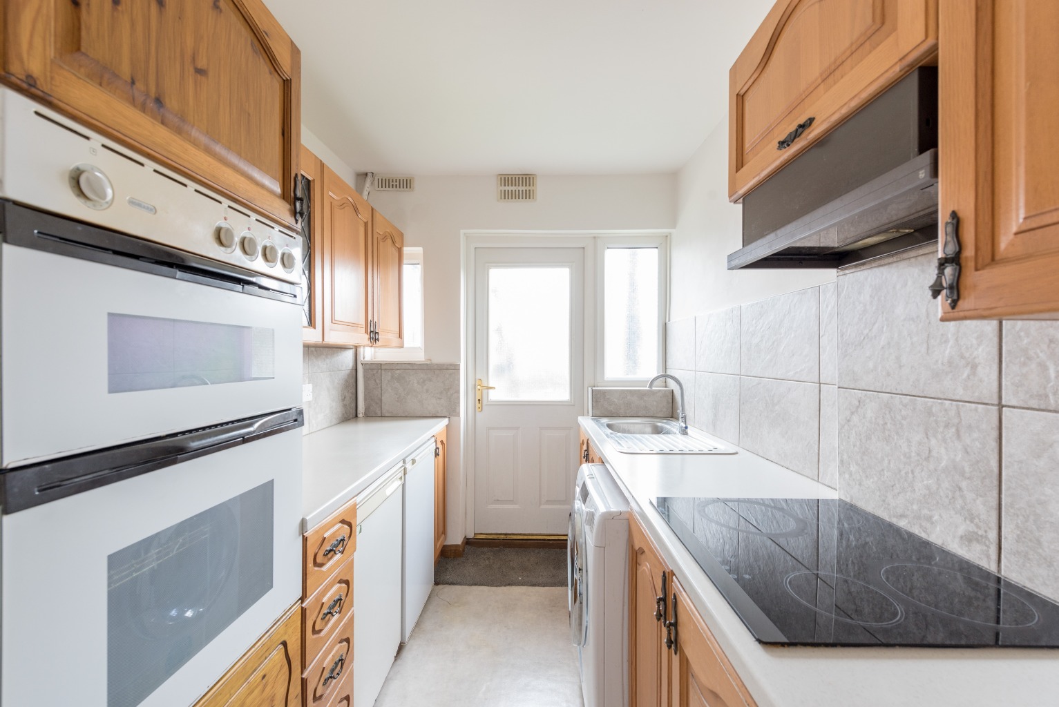 This charming galley kitchen has been designed to take maximum advantage of the available floor space, with a range of traditional-style wooden wall and base units running along both sides. The layout has also been carefully conceived to make cooking up those meals a breeze, and the integrated double oven and hob, along with space under the white worktops for your fridge, freezer and washing machine give you everything you need for a perfectly serviceable space. The neutral walls and stylish grey tiled splashback finish off the look, and the external door with its dual windows, ensure a lovely bright atmosphere.