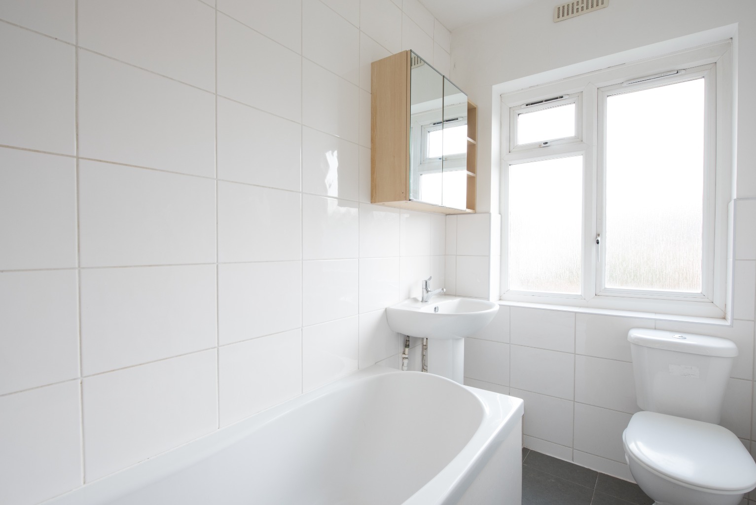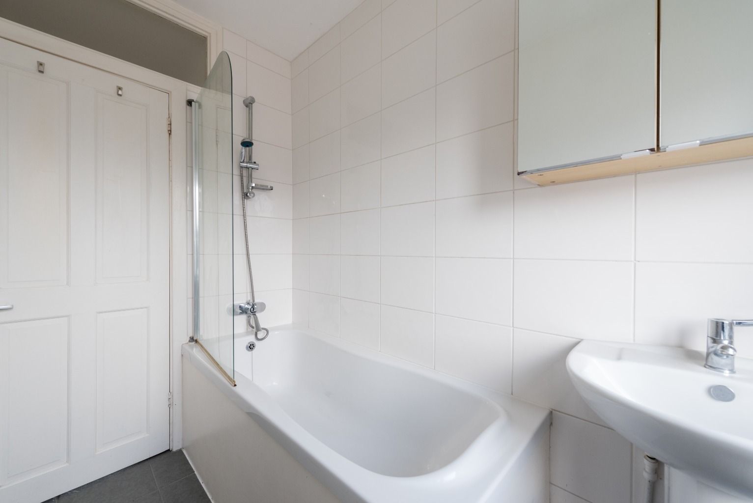 Next you’ll see the adjacent door leading to the smart, stylish and neat bathroom, fitted with a white suite consisting of WC, sink and bath with overhead shower. Tiled in white across three walls, with the fourth also painted in white, the space is well illuminated by the light coming on from the large frosted window. The bathroom has a large heated towel rail and a mirrored cabinet above the sink, and there’s room for a small vanity unit should you wish to stow away your toiletries.