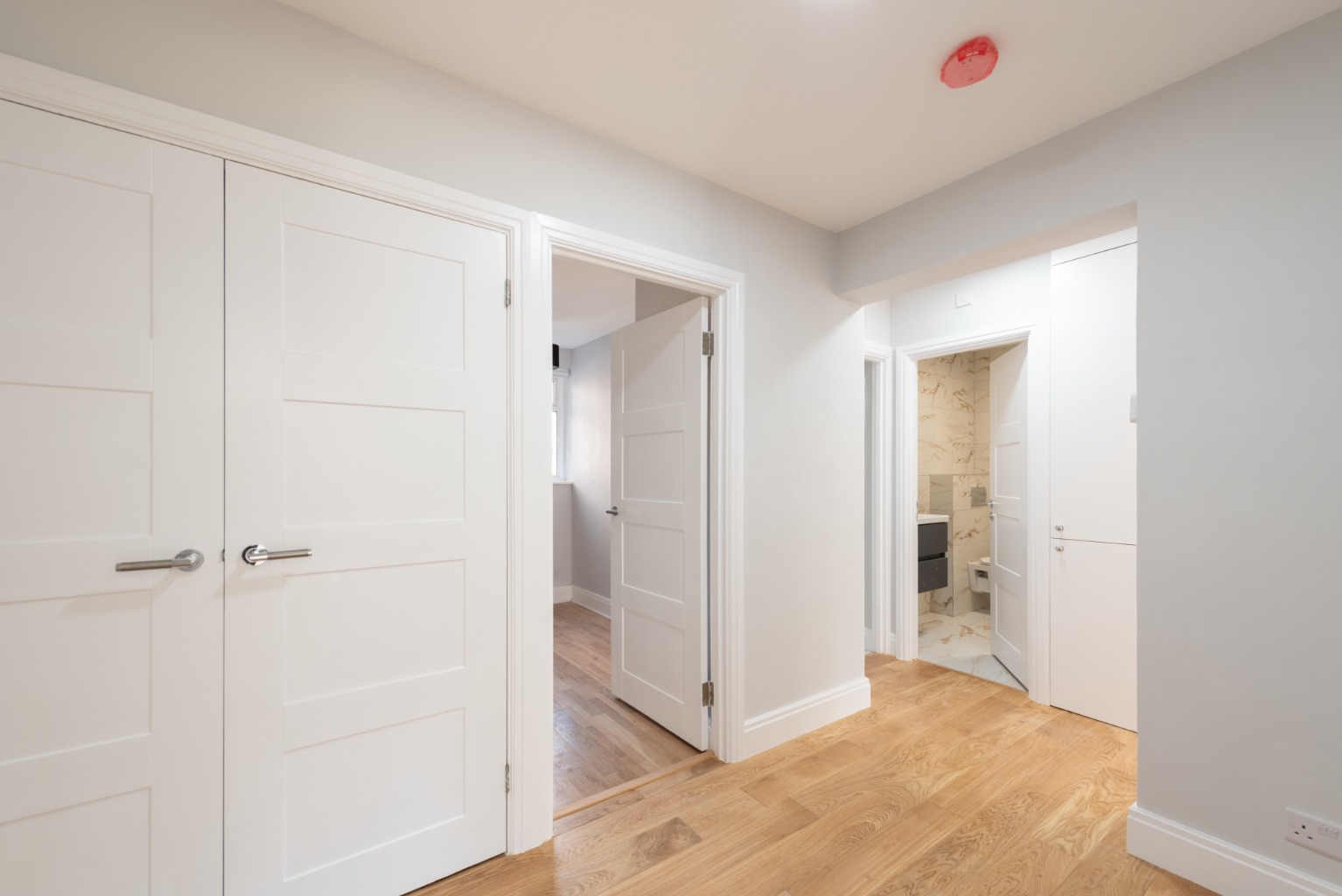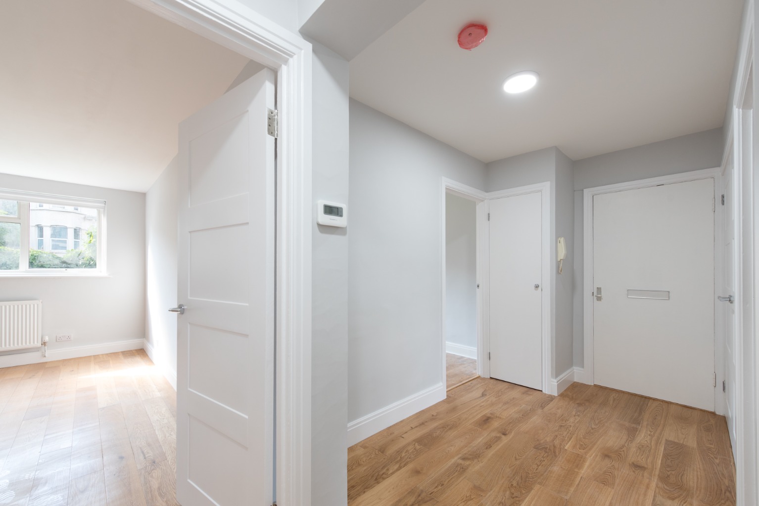 As you enter, you’ll find a spacious private hallway, which serves each of the rooms and also has two large storage cupboards. There’s also an intercom phone to allow secure access for visitors, and you’ll note the fresh bright decor and newly laid wood-effect flooring.