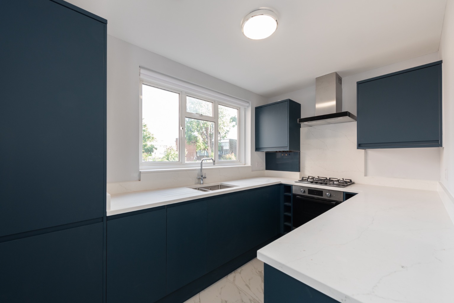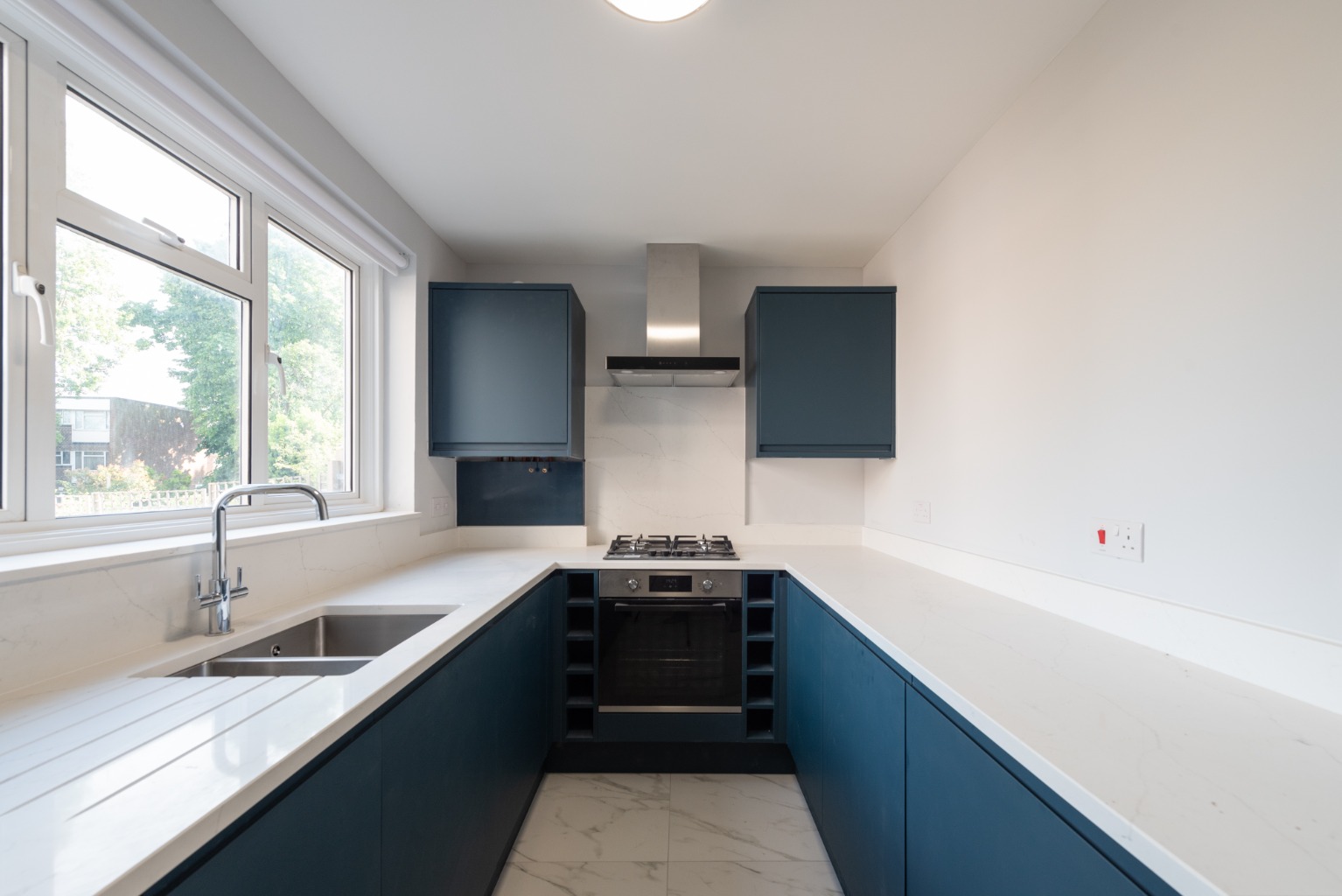 The newly fitted kitchen overlooks the rear gardens and is laid out in a galley style, with two long runs of two runs of stylish stone white work surfaces, complemented by contrasting, modern deep blue base and wall units. You have all of your brand new integrated appliances.
