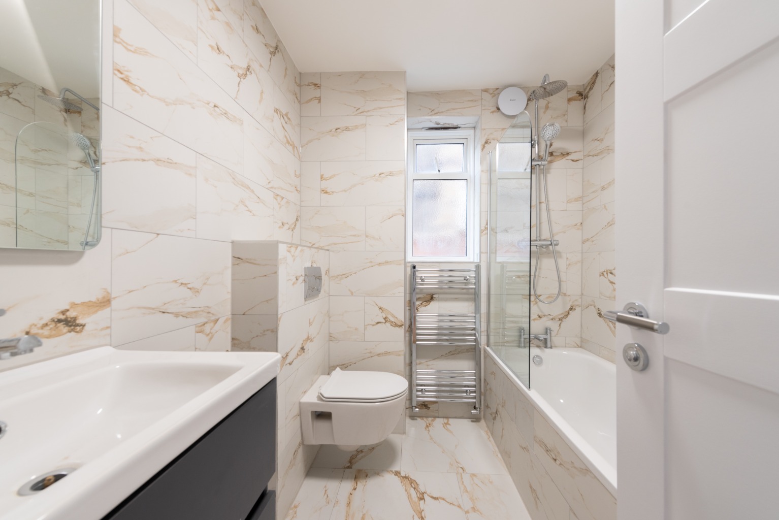 The family bathroom has been refurbished in stunning white and gold marble throughout, with a stunning contemporary suite including W.C. with bath and shower above, and a large sink with unity below. A fitted mirror and chrome towel radiator complete the look.