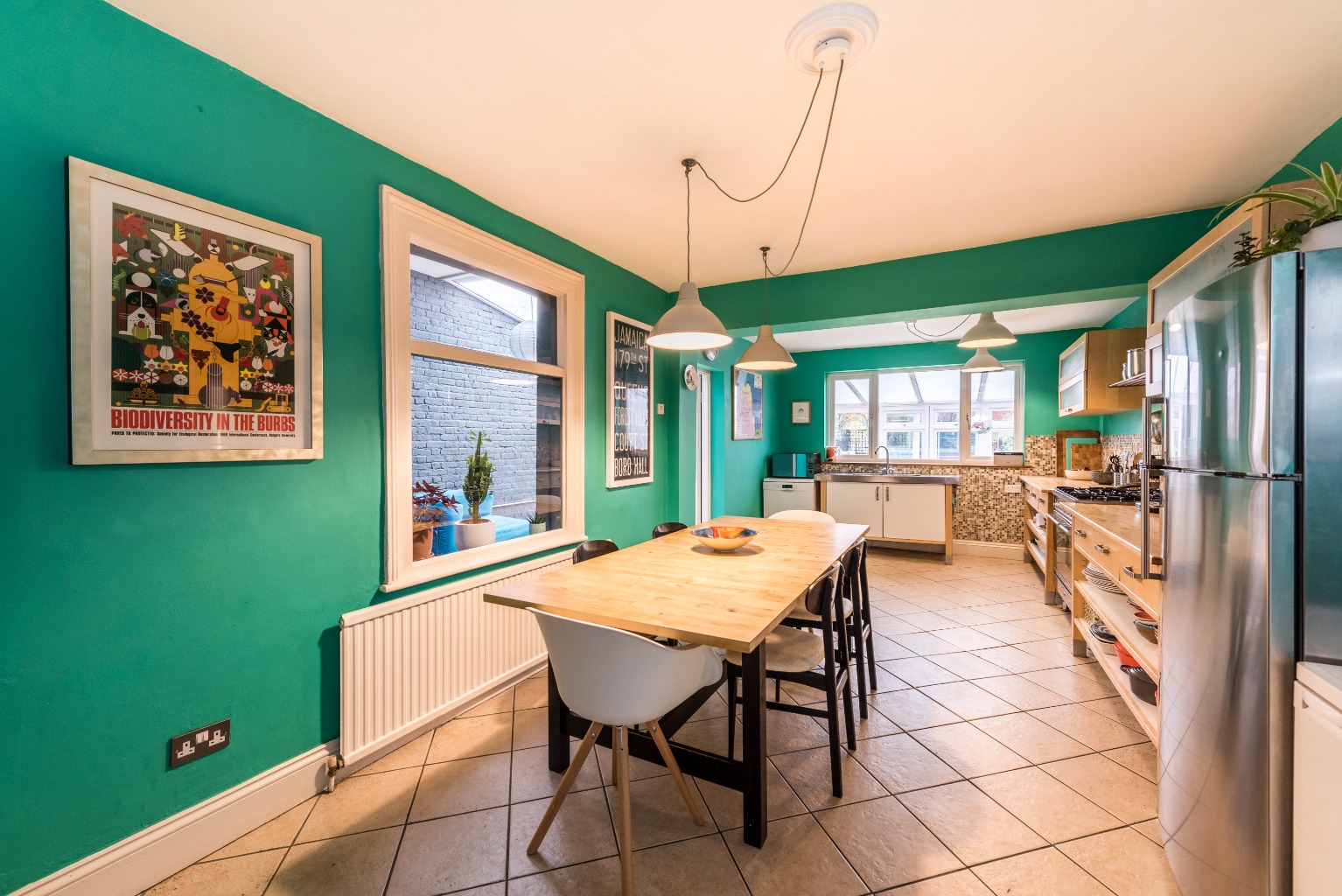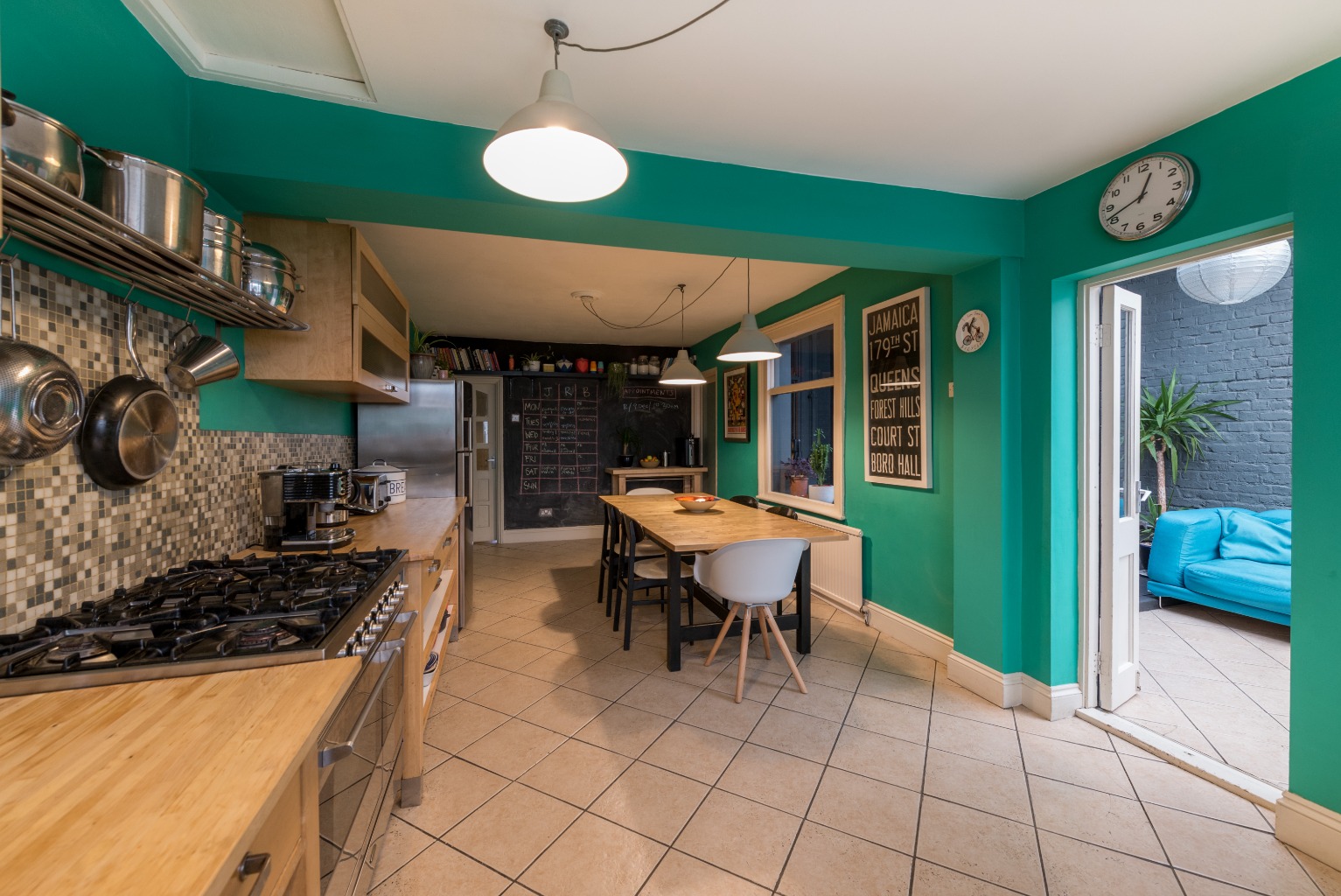 The other internal door in the conservatory leads you back through into your kitchen/diner. This room is any chef's dream with a huge range hob and double oven, no shortage of beautiful wooden worktops, and easy access open-plan storage, all free standing. It's painted in a vibrant turquoise colour which pops against the mosaic grey splashback. The sink is situated at the window which looks into the conservatory, and next to the sink is a dishwasher. It's worth mentioning the kitchen appliances - cooker, fridge-freezer, dishwasher, washing machine and dryer - can all be included in the sale, meaning less hassle and a kitchen that's ready to go from your very first day. It's an incredibly well designed space but also has the impressive added benefit of being re-configurable, with most of the units being free-standing. The room is large enough to take a family sized dining table too for minimal fuss at mealtimes, and an interesting feature here is the blackboard wall, a lovely way to record memories from visitors, keep the kids amused while you're getting dinner ready or even for jotting down your shopping list as you run out of your kitchen essentials.