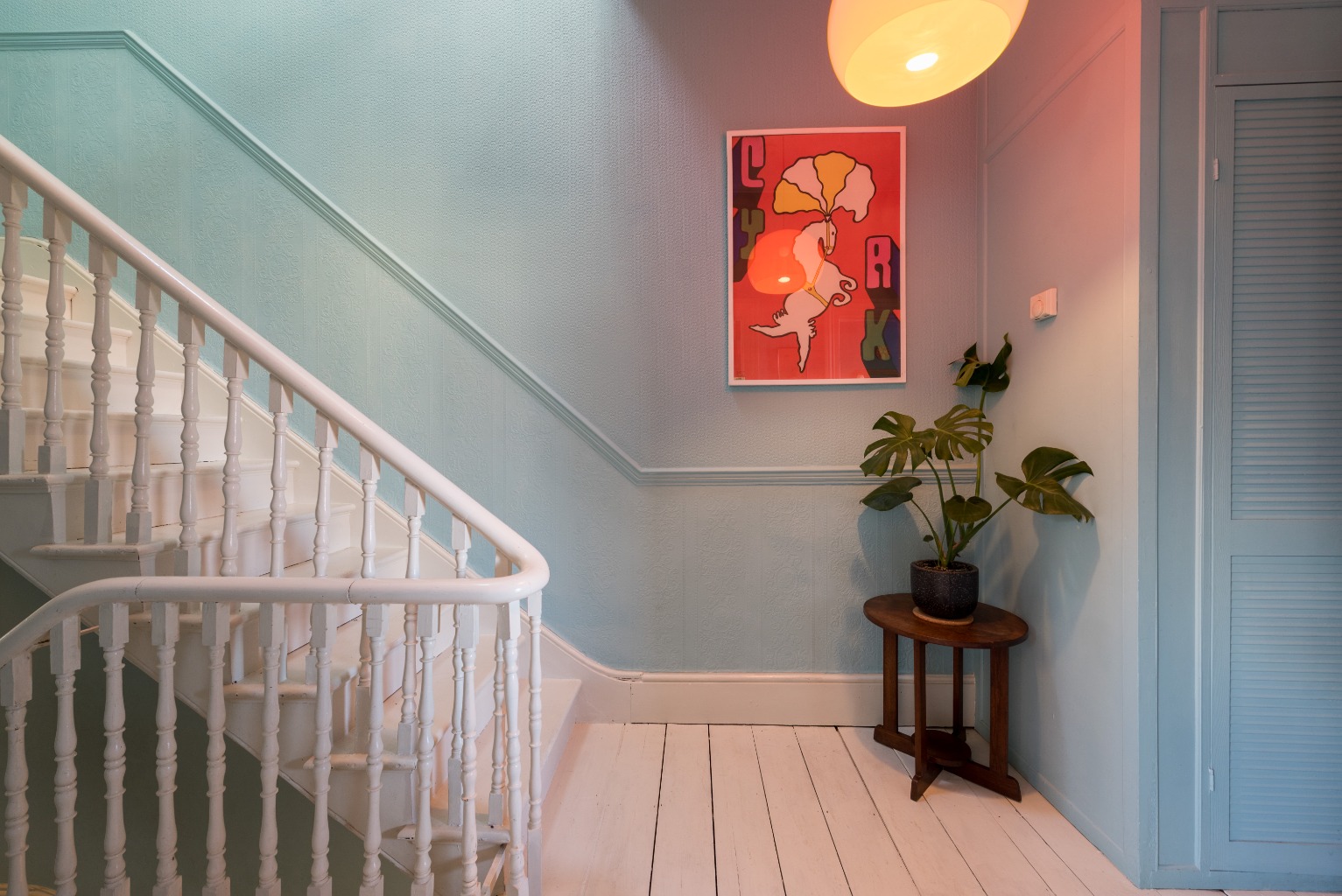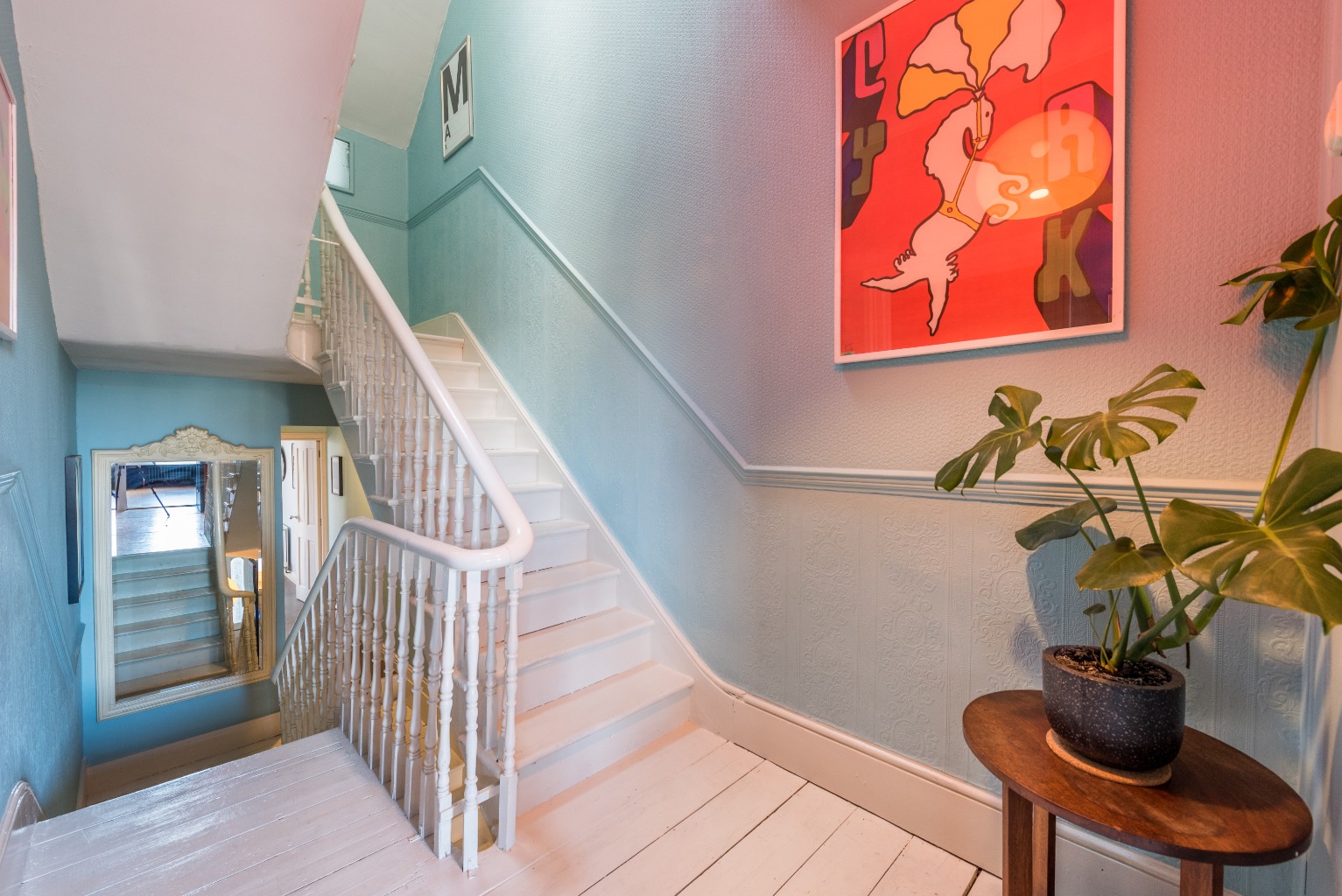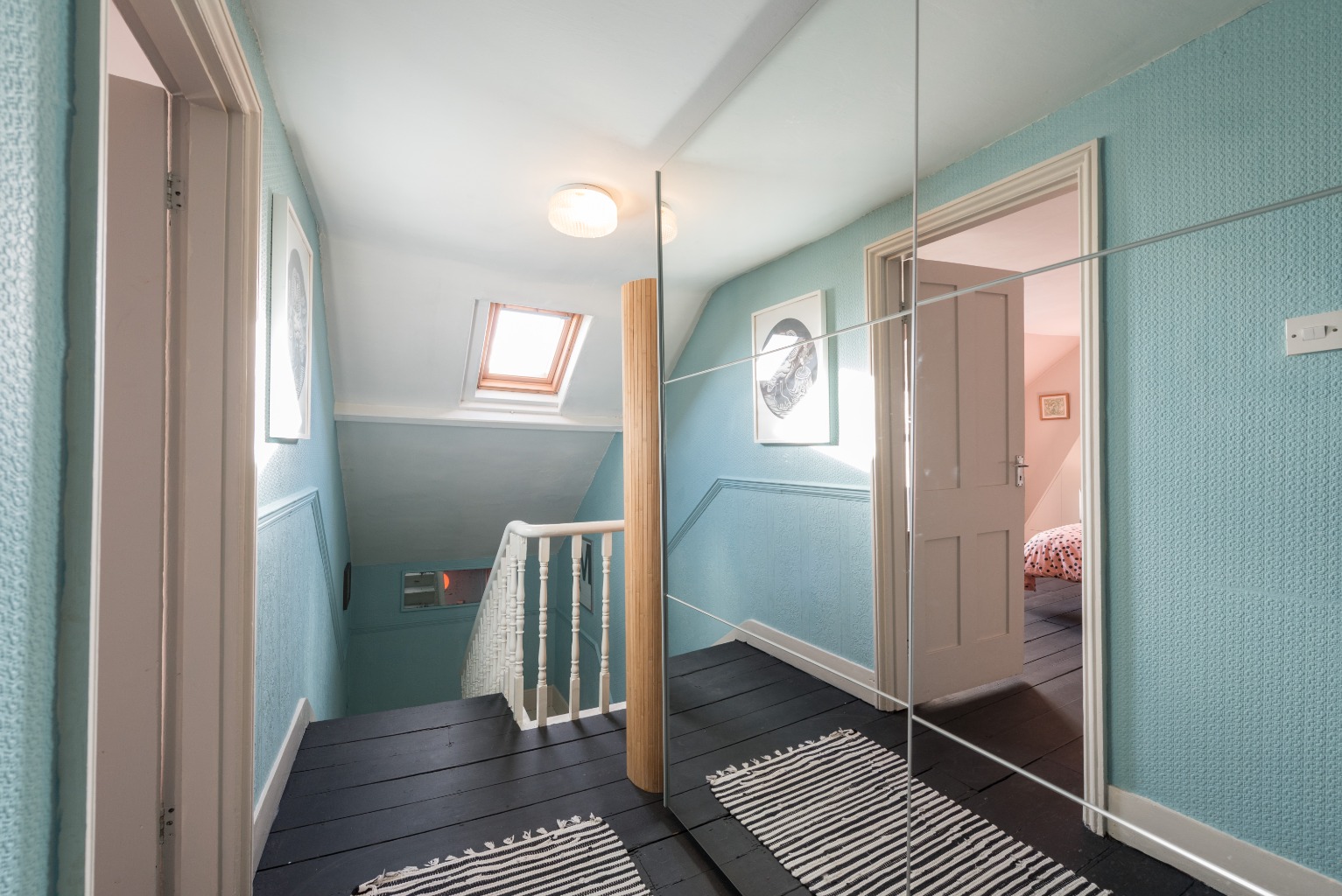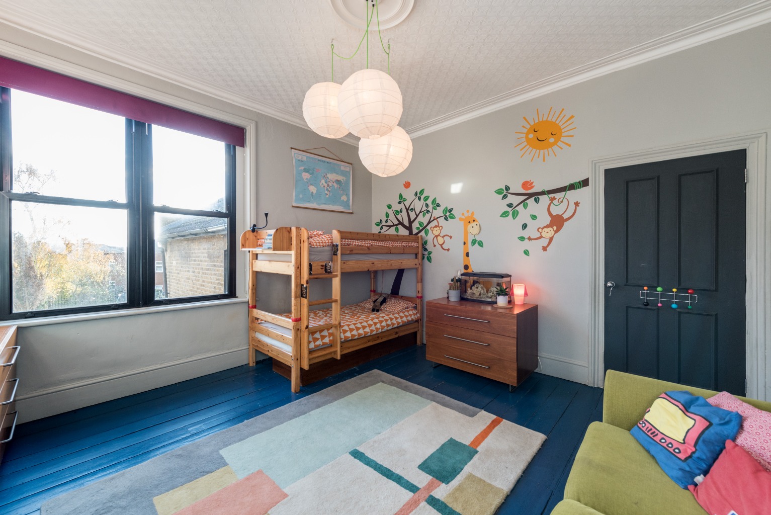 The second bedroom is the next room you'll find as you leave the bathroom. Currently used as a children's bedroom, it has bright blue painted floorboards and a playful monkey motif on one wall. It's a large double room, currently holding a bunk bed, and with plenty of storage for toys with its built-in wardrobe on the left of the chimney breast – even leaving room for a small sofa or sofa bed. There's no reason the blue floorboards would look out of place in the bedroom of a teenager or young adult and careful planning could give see you using this as a fantastic colour accent for even a more sophisticated and grown-up space.