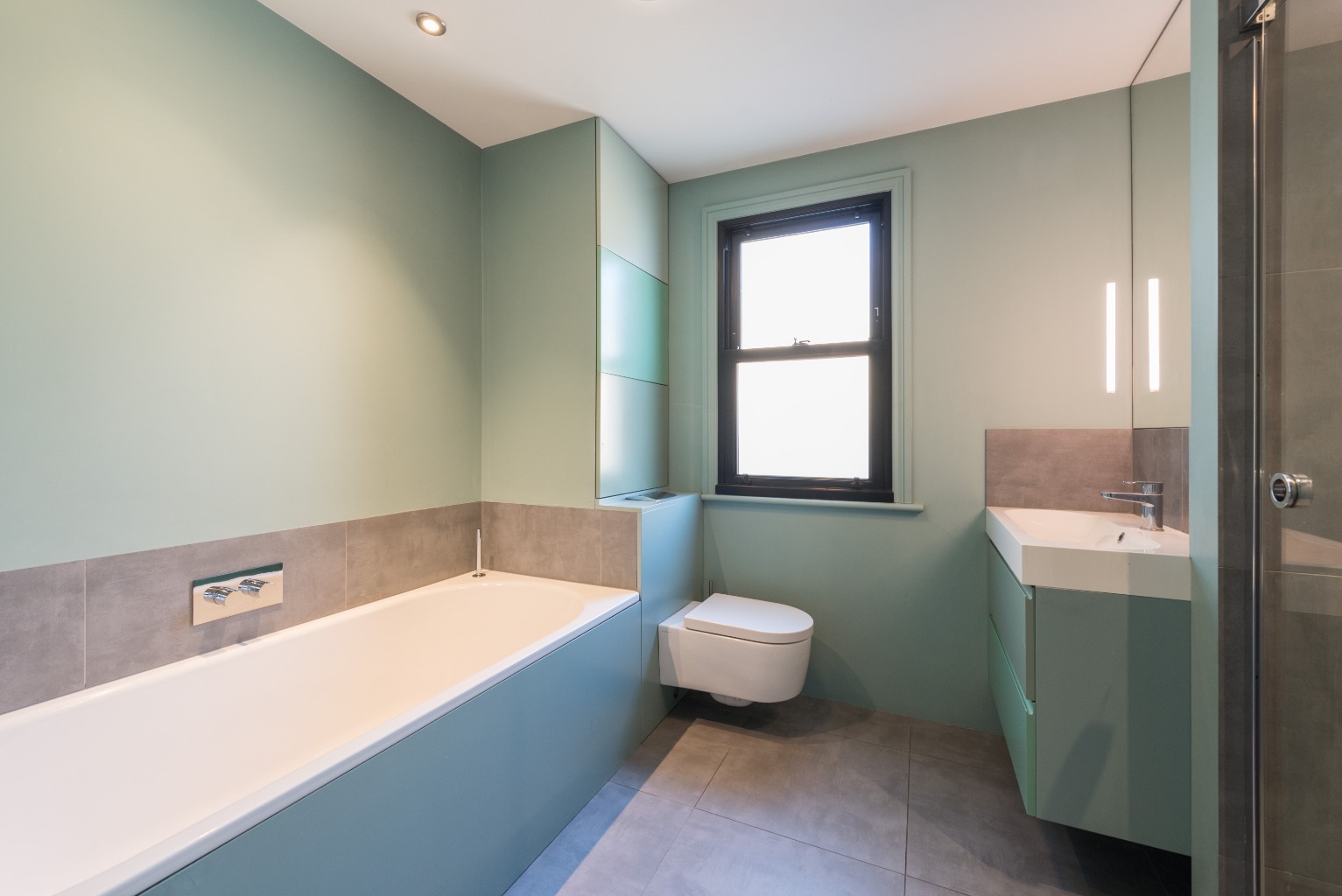 The next door along the landing is fabulously fitted, ultra-modern family bathroom. Its sleek and contemporary design offers clean lines with minimalism at its heart. There's a deep, long, luxurious bath, a fitted toilet with hidden cistern and a lovely square sink unit with storage and oval basin. Once you also consider the beautiful and spacious walk-in shower cubicle also part of this space, it's easy to imagine this bathroom belonging in an upmarket boutique hotel.