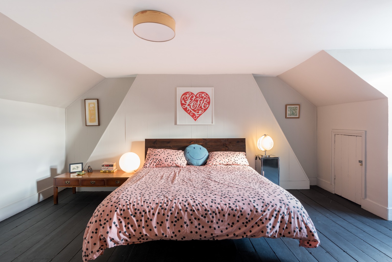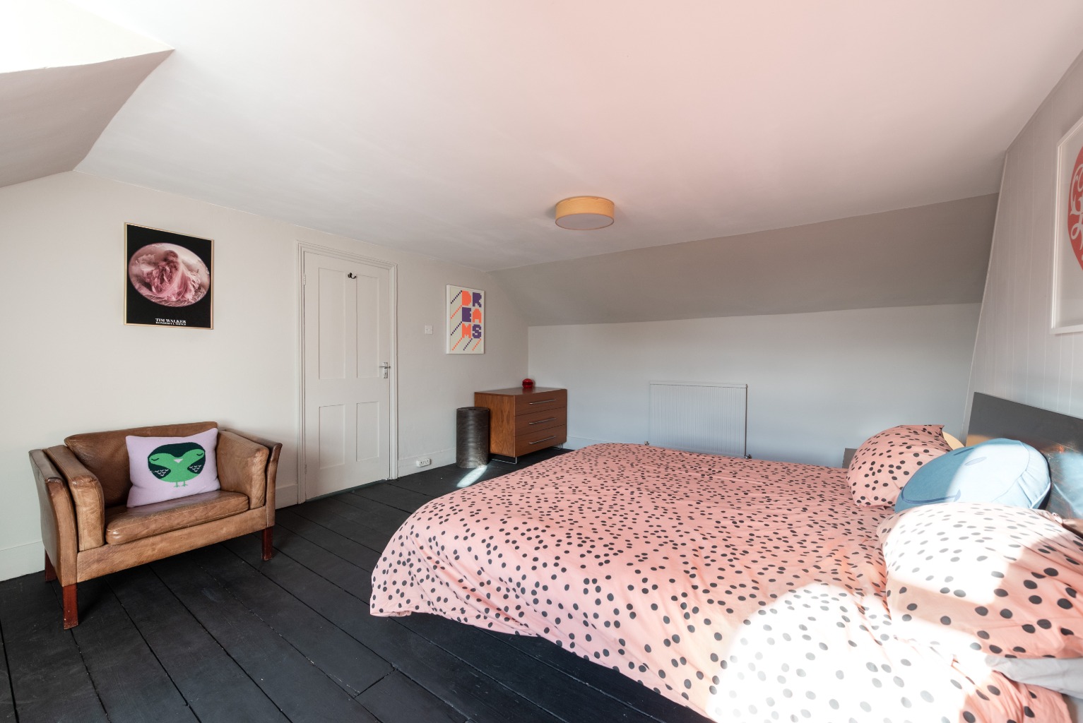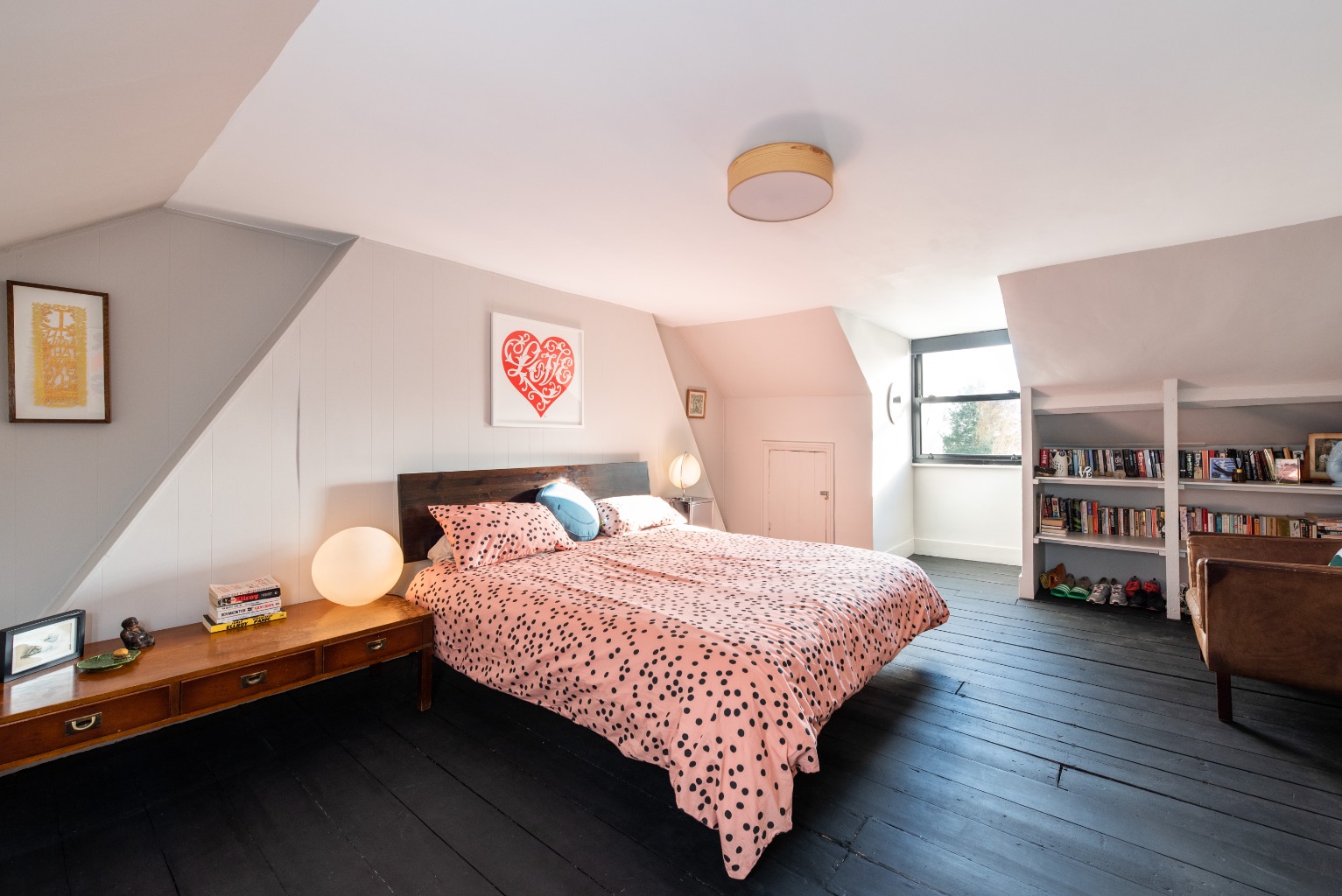 The last bedroom in the property is on the top floor where the shape of the roof makes for an interesting architectural detail which adds a delightful element of extra character – as you enter, you'll also note that there's room for a wardrobe at the top of the stairs, as utilised by the current owners, plus access to the eaves. Another tastefully and sympathetically painted wooden floor gives a sleek contemporary feel, and the room offers storage to the left of the sash window and open shelving to the right for displaying your precious items and photos. Designed to utilise the dimensions of the room efficiently and intelligently, it has a lovely feeling of space and light and is a lovely little hideaway at the top of the house of you want some peace and privacy away from the hustle and bustle downstairs.