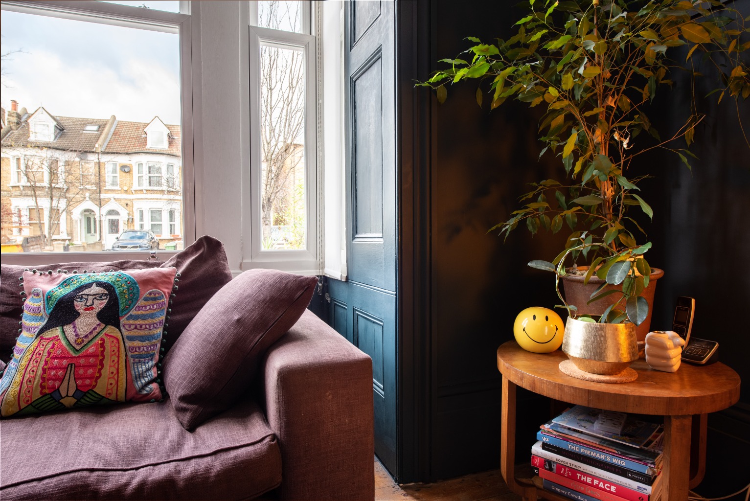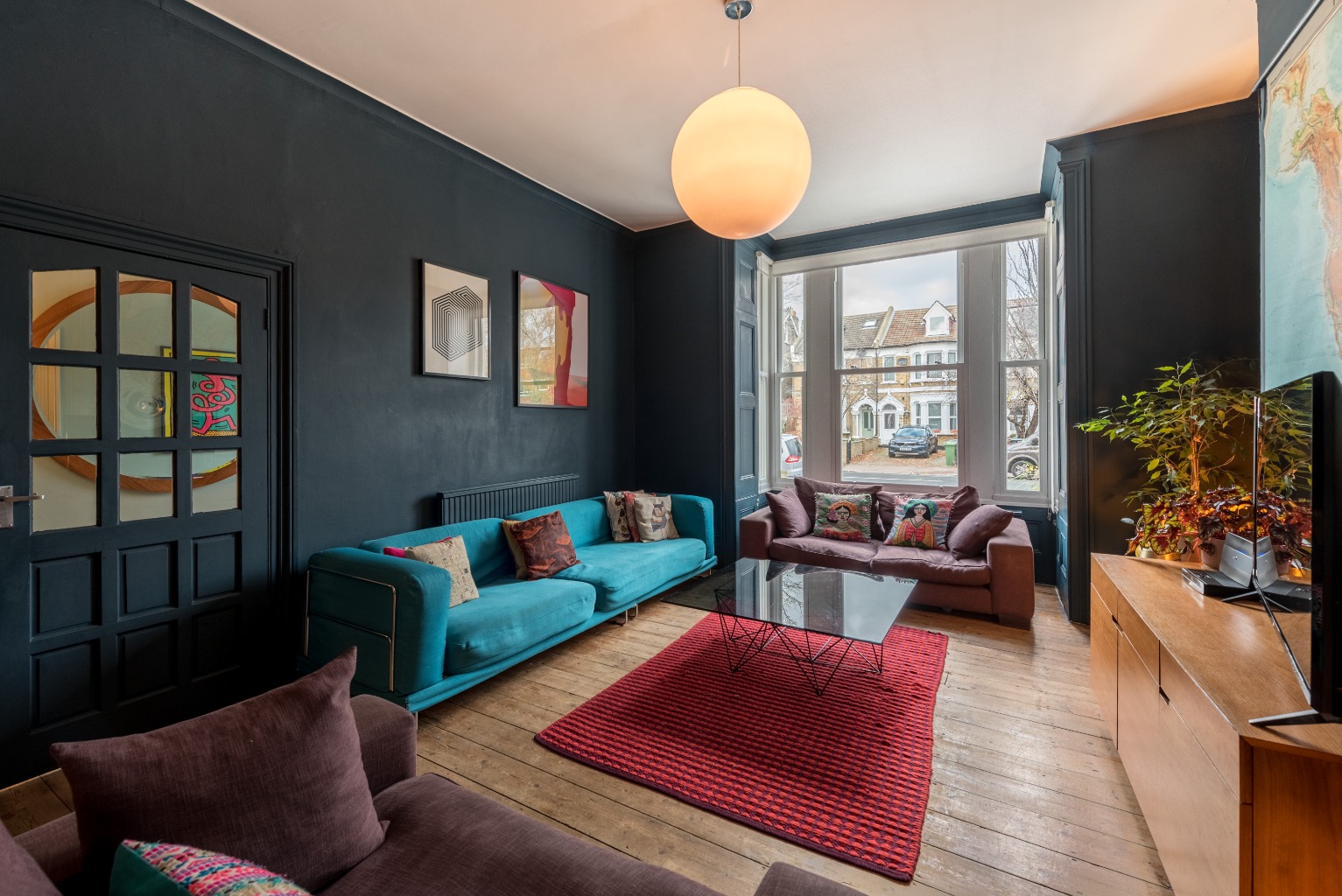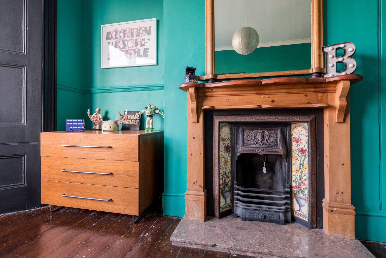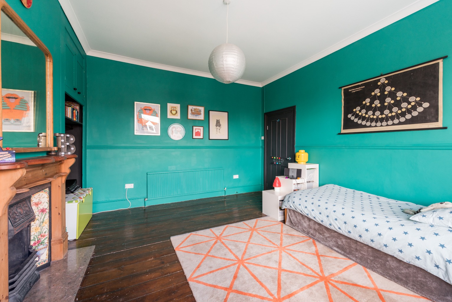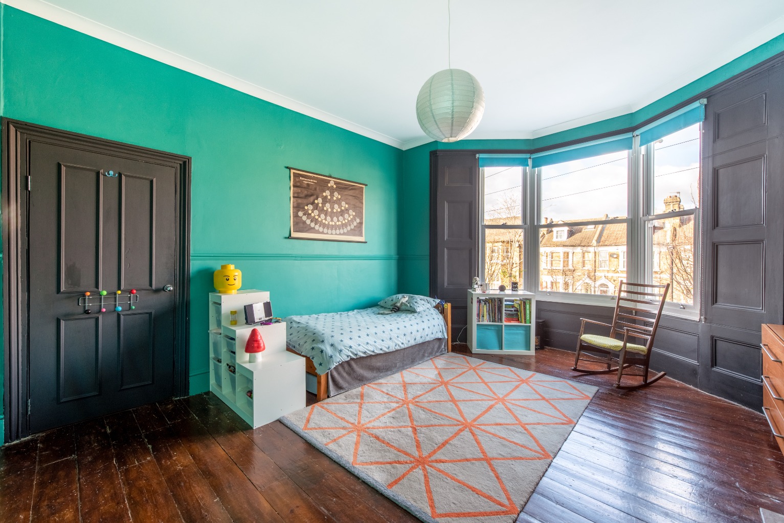 Directly next door, the two main features of this large front-aspect bedroom are the huge bay windows and the stunning original fireplace. The window dominates the front wall and provides masses of natural light, and the original cast iron fireplace with ceramic inserts and wooden surround gives the room an air of class and comfort. The walls are painted a striking teal colour and in an expert display of colour blocking, the window surrounds are a dark grey to ensure that the brighter colour remains the star of the show while being balanced to perfection. The dark coloured exposed wooden floorboards give this room quite the finish.