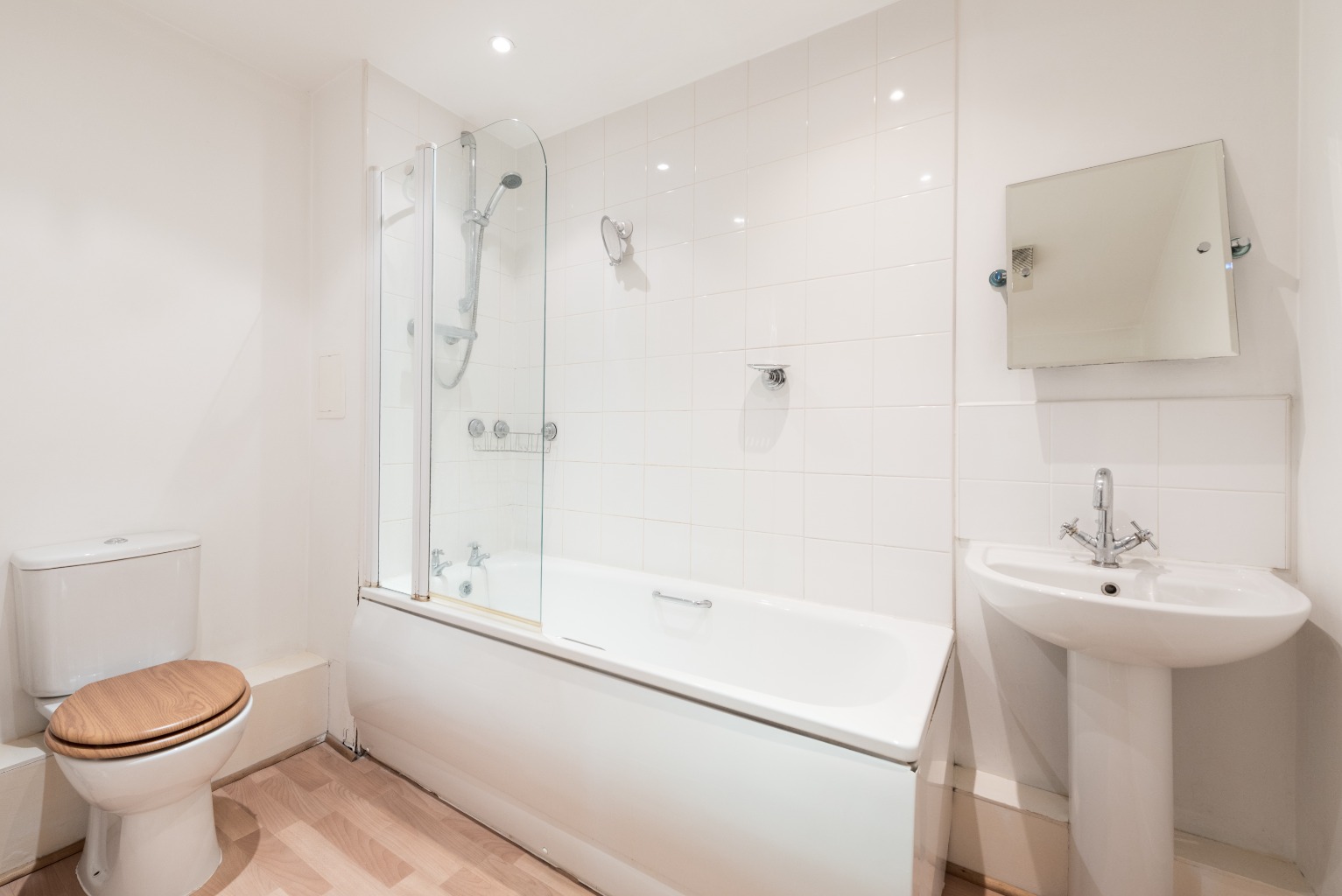 The first door on the right after the cupboard is the bathroom. It's fitted with a white suite; an end-fill bath with overhead shower, a fitted toilet with hidden cistern and attractive oval shaped sink. The areas round the sink, bath and shower area are tiled with large white tiles giving the room a clean, smart spa-like effect and there's a mirrored cabinet above the sink to keep your toiletries tidied away. The wooden flooring finishes the look giving the bathroom a modern Scandinavian feel – the ideal space to freshen up or unwind.