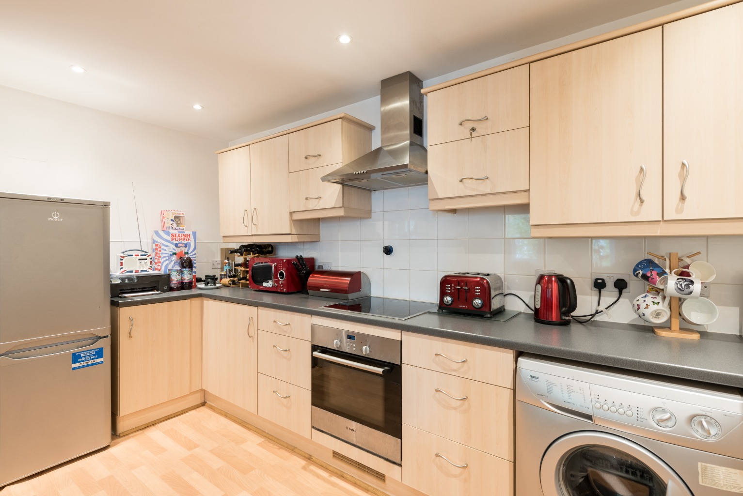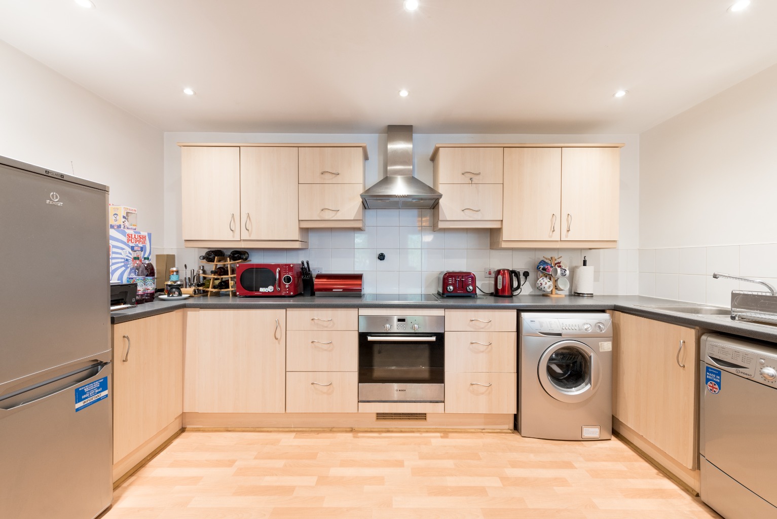 The kitchen area is streamlined, tidy, and clean, with light coloured wooden fronted wall and base units, complemented by the black granite-look worktops. There's ample storage space, a built-in electric hob and oven, and room for your fridge/freezer, washing machine and dishwasher. The wooden flooring gives it a smart, sleek finish and the neutral tiling and décor will allow you to brighten the area up to your own tastes with some clever colour-accents.