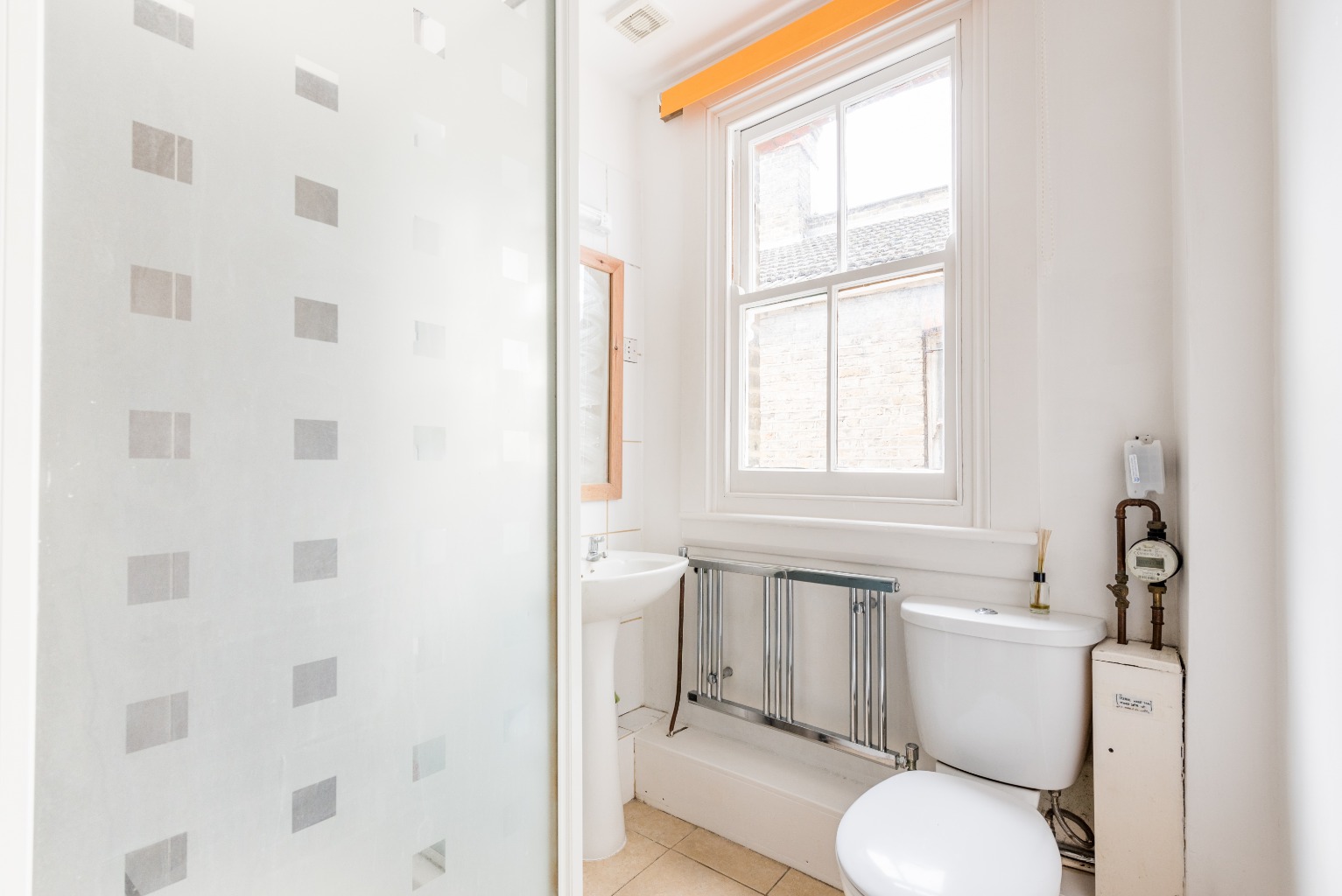 Across the hallway, you'll see another door, which is your family bathroom. There's no bath here but instead a lovely, large standalone shower cubicle, plus a D shaped sink, a heated towel rail and a WC. There's a large sash window providing lots of natural light, and you'll note the continuation of the same tiles from the kitchen.