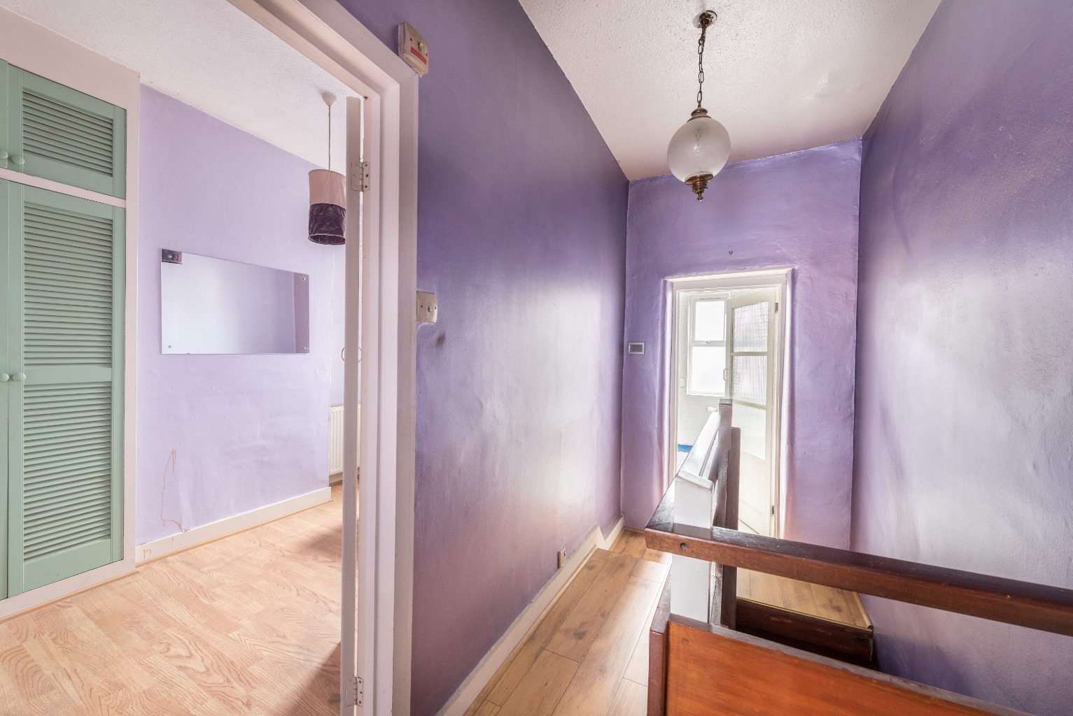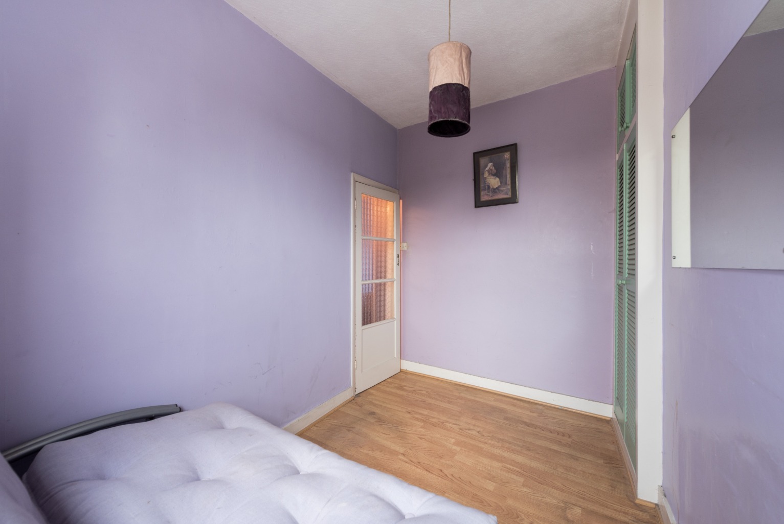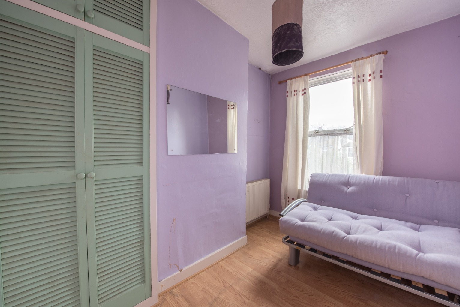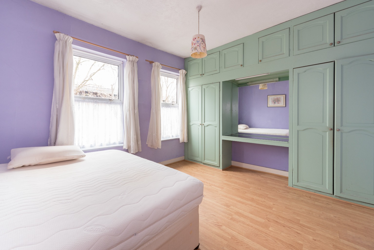 Now to the master bedroom: an impressive space stretching across the entire width of the front aspect of the property. There's an attractive set of fitted wardrobes with a built-in dresser, plenty of room for a large double bed and two large windows bathing the room in lovely natural light. As with all the upstairs rooms with the exception of the bathroom, the walls are painted in a lilac colour and - like the living area downstairs - the plasterwork would benefit from some attention, followed by a fresh lick of paint to refresh things. The flooring upstairs is all newly fitted, wooden-look tiles, providing a great base from which to build your own colour scheme and claim the space as your own.
