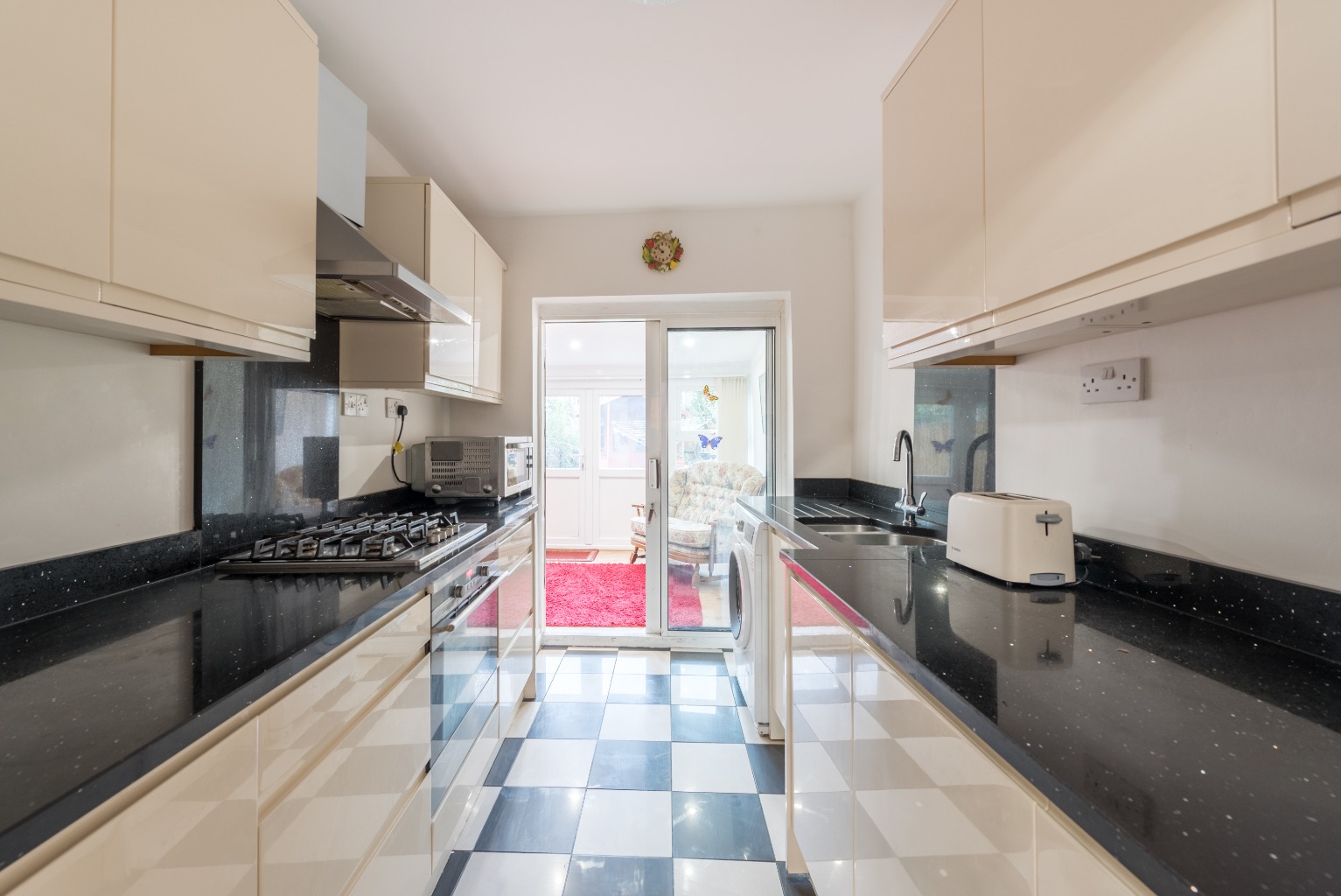The galley-style kitchen is a simple but well designed space, with black marble look worktops and a selection of white base and wall units for all your crocks, pots, pans and ingredients and its economical use of space perfectly combines simplicity and functionality. There's a fitted gas hob and oven with room for a washing machine and fridge freezer, and the flooring is tiled in a black and white chessboard style, the ideal complement to the rest of the space.