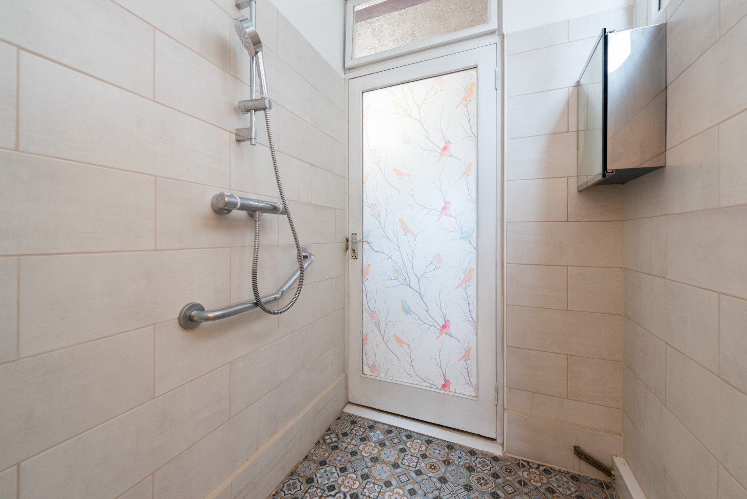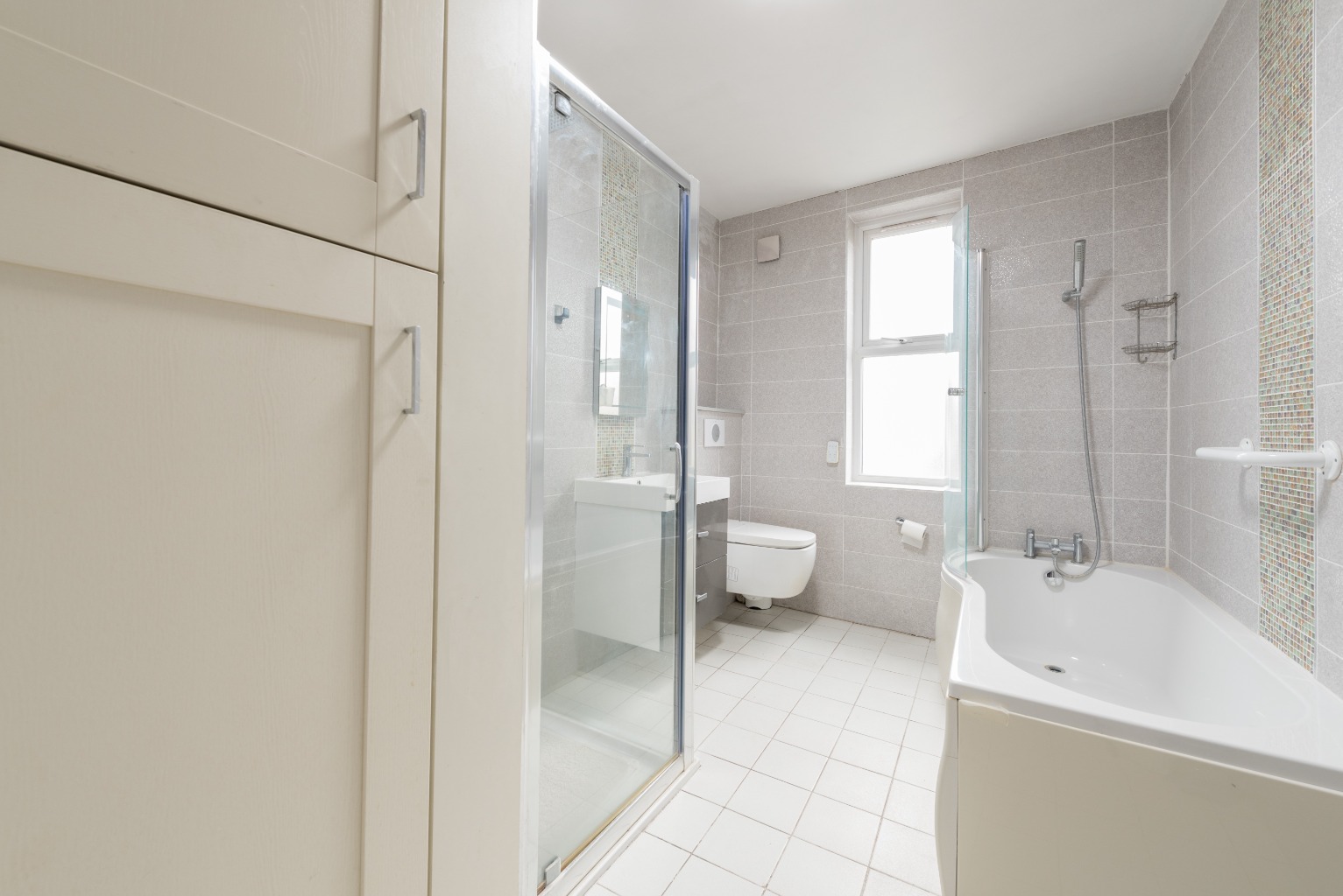 As you head up the floating staircase you'll find a small landing with a retro, 60's style wooden railing, and directly ahead of you, you'll see the newly fitted family bathroom. It's tiled floor-to-ceiling with large, grey textured tiles and there's a stylish mosaic design around the bath and shower area. Well designed from a functionality perspective, it's contemporary and sleek, with a suite consisting of square shaped shallow sink, toilet with hidden cistern and an end-fill bath complete with overhead shower unit. There's also a separate shower cubicle, a heated towel rail and a Valiant boiler in the cupboard you'll see just as you enter the bathroom.