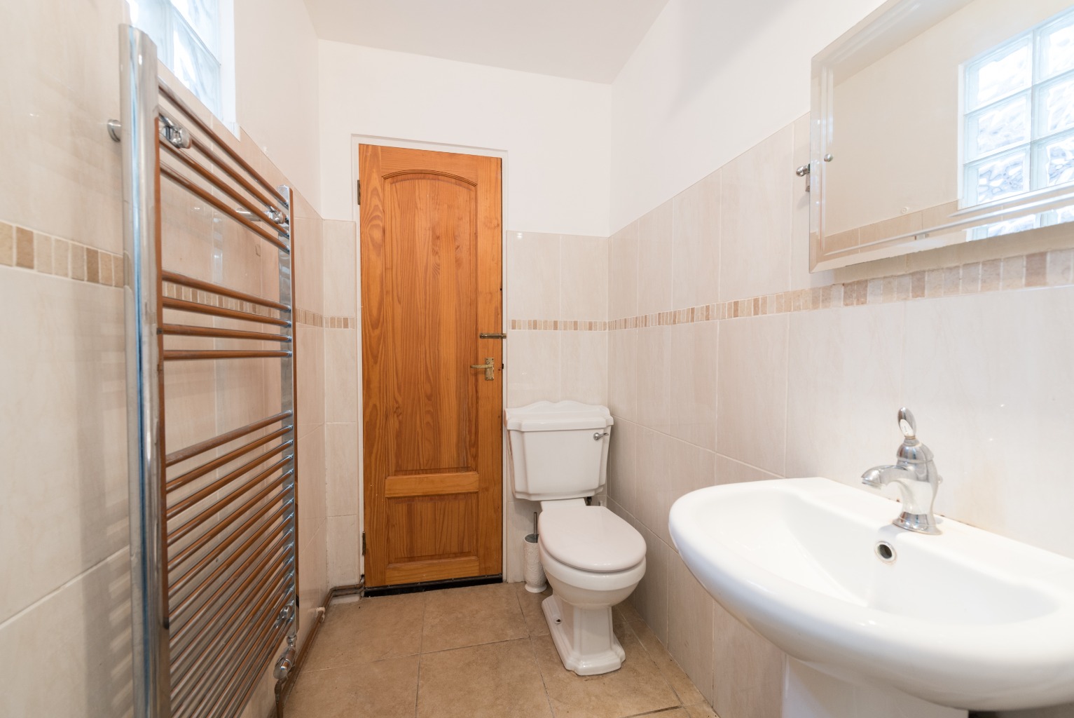 Heading back into and through the conservatory, there's another door which leads to a downstairs toilet and wet room, built with convenience, safety and ease-of-use in mind. The walls in both the toilet area and the wet room are tiled floor-to-ceiling, with the wet room floor tiled in an ornate mosaic style, and the toilet area in a simpler, large beige tile. There's a glass door separating the two rooms, a heated towel rail in the toilet area and a frosted glass window providing natural light. There's an adjoining door to the wet room through the second reception too, giving you access from the conservatory or living area – a super handy addition to this surprisingly large two bed property.