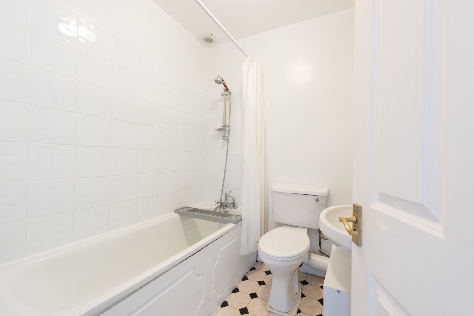 The bathroom has a white three-piece suite, comprising of large basin, WC and panelled bath with shower attachment. There’s full height white tiling around the bath and a square and diamond patterned vinyl floor.
