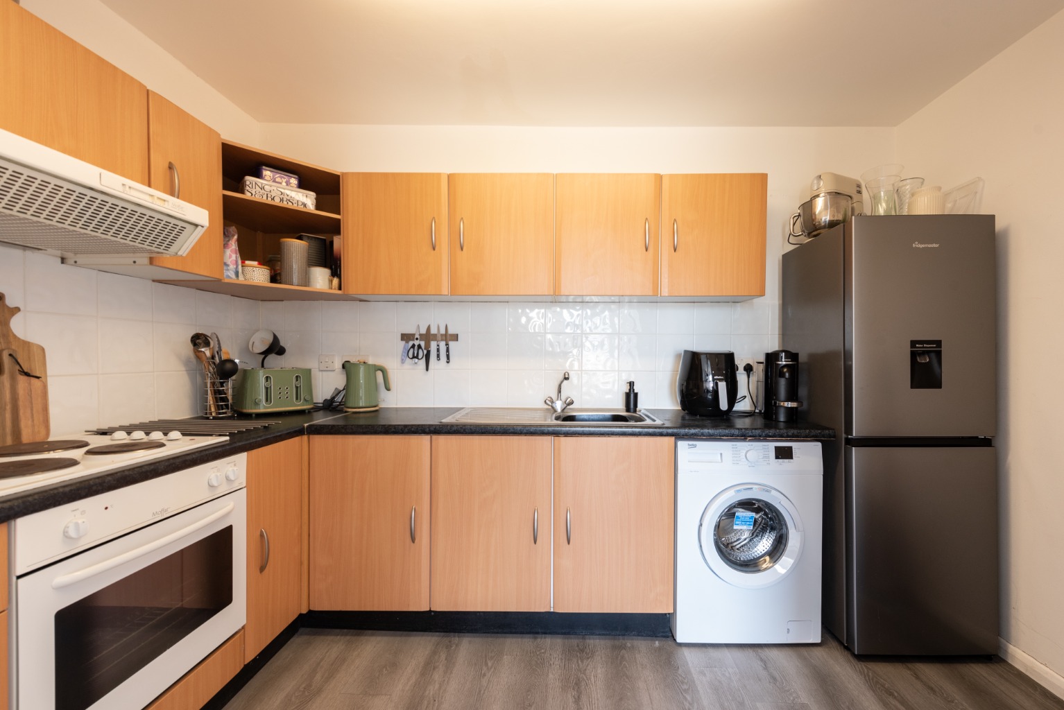 Entering the surprisingly spacious kitchen, there’s a large selection of beech laminate wall and base cabinets and black/grey granite-effect work surfaces. Black kick-boards are the perfect complement to the modern grey flooring, which flows through from the rest of the property. There’s a built-in oven with electric hob and extractor, and space for a fridge-freezer and a washing machine.