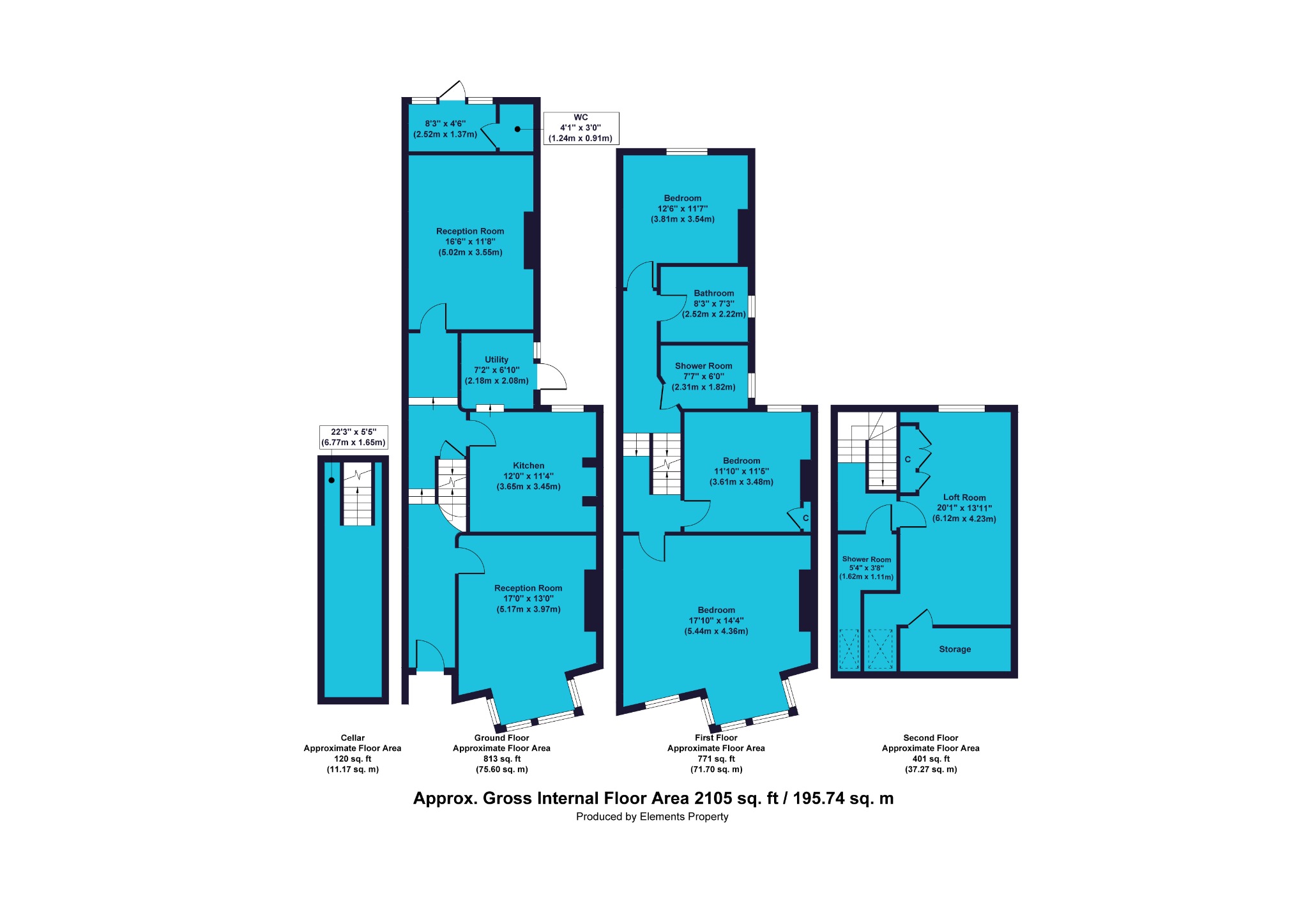 Let’s return through the ground floor to the hallway and up the stairs to the large split level landing which includes the cleverly integrated stairs to the second floor loft conversion. The landing continues the theme of the hallway with stripped floorboards and wood trim, along with duck egg blue walls.