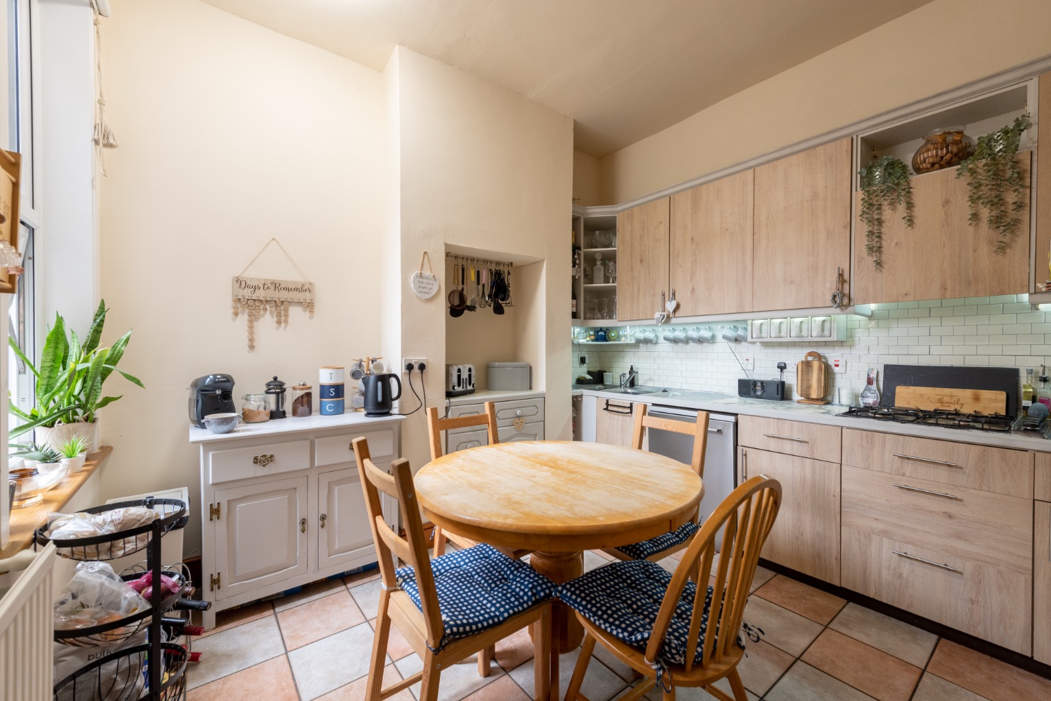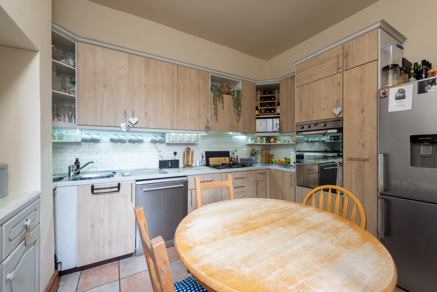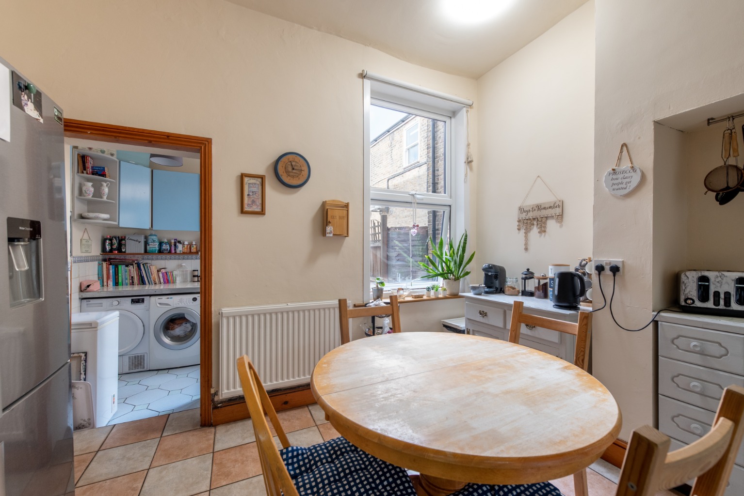 Back into the hallway and past the staircase, to the right you’ll find access to the useful cellar storage area, before coming to the next door which leads into the large kitchen and overlooks the side return area of the garden. There are oak-effect base and wall cabinets and drawers, plus full-height storage units which incorporate an integrated double oven and larder. There’s space for a fridge freezer and the original fireplace has additional built-in storage with additional workspace above. There’s also a gas hob, a double stainless steel sink, plumbed-in space for a dishwasher and a large radiator. Floors are a checker-board pattern of stone effect tiles, with the walls painted in a complementary cream, and the room is large enough to accommodate a kitchen table for intimate family dining.