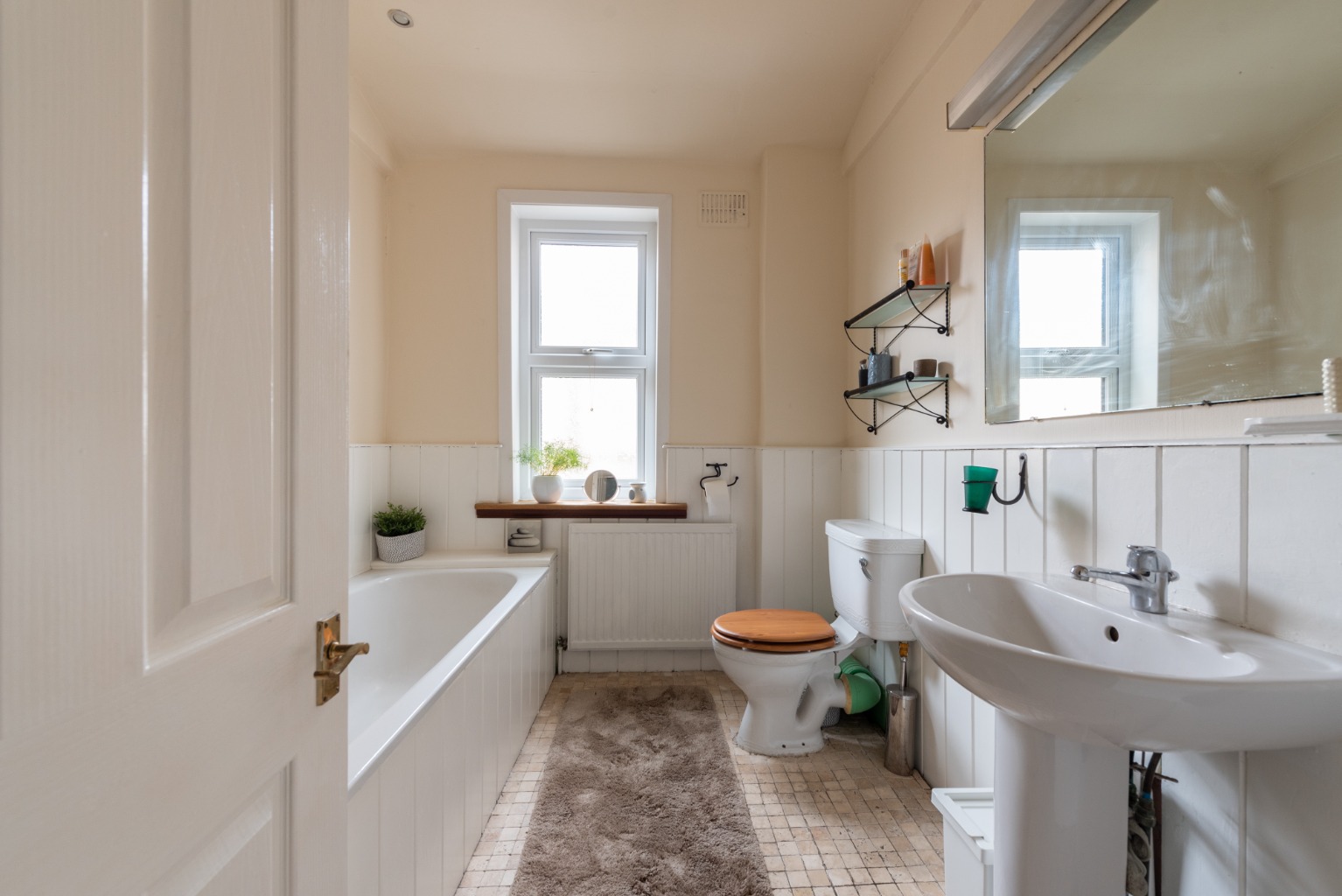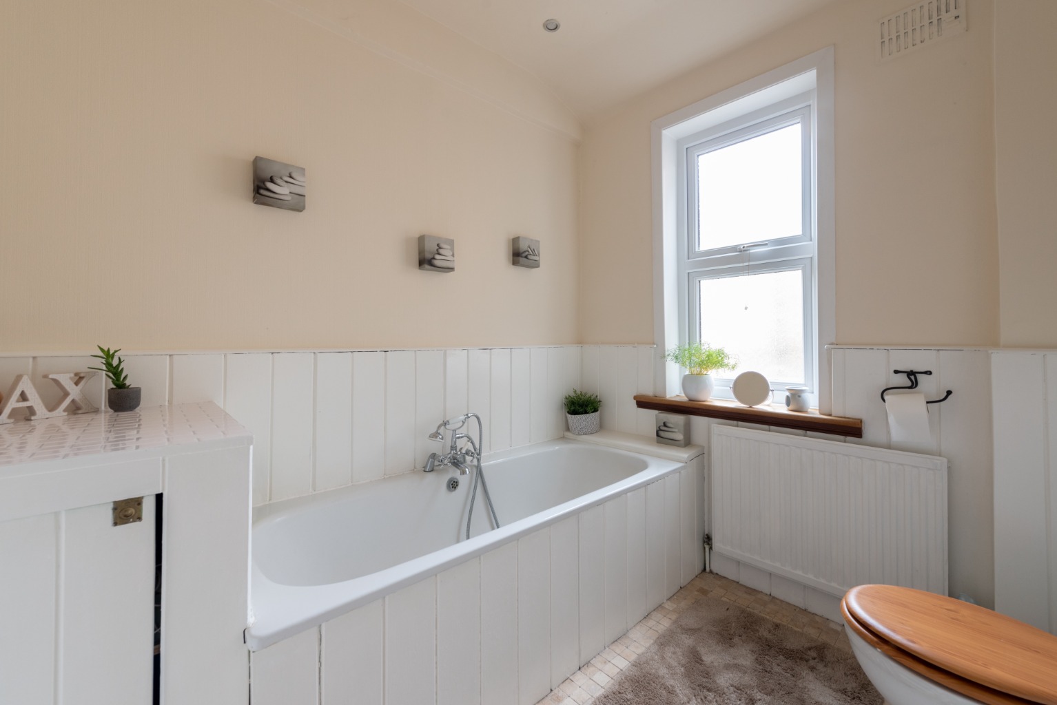 The next room along is the spacious and stylish main bathroom. White painted timber tongue and groove wainscotting adds a touch of traditional charm and is also used for the bath panel and to clad a built-in storage cupboard. There’s a white three piece bathroom suite comprising of a WC, large pedestal hand basin and bath with a mixer tap and shower attachment centrally mounted. The floor is an attractive mosaic stone effect tile, with walls in a complementary cream. There’s a large radiator, a frosted glass uPVC window and a large wall mounted mirror.
