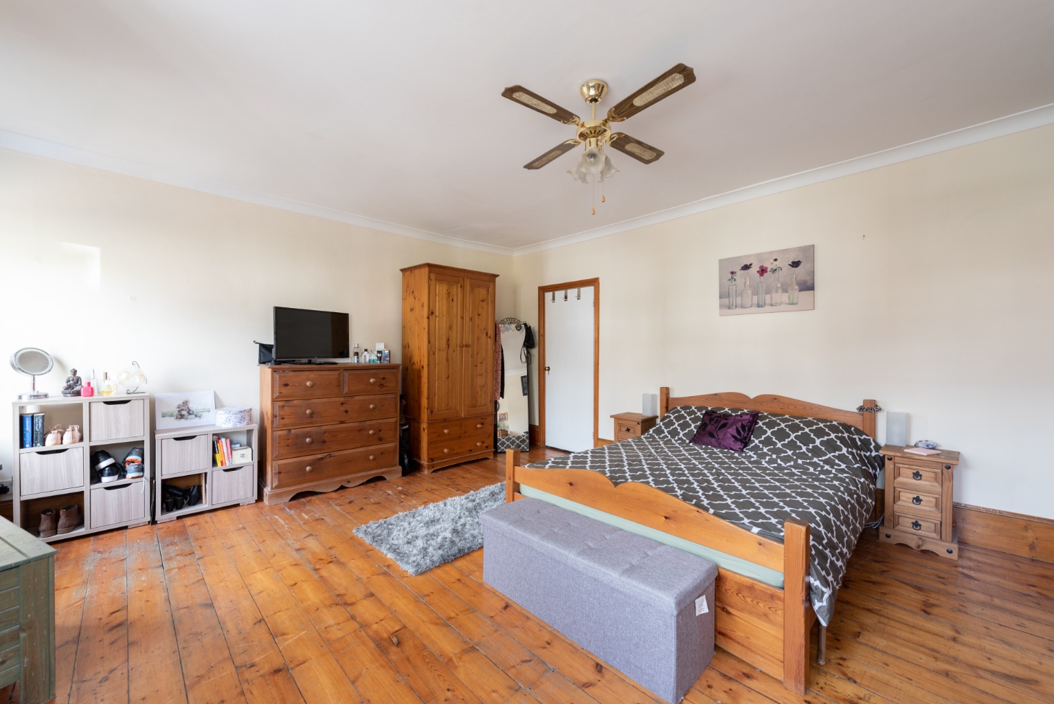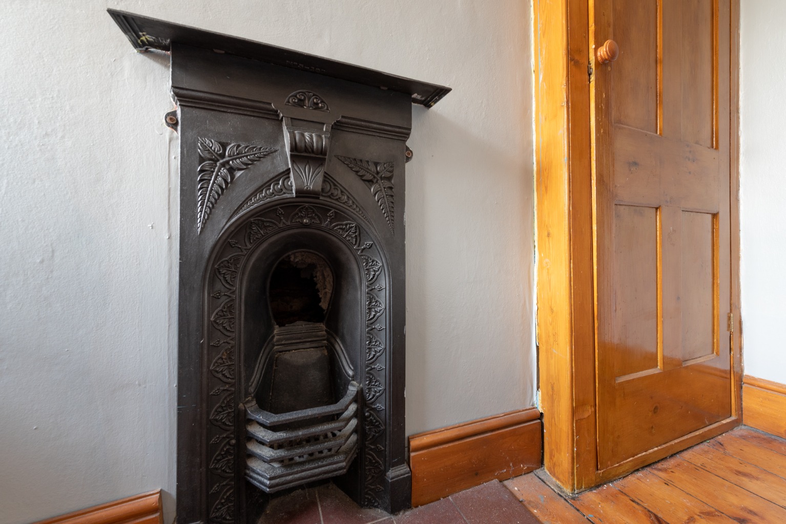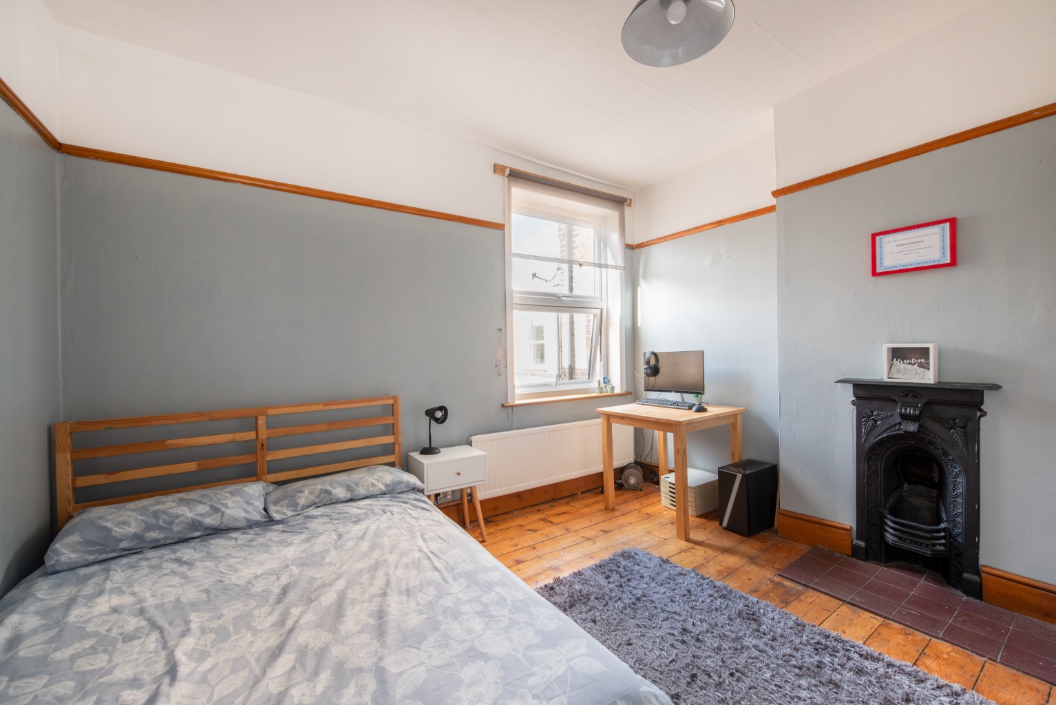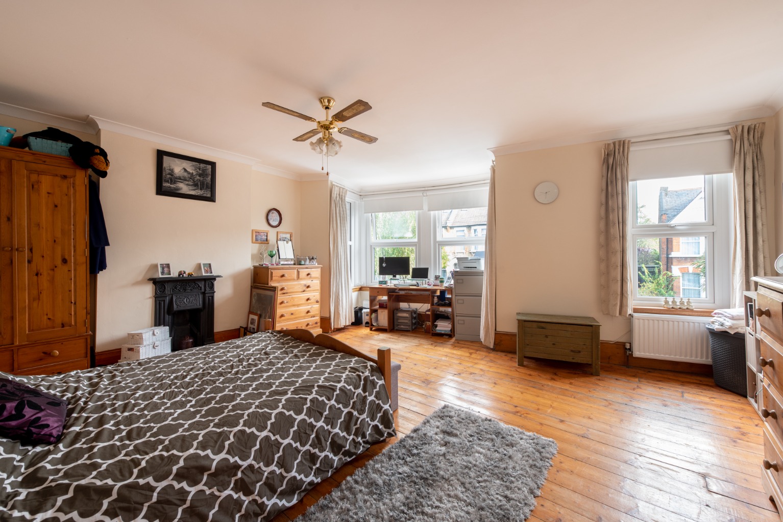 Up onto the second level of the landing now and the first door to the right takes us into another bedroom, which overlooks the side return garden. This is another well-proportioned double room and includes an original cast iron fireplace and built-in storage cupboard. Decoration and flooring duplicate the rear bedroom and once again, there’s a large radiator below the window to guarantee a comfortable night’s sleep in the colder months.