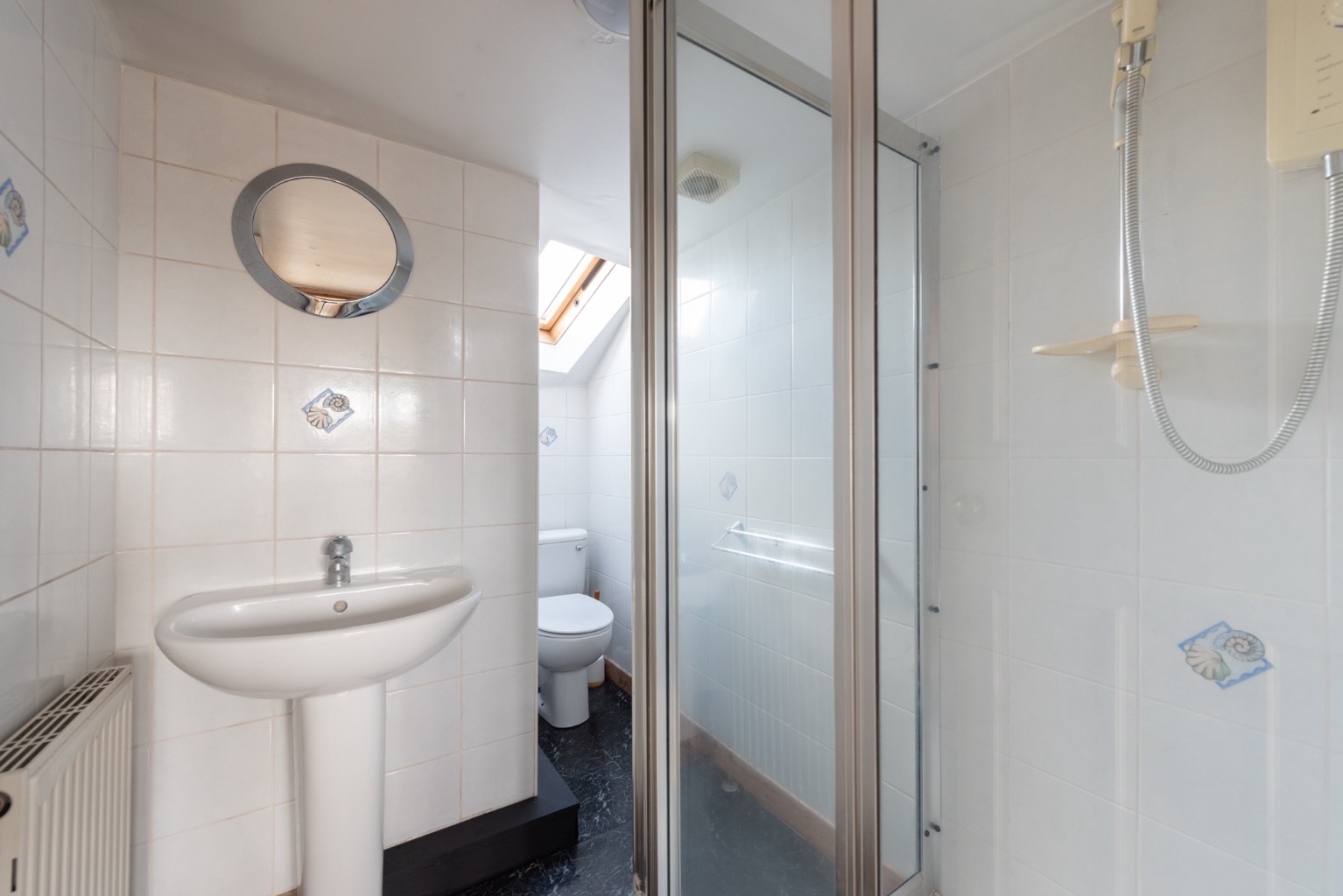 The first room on this landing is another shower room, which acts as an en-suite to the bedroom on this level. There’s a glass-panelled shower cubicle, a WC and a large pedestal hand basin. Natural light is provided by a roof window and the floor and walls are fully tiled.