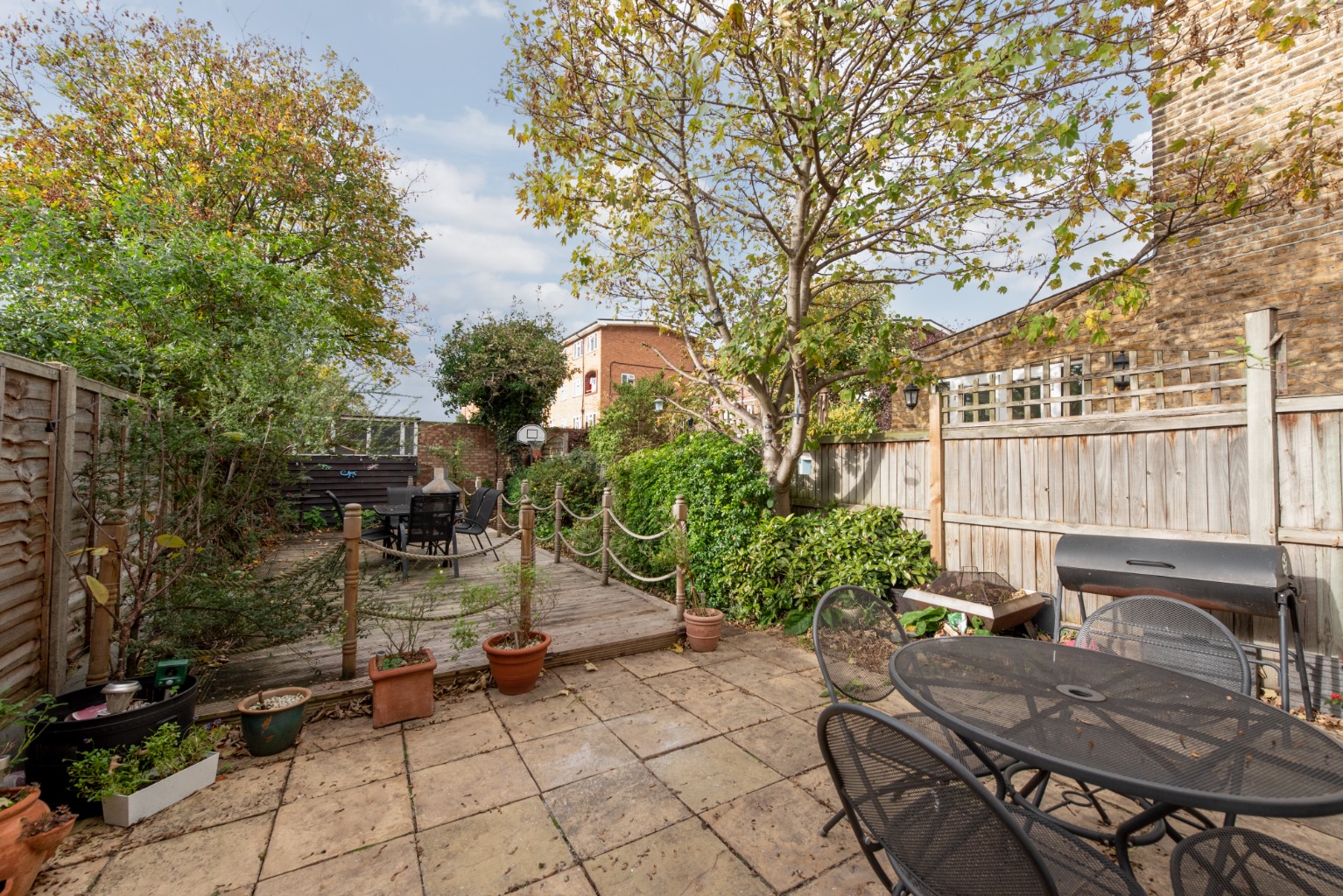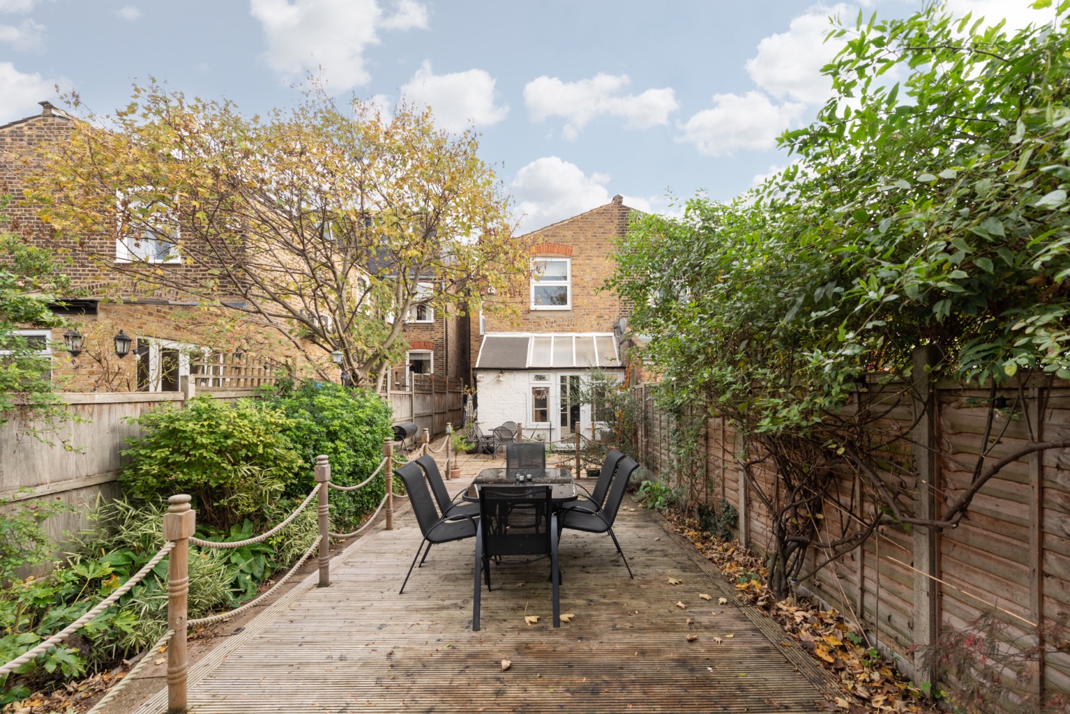 From the conservatory, let’s now explore the wonderful private rear garden. There’s a large, flagged terrace which extends to the side return area of the garden and also provides access to a pathway which leads to the front of the property. Beyond the terrace toward the rear of the garden is a substantial raised deck, next to which is a border with mature shrubs and trees. At the very rear of the garden is an additional area which also houses a potting shed.