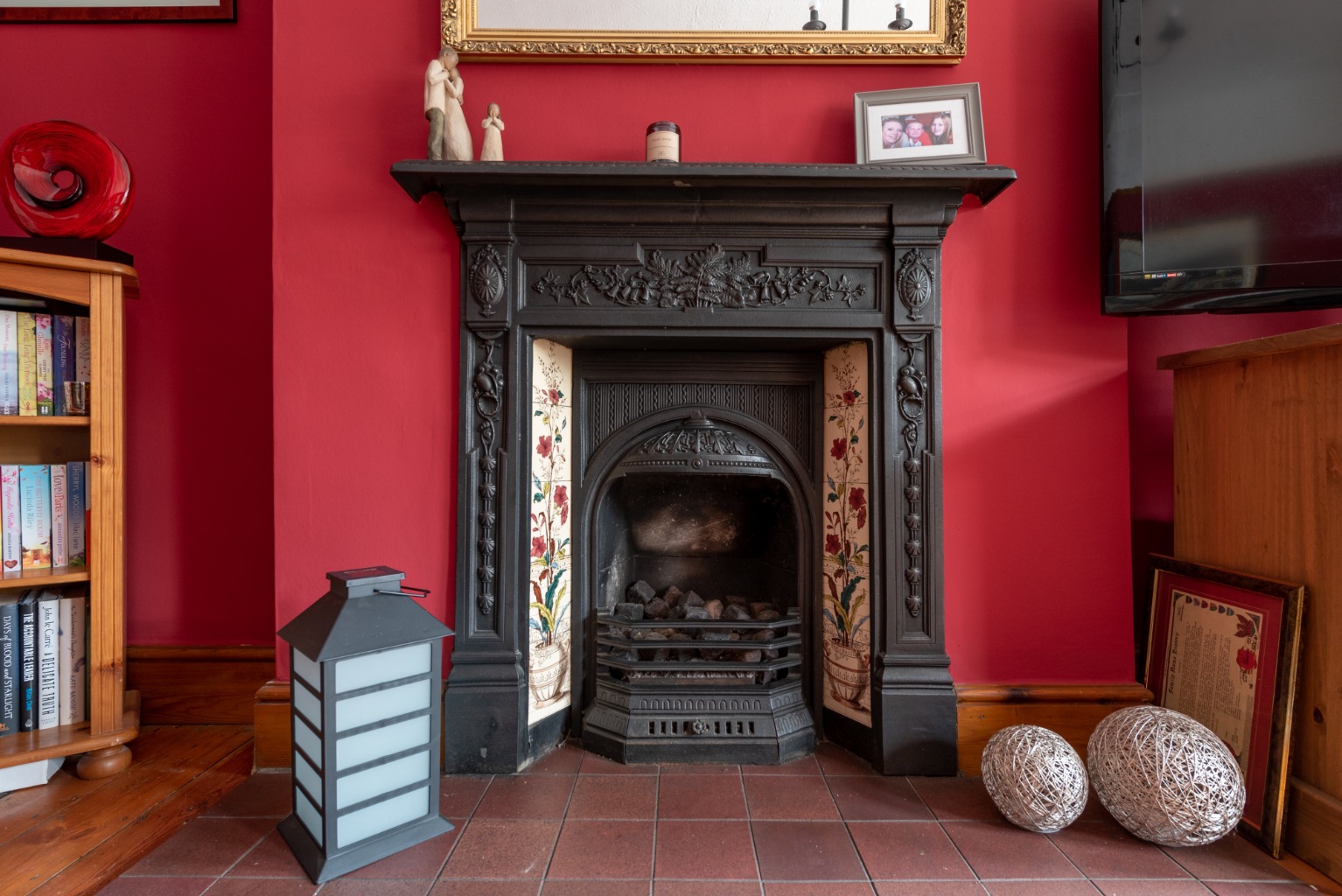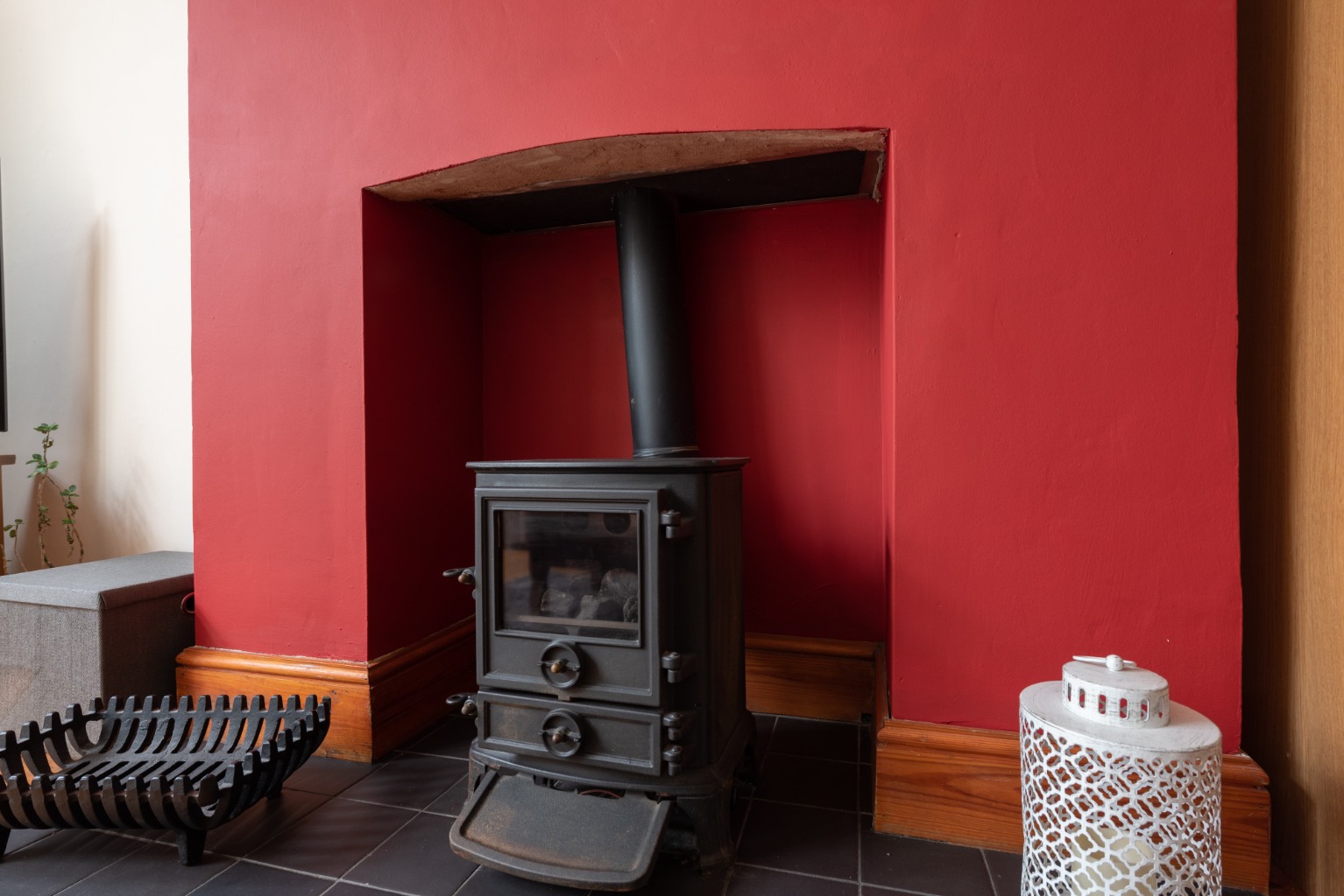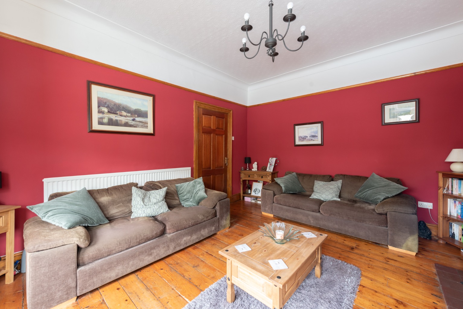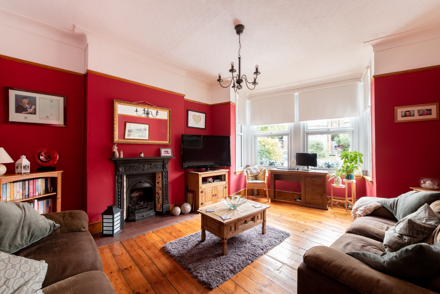 The first door to the right takes you into the wonderful main reception room. Benefitting from many original features and lit by natural light from the large bay window, this room has a real sense of grandeur. High ceilings with deep coving are accentuated by the original picture rail, which is painted white above and a classic deep crimson. The impressive cast iron fireplace and mantel, with ornate floral-patterned detail and original inset tiles provides a fabulous centre focus for the room. There are also original stripped floorboards and wood trim to match. The deep bay window which follows the offset angle of the property’s façade provides a quirky feel to the room and could accommodate a large sofa or a pair of comfortable armchairs, while still leaving plenty of space in the room for more seating, bookcases and an entertainment unit. This is a lovely room for cosy evenings in front of the fire, or for entertaining a group of family and friends.