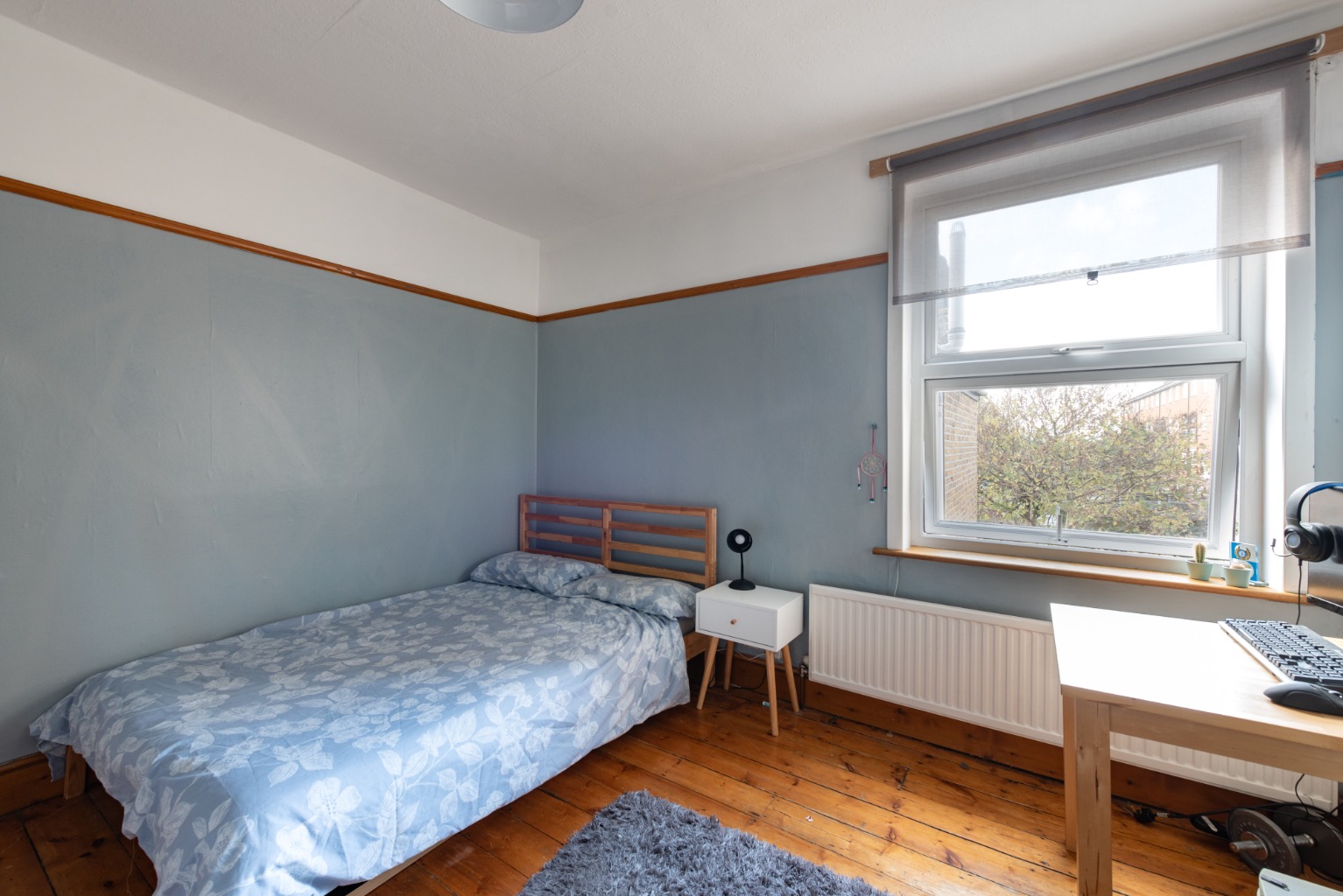 The final room on this level of the landing is the rear bedroom overlooking the garden. As with all rooms in this property, it’s a very good-sized space which would happily accommodate a double bed, bedside cabinets, wardrobe and additional storage furniture. Once again floors are stripped boards and decoration is light blue walls up to the picture rail and white above. There’s also a radiator below the large uPVC window.