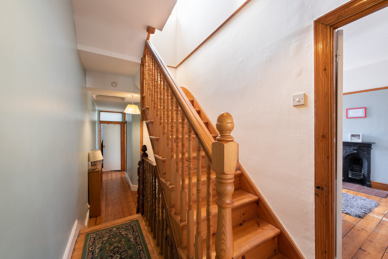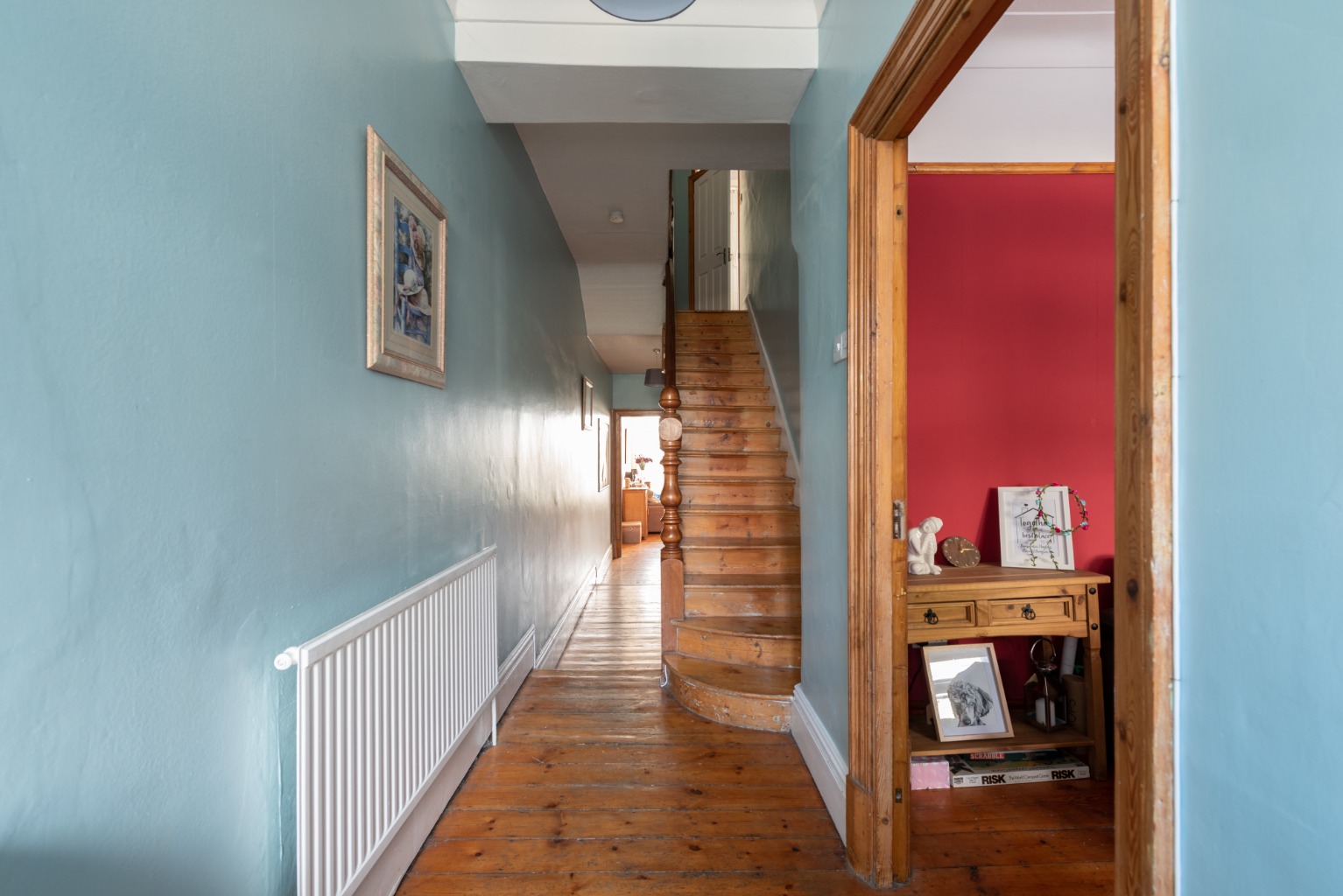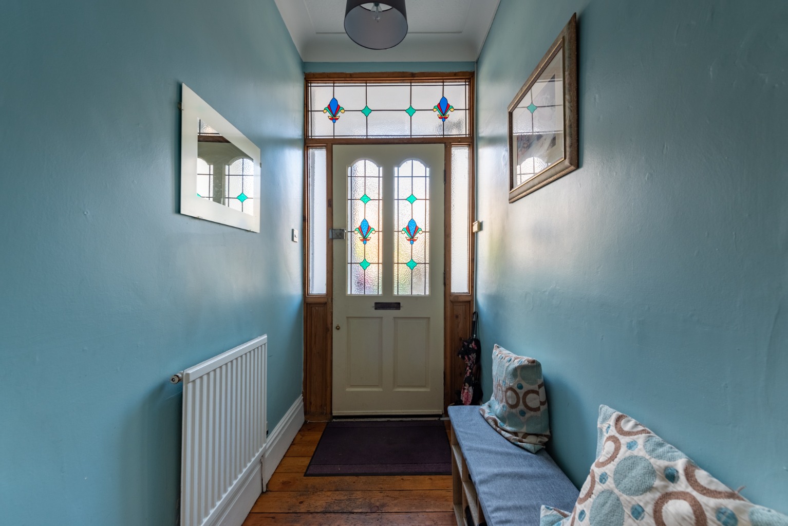 Through the dark green timber door with its eye-catching stained glass panels, you’ll find yourself in the spacious hallway which has abundant natural light from the front door, glazed side panels and large transom window above. Original stripped floorboards are complemented by original woodwork to the staircase, door surrounds and doors. Walls are decorated in a cheery duck egg blue and there’s plenty of space for hanging coats and storing shoes. There are also two radiators to guarantee a warm welcome for visitors.