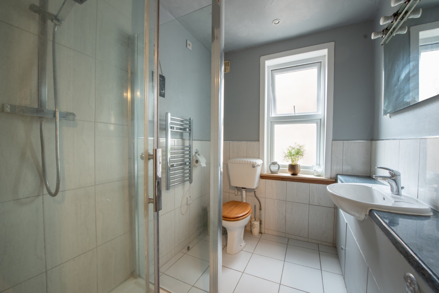 The first room at the top of the stairs is the shower room. A very useful addition in a busy family home, there’s a large glass-panelled shower enclosure, a WC and hand basin set into a large vanity unit with storage and deep shelf above. The floor and walls, again to half height, are tiled in light grey, with a modern darker grey above. There’s natural light from a large window and a combined towel rail and radiator.