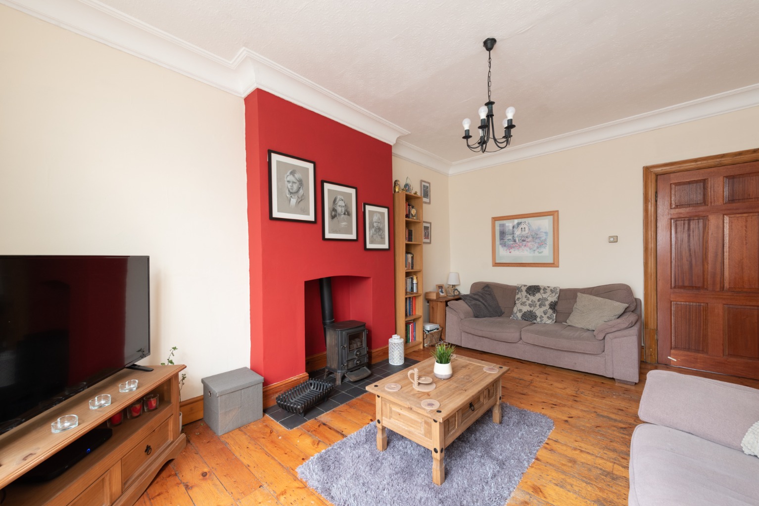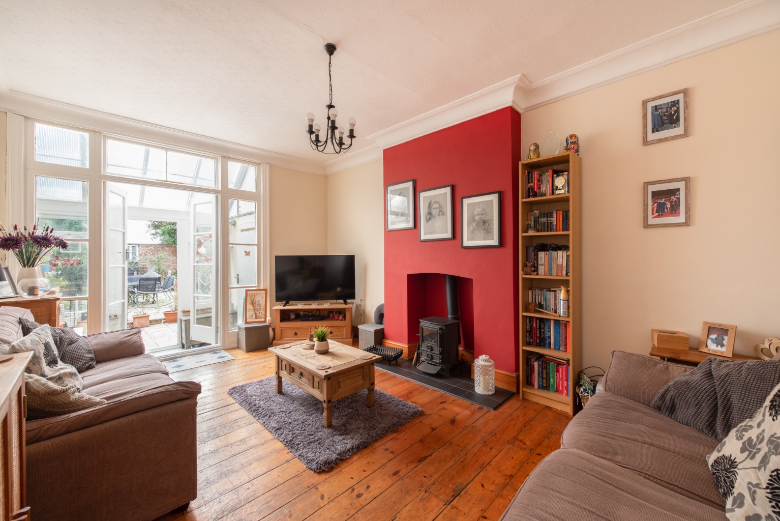 We’ll return to the hall now and the final door, at the end, takes us into the second reception room. Currently used as an additional sitting room, this could equally serve as a generous dining room. There’s original coving, stripped floorboards and a gas fire set into the chimney breast and sat on the original tiled hearth, with décor primarily in cream and the chimney breast highlighted in a deep crimson to create a focal point for the room. The room is big enough to accommodate a large dining table and dresser or sideboard, or as is the case currently, has space for comfortable seating, a TV unit and additional storage. Looking out towards the garden is a pair of French windows with matching side panels and transoms which bring natural light into the room via the attached conservatory.