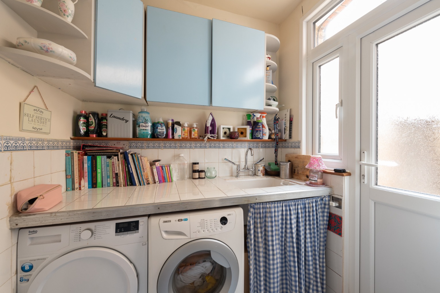 Accessed from the kitchen is a large utility room which accommodates a washing machine, a tumble dryer and a large sink, as well as offering plenty of storage and work space. A door leads to the rear garden, which we’ll explore later.