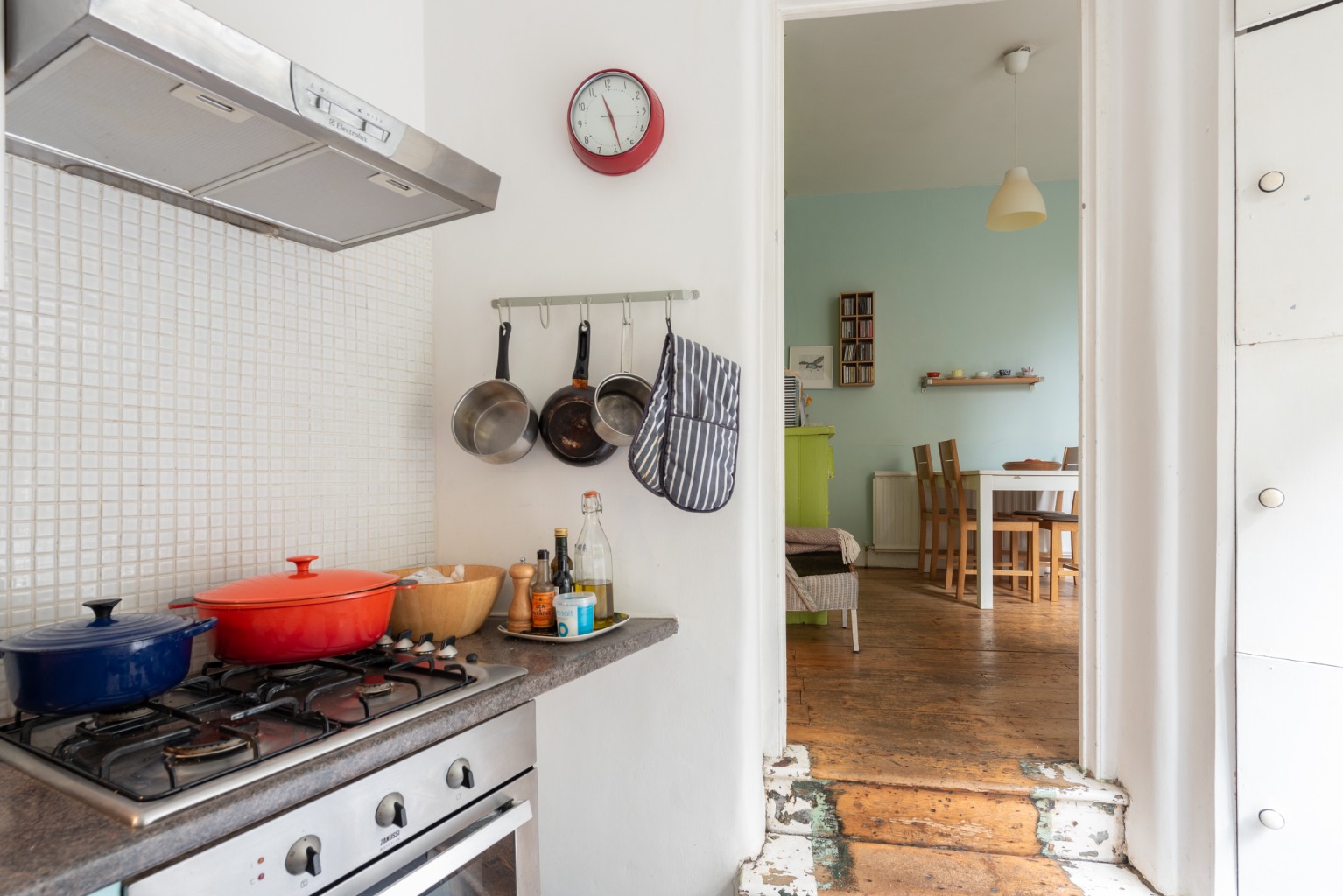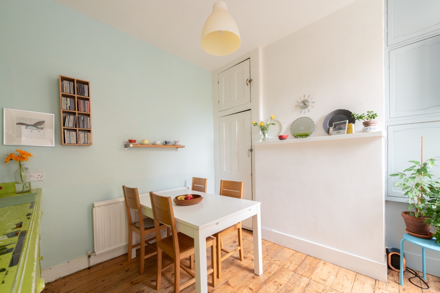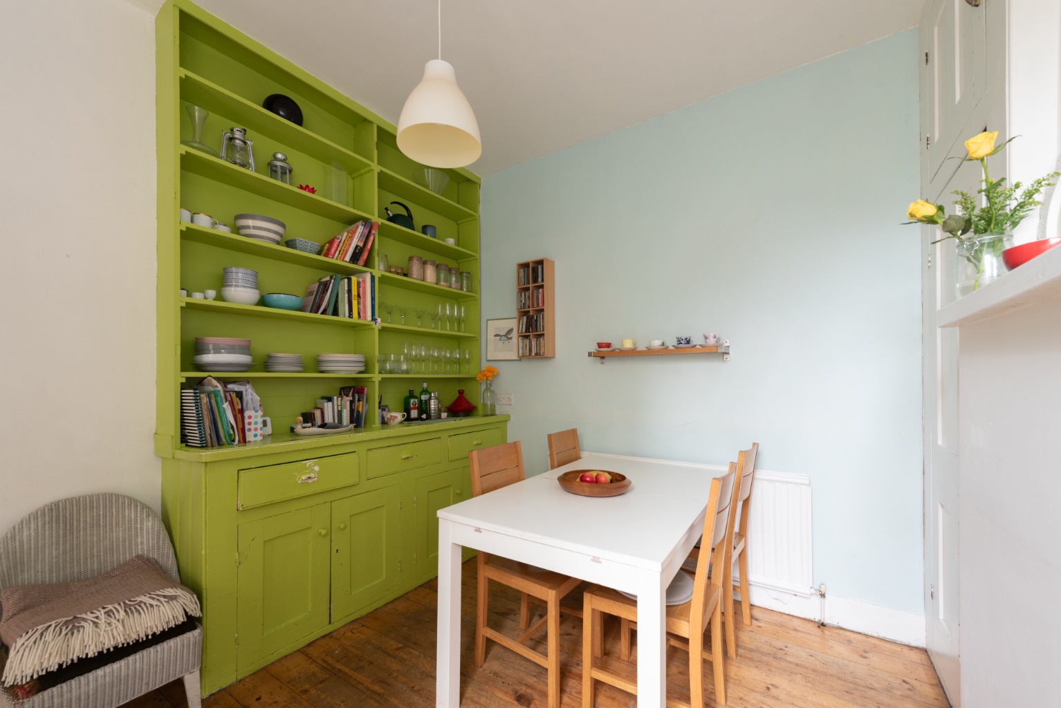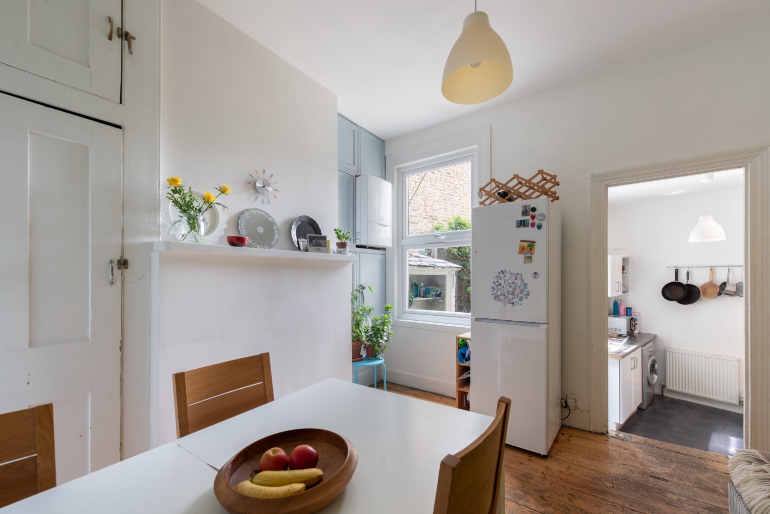 Back to the hallway now and past the staircase to the next room, on the left, which is the morning room - looking out to the side return of the rear garden. Once again, there are some attractive original features, including a built-in cupboard in one alcove and a spectacular integrated dresser which provides exceptional storage space. The gas combi boiler is also in this room and has been cleverly integrated into the second alcove with the use of some additional integrated storage. There are more of the original preserved floorboards, as well as a large radiator. This room makes a great family dining space, with its cosy feel and proximity to the kitchen.
