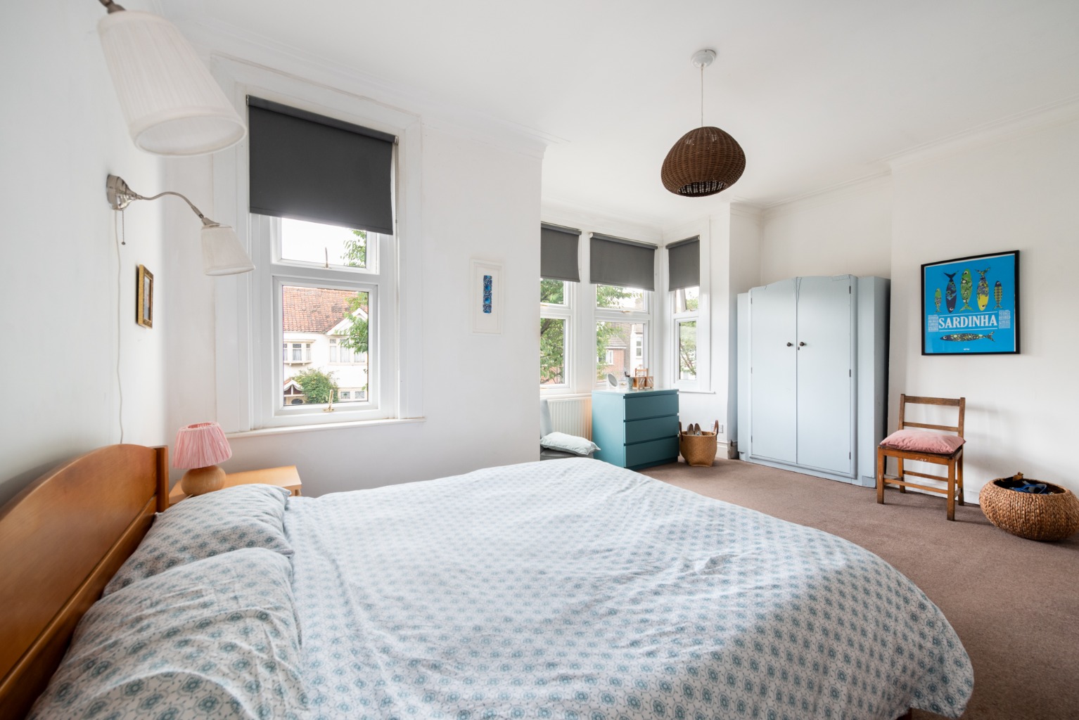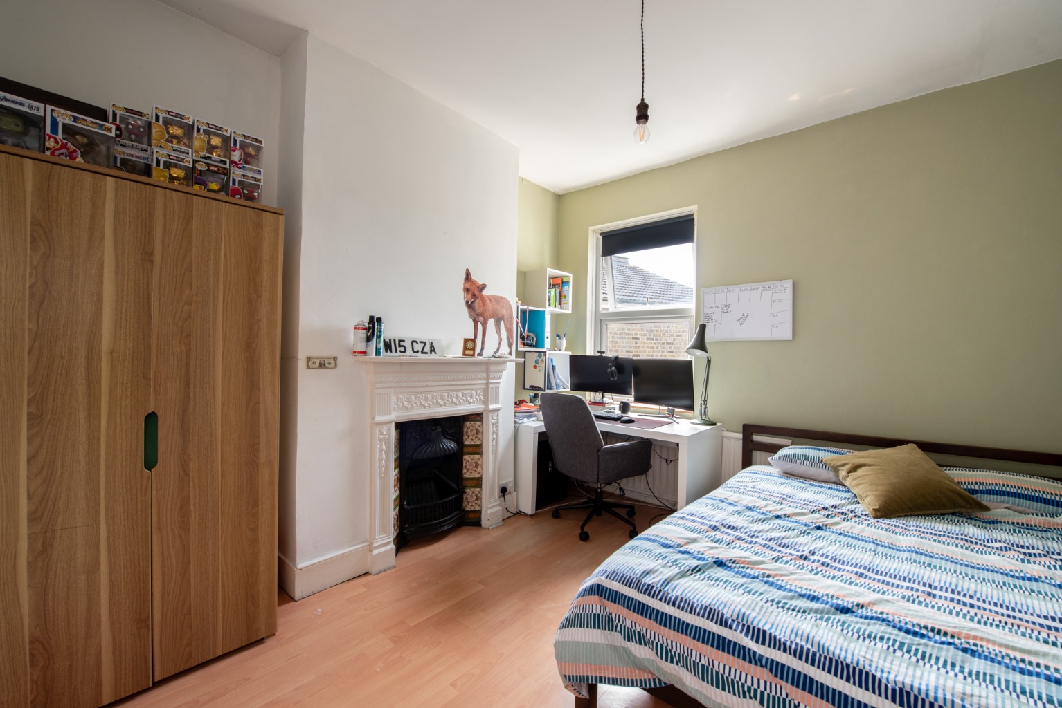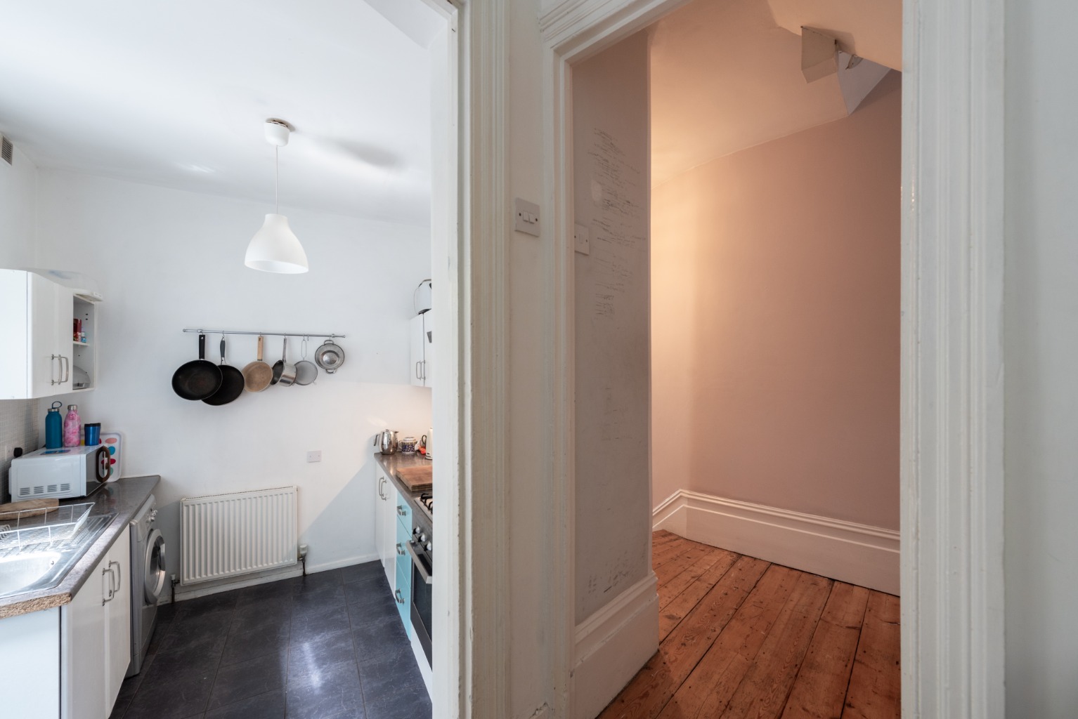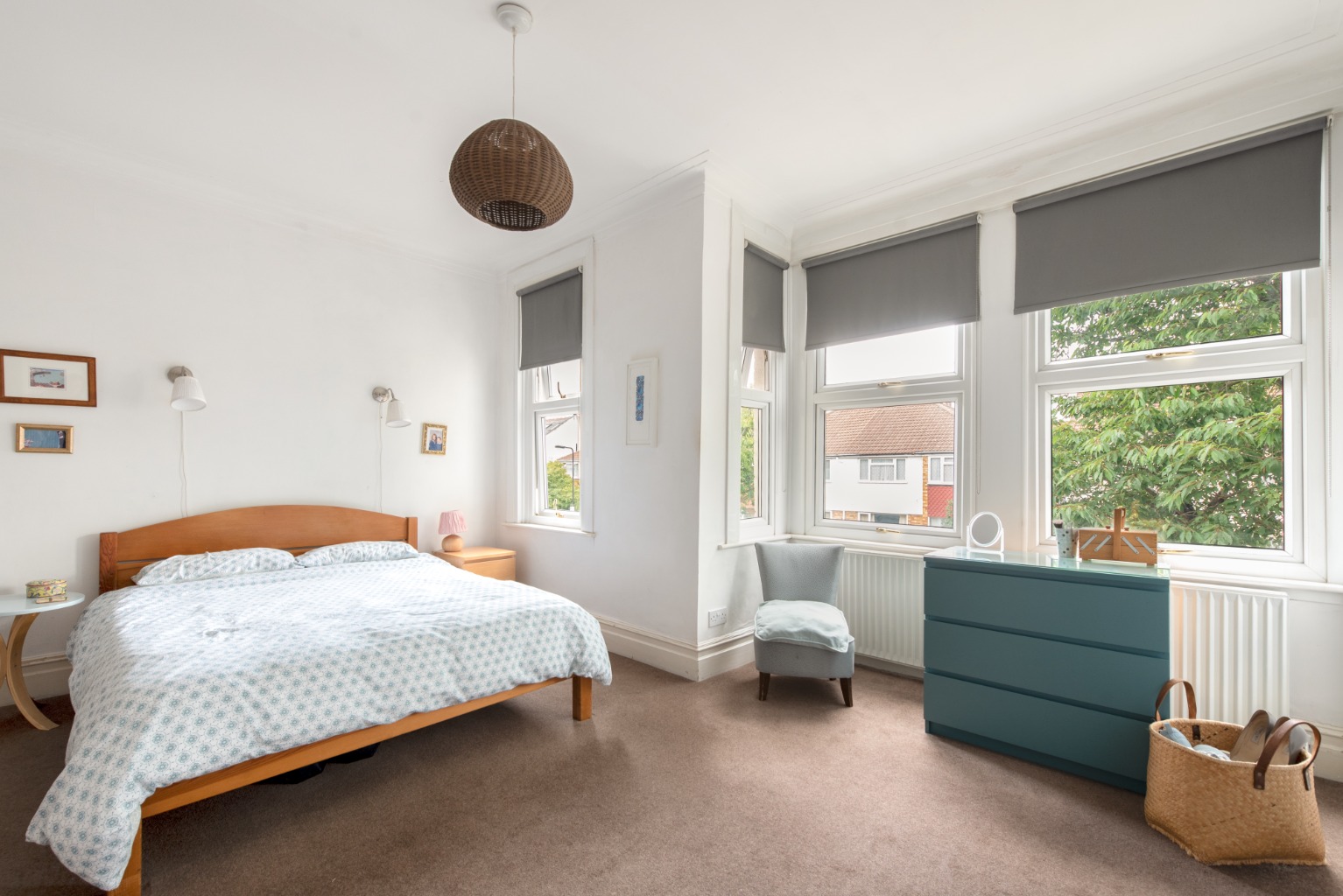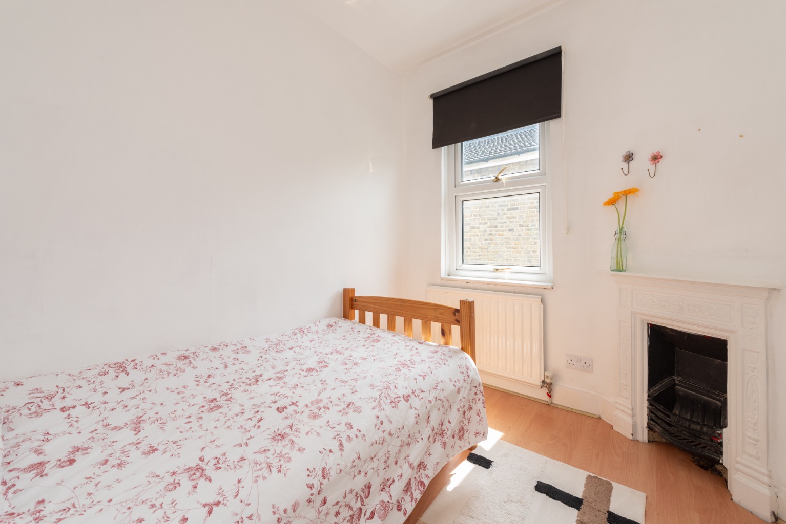 To the right is bedroom two, which is a generous double facing out towards the rear garden. There’s another attractive original fireplace, whose alcoves make perfect locations for wardrobes or other storage furniture. Walls are in a combination of white and a light sage green, with a beech effect timber laminate floor. The room will accommodate a large double bed and other storage furniture. There’s also a large radiator below the window.