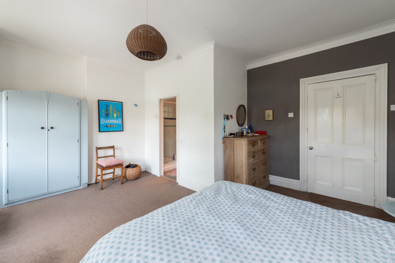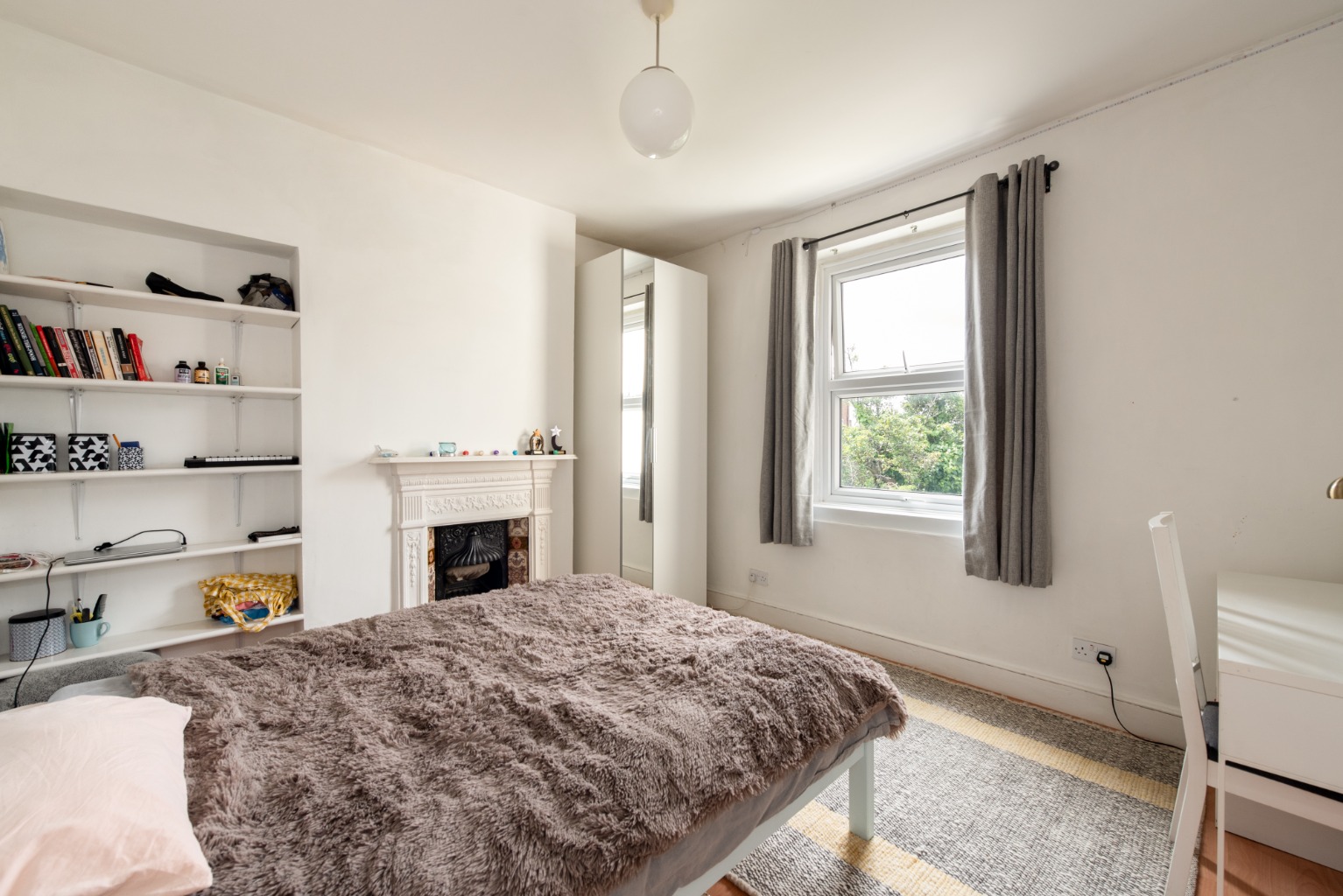 From the top of the stairs, we’ll start our exploration of the first floor by walking straight ahead to the furthest end of the landing, where we find bedroom three. This is a large double room which overlooks the rear garden and benefits from its southwest view with plenty of natural light through its large window. The original cast iron fireplace and alcoves add character and the chimney breast would suit a mirror above the mantlepiece. There’s room for a large double bed, bedside cabinets, wardrobes and additional storage furniture. Once again, decoration is simple with white walls and there’s a light timber laminate floor and a large radiator.