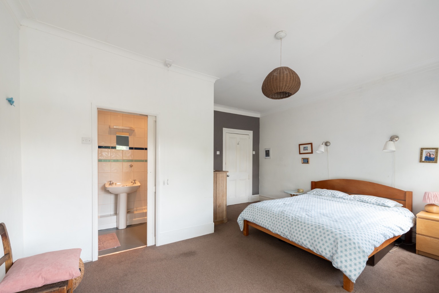 Back to the landing and on your right, you’ll find bedroom four. This is a single room which has a characterful original, cast iron fireplace set diagonally in one corner, providing a cosy feel to the space. Currently set up as a single bedroom, this would also make an excellent nursery or study. Decoration matches bedroom three and there’s a radiator below the window which faces the quiet side return of the garden.