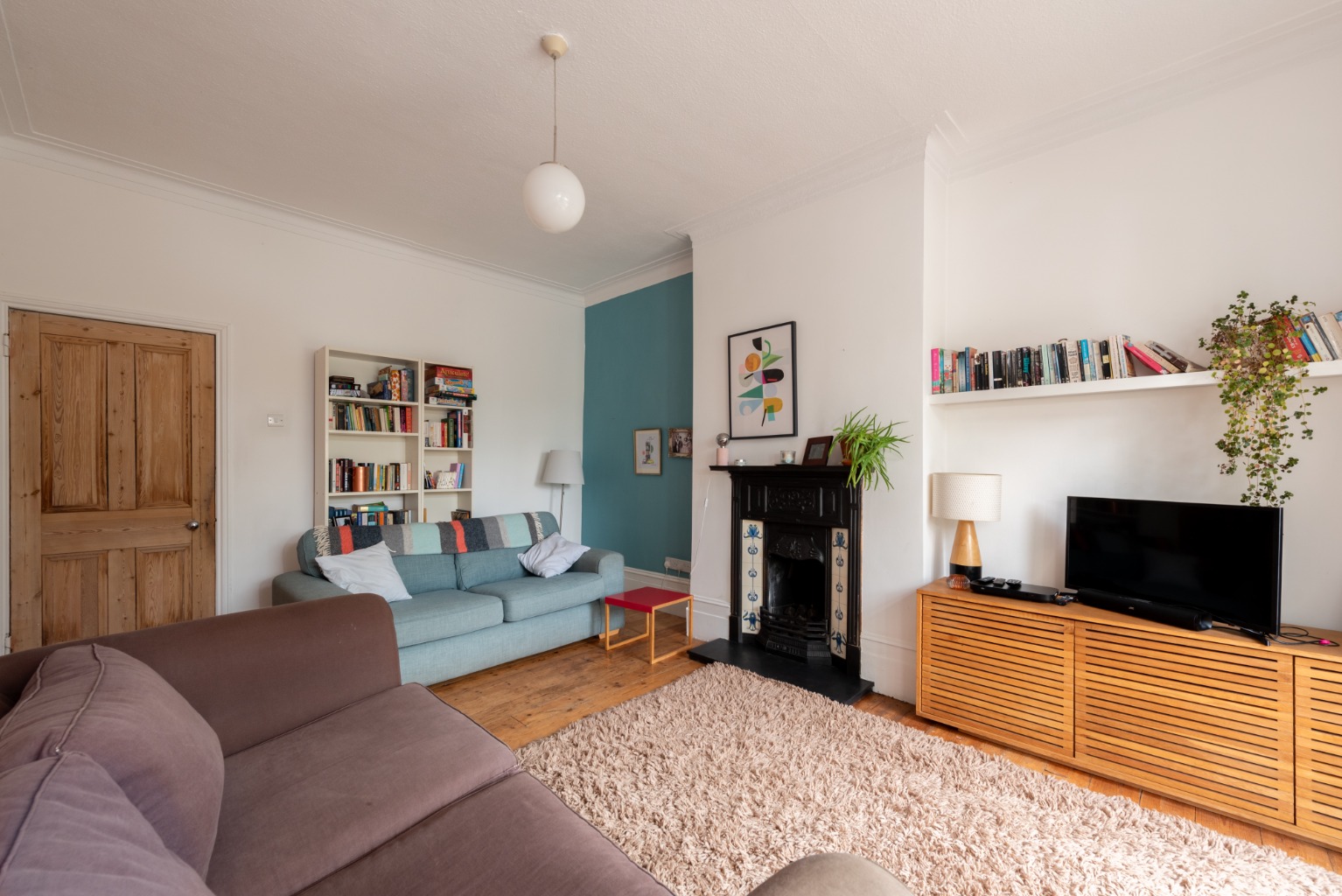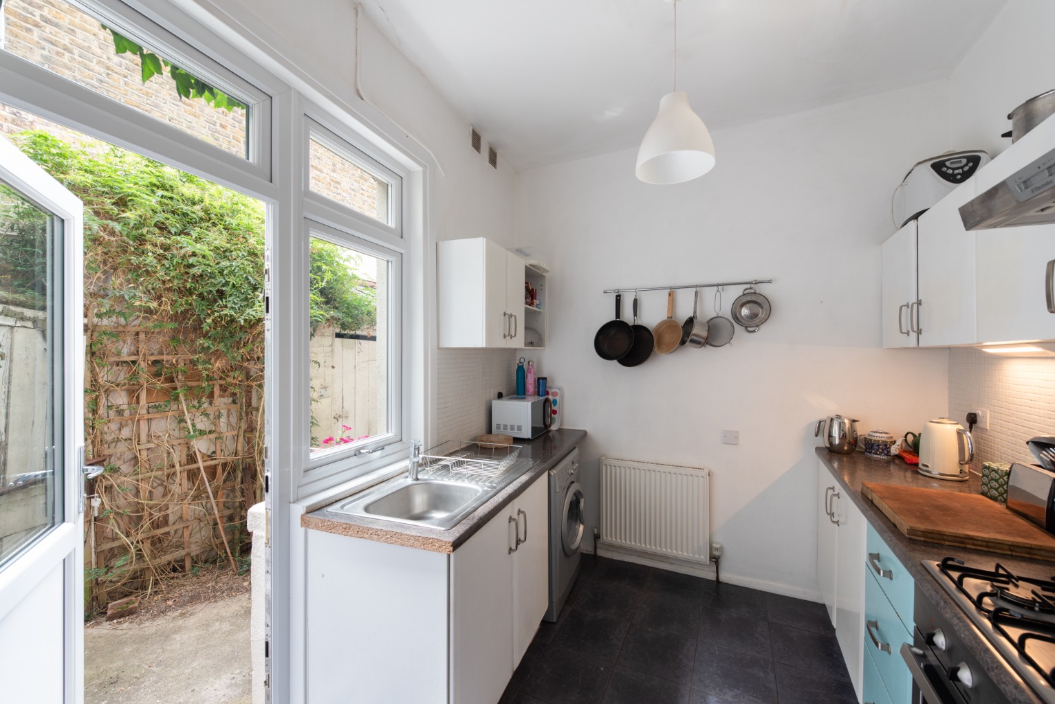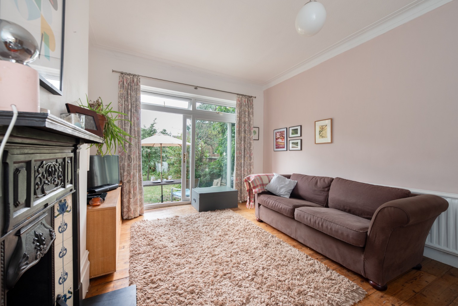 To your left is another small set of stairs which leads down to the third reception room, the impressive lounge. This is a wonderful bright space with exceptionally large patio doors for access to the garden. The white walls and stripped floorboards offer a sense of modernity which is balanced by the attractive original cast iron fireplace. This is a spacious room able to accommodate large settees or armchairs, storage and display furniture and an entertainment unit. The generous floorspace offers the opportunity for a stylish central rug, which could be complemented by some striking art pieces around the expansive walls. One alcove has been finished in an attractive teal blue and is an inviting space for a cosy reading nook or children’s play area.