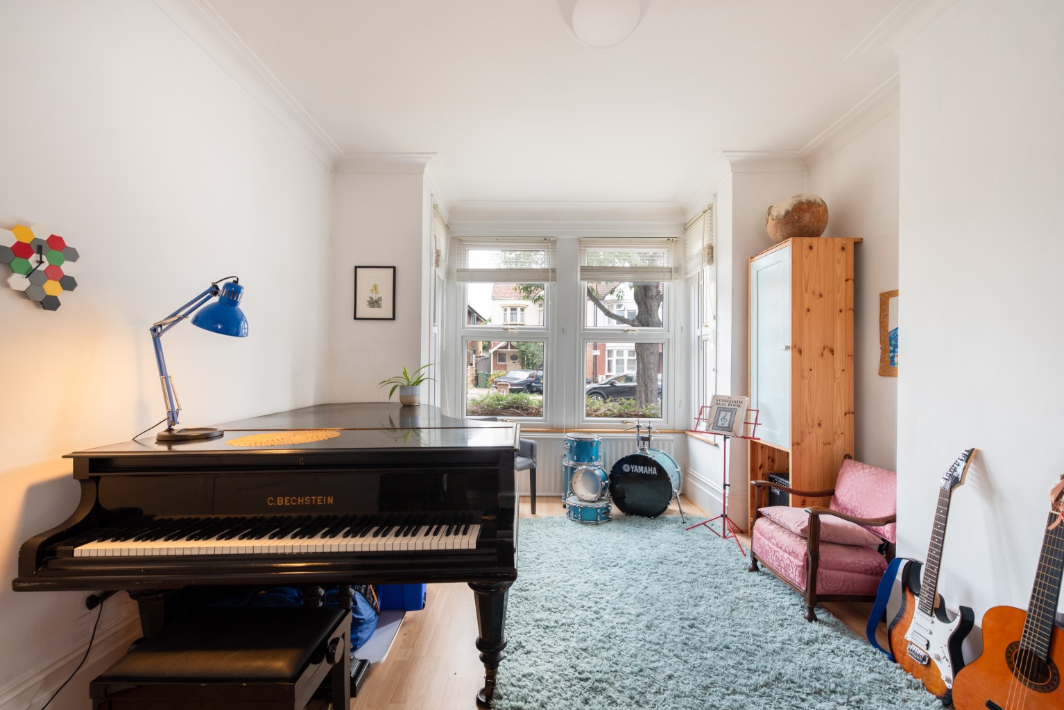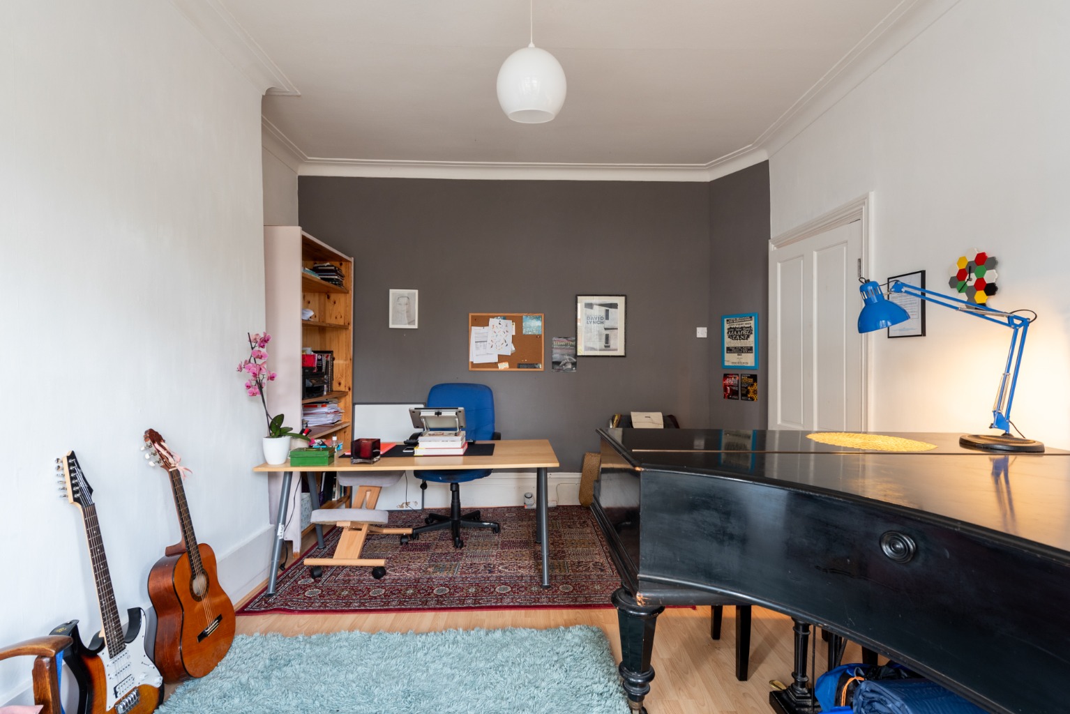 To the left is the first reception room - the music room. Here you’ll find high ceilings complemented by wide coving and deep skirting boards. The impressive bay window brings in abundant natural light and would be the perfect location for a comfortable settee, a bespoke window seat or your favourite comfy armchair - from which you can enjoy the view to the street beyond. Current furniture in this room includes a large piano, which fits comfortably in the space and highlights the scale of this striking space. The chimney breast would be the ideal location for an oversized mirror or feature art piece and the alcoves either side could accommodate large bookcases for a sense of dramatic symmetry. Decoration is simple with predominantly white walls, complemented by a single wall in a modern grey, and flooring is timber laminate.