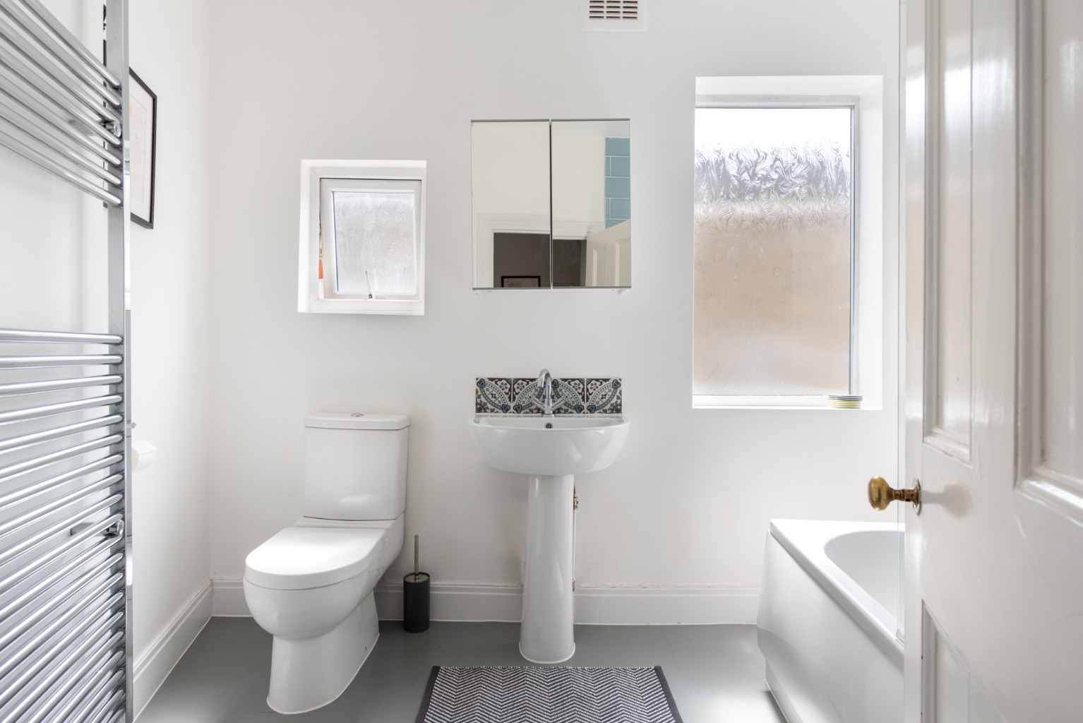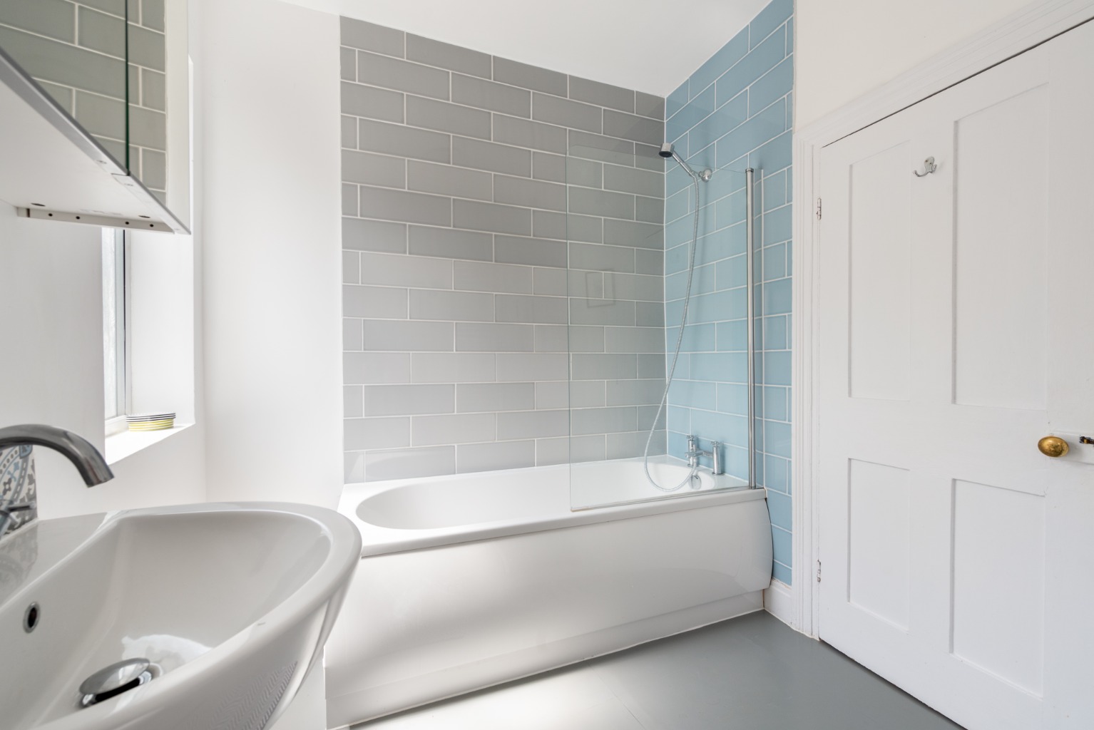 As you return along the landing, you’ll pass a useful built-in storage cupboard and then you’ll arrive at the well-appointed family bathroom. This room has a modern feel, with the space enhanced by the natural light from two windows. The white three piece bathroom suite comprises a low flush WC, a large pedestal washbasin with mirror above, plus a bathtub with shower attachment above and glazed screen. The full height tiling around the bath is an unusual and striking mix of several shades of grey in a running bond pattern, with a complementary run of tile at the end of the bath in various shades of light teal – it’s a real designer touch. Walls are painted white, flooring is a modern grey vinyl and there’s a tall combined radiator and towel rail in chrome.