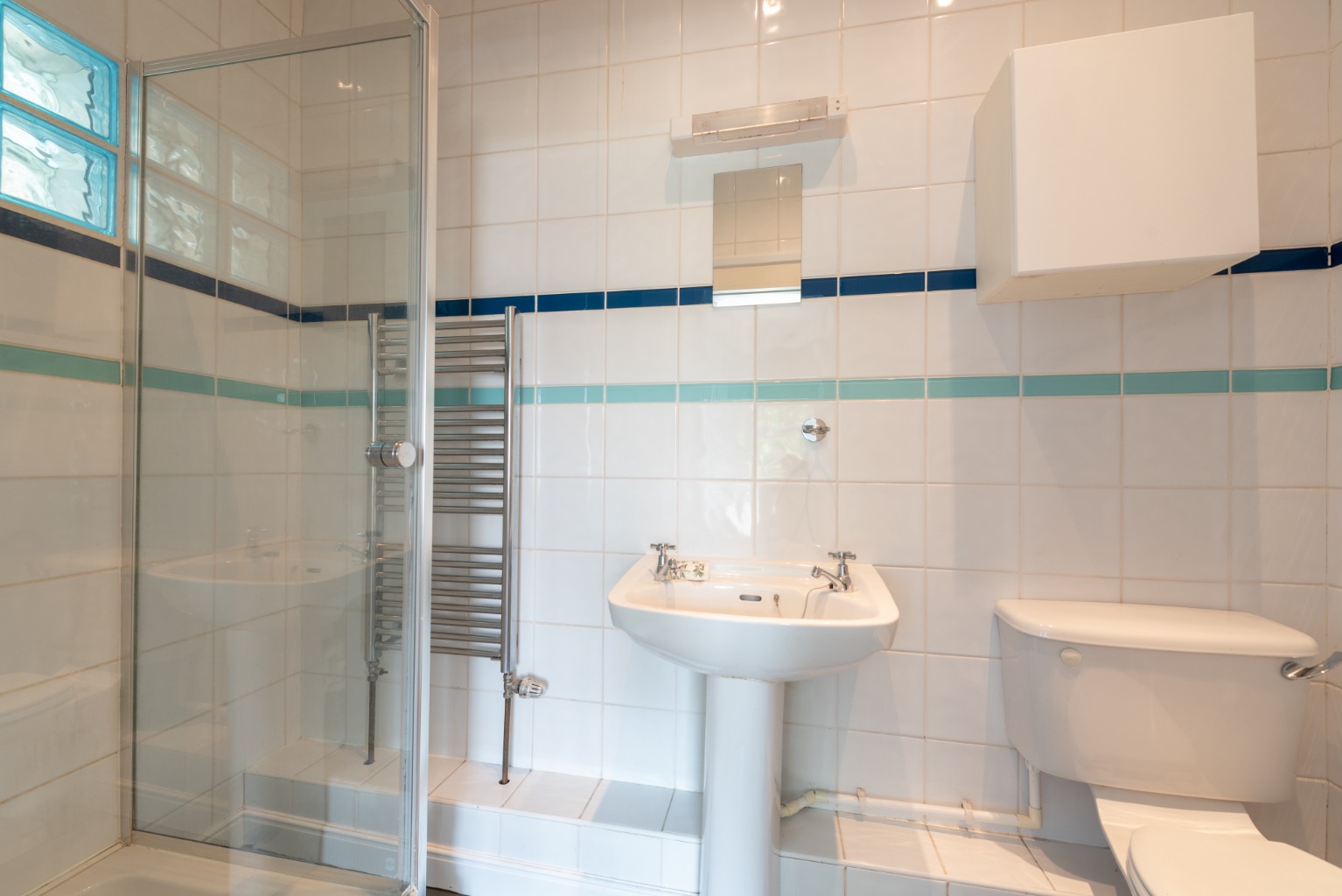 The en-suite shower room is accessed via a pocket door to save space and comprises of a WC with cabinet above, a pedestal washbasin with mirror above and a glazed shower enclosure. Walls are fully tiled in white with two tiled borders in light and dark teal. Flooring is practical grey laminate and there’s a chrome radiator/towel rail.