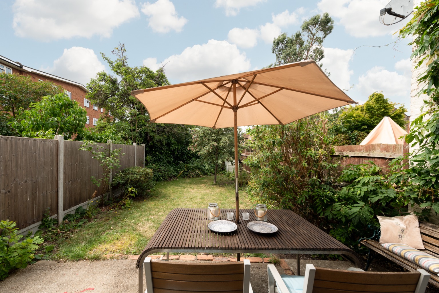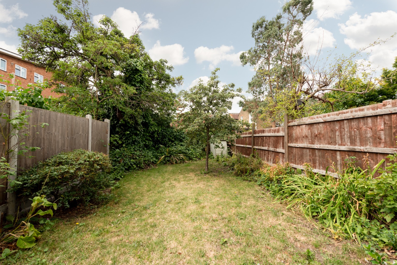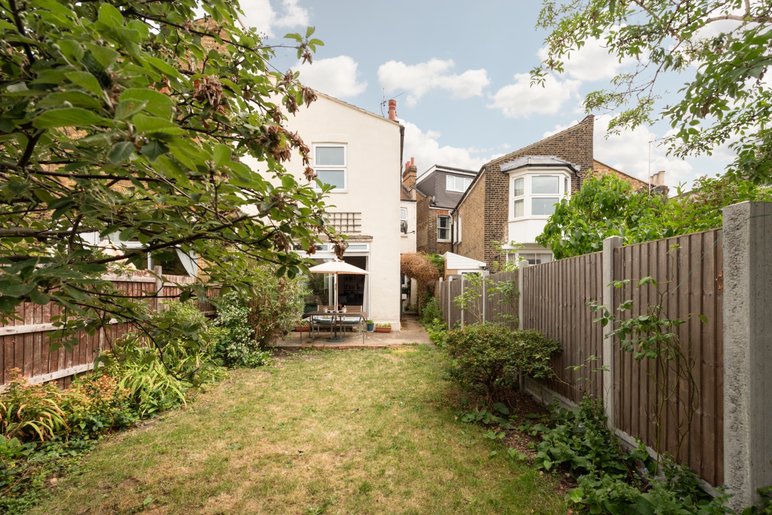 Take a moment to allow yourself to be distracted by the impressive view out to the garden, and now we’ll head out there to explore. Through the patio doors you’ll find a terrace seating area, beyond which is a lawn bordered by mature shrubs and trees. The side return has a useful Belfast sink, a small brick-built storage cupboard, access to the kitchen and side access from the front of the property via a gate. Already a lovely family garden, the size, privacy and southwest orientation offers the potential to a transformation this into a tropical paradise, ideal for lazy days in the sun and exciting evenings entertaining friends and family.
