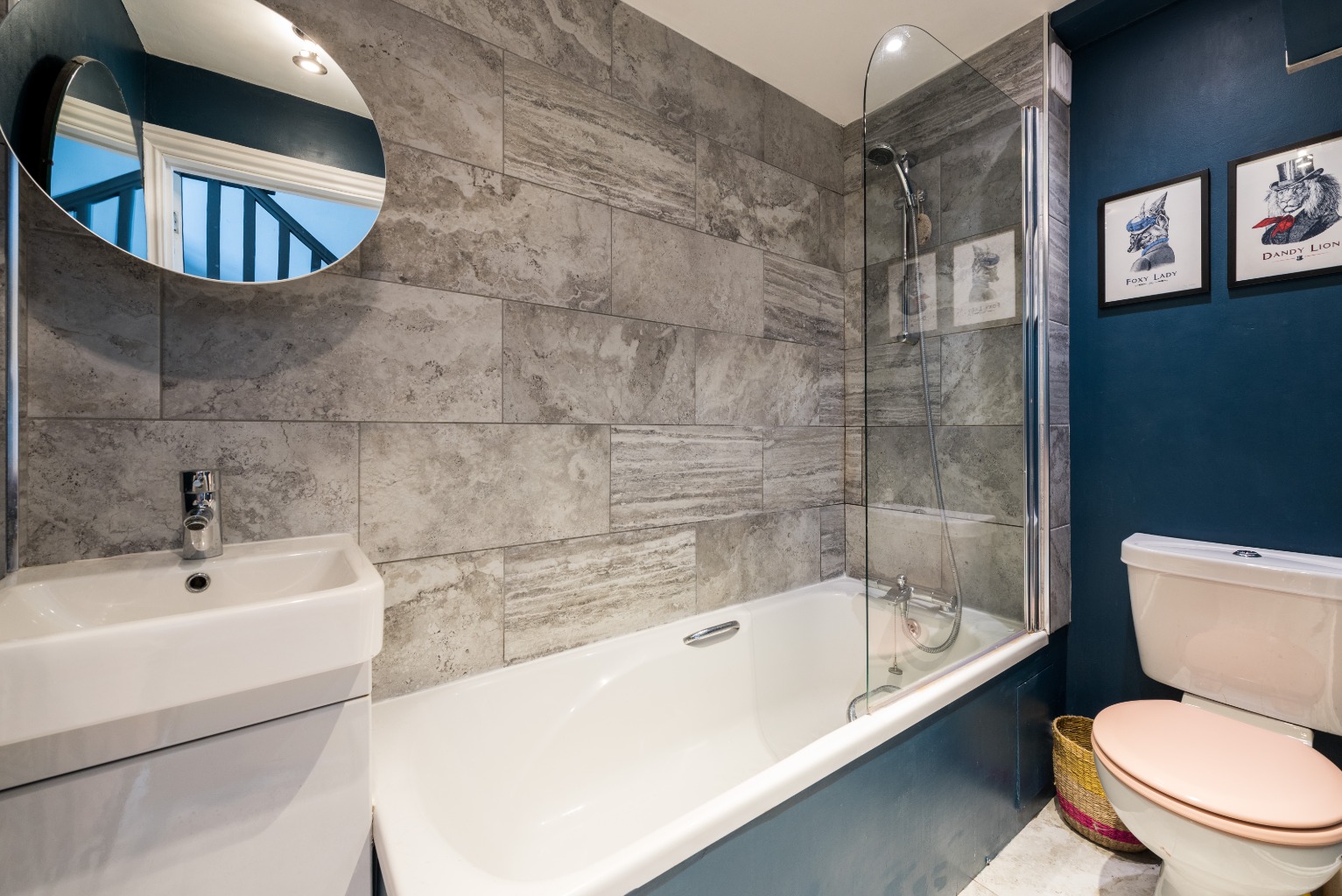As you pass through this beautiful space, you’ll see the stairs with the charcoal grey balustrade to your right, but just before, to your left-hand side, is the small yet sophisticated and super-smart bathroom. The three piece suite in white consists of WC, bath (with overhead shower and screen) and chunky square sink with unit. The walls around the bath have been finished with oversized rectangular tiles in mottled mid-greys, with lighter tiles to the floor and the remaining walls and bath panel painted in a striking petrol blue. The contemporary lighting and large oval mirror add the finishing flourishes.