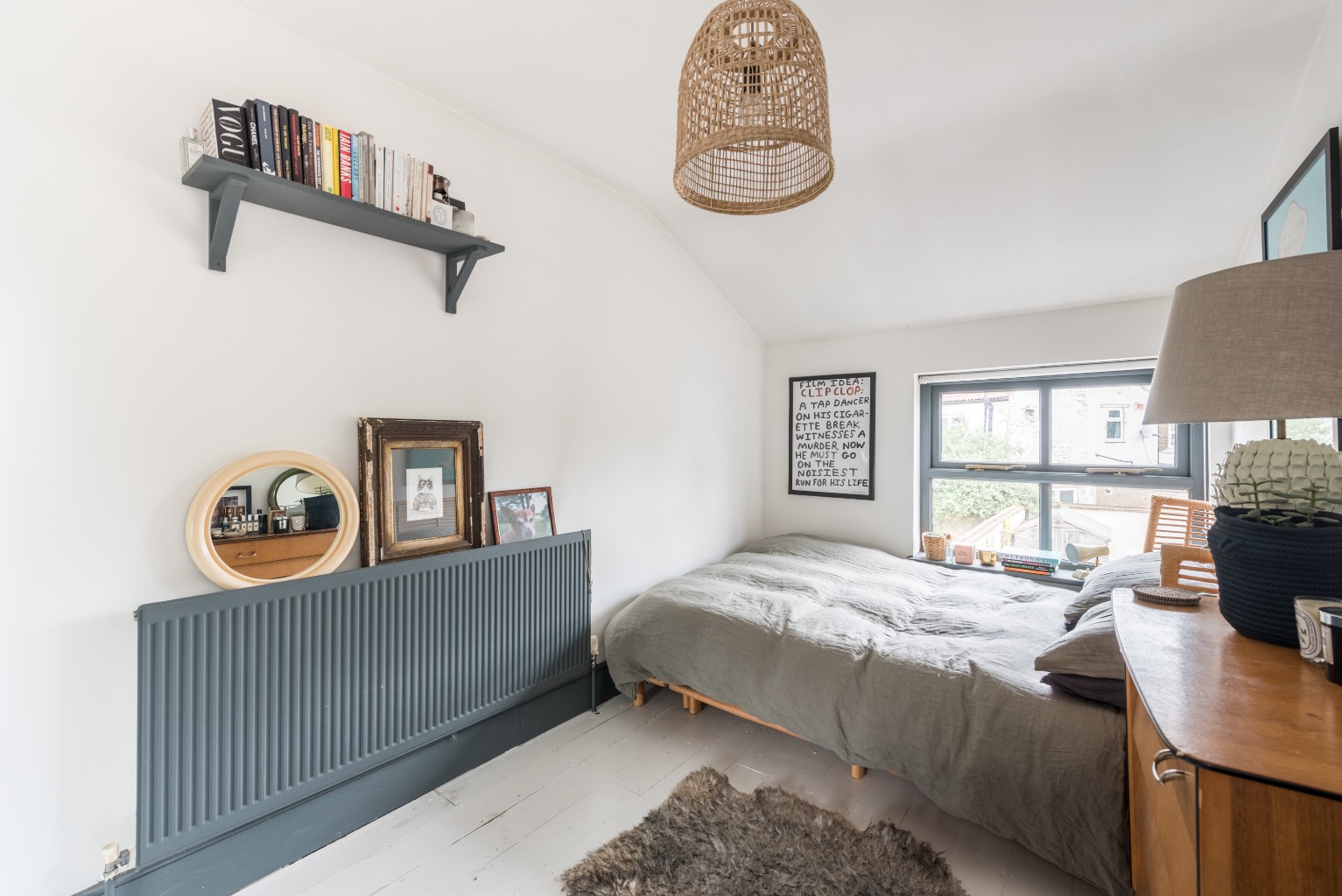 Back into the cottage and up the stairs, bedroom one lies to your right-hand side – the slightly larger of the two in this property. Another room with a fresh, bright atmosphere, the white painted floorboards and large window overlooking the rear garden accentuate the size of this space. It would easily accommodate for a comfy double bed (or bigger!), a wardrobe, dresser or drawers, and there’s a grey painted wooden shelf on the main wall above the matching-coloured radiator, bringing a sophisticated touch to the otherwise neutral space and providing a place to display some favourite photos or books.