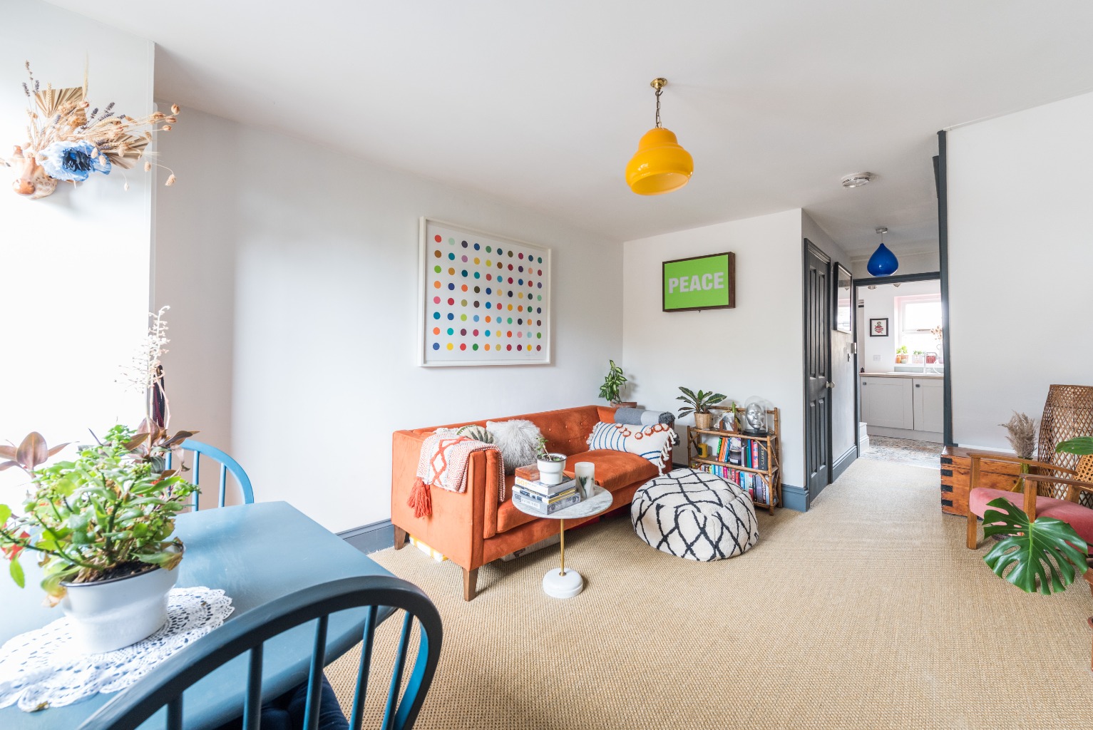 Entering directly into the large reception room, you’ll immediately notice how light and bright it is, with natural rays flowing from both the front-aspect window and the kitchen beyond. The fresh, white décor is lifted by the stylish blue/grey wood accents and offers plenty of potential for you to make your own mark on it quickly and easily. The natural-looking beige carpet feels in keeping with the character of the cottage, blending the modern aspects with the more traditional. There’s room enough here for a large sofa or suite, your entertainments, coffee table, shelving or display units – plus even a small dining table if you wish to have a space to eat or work.