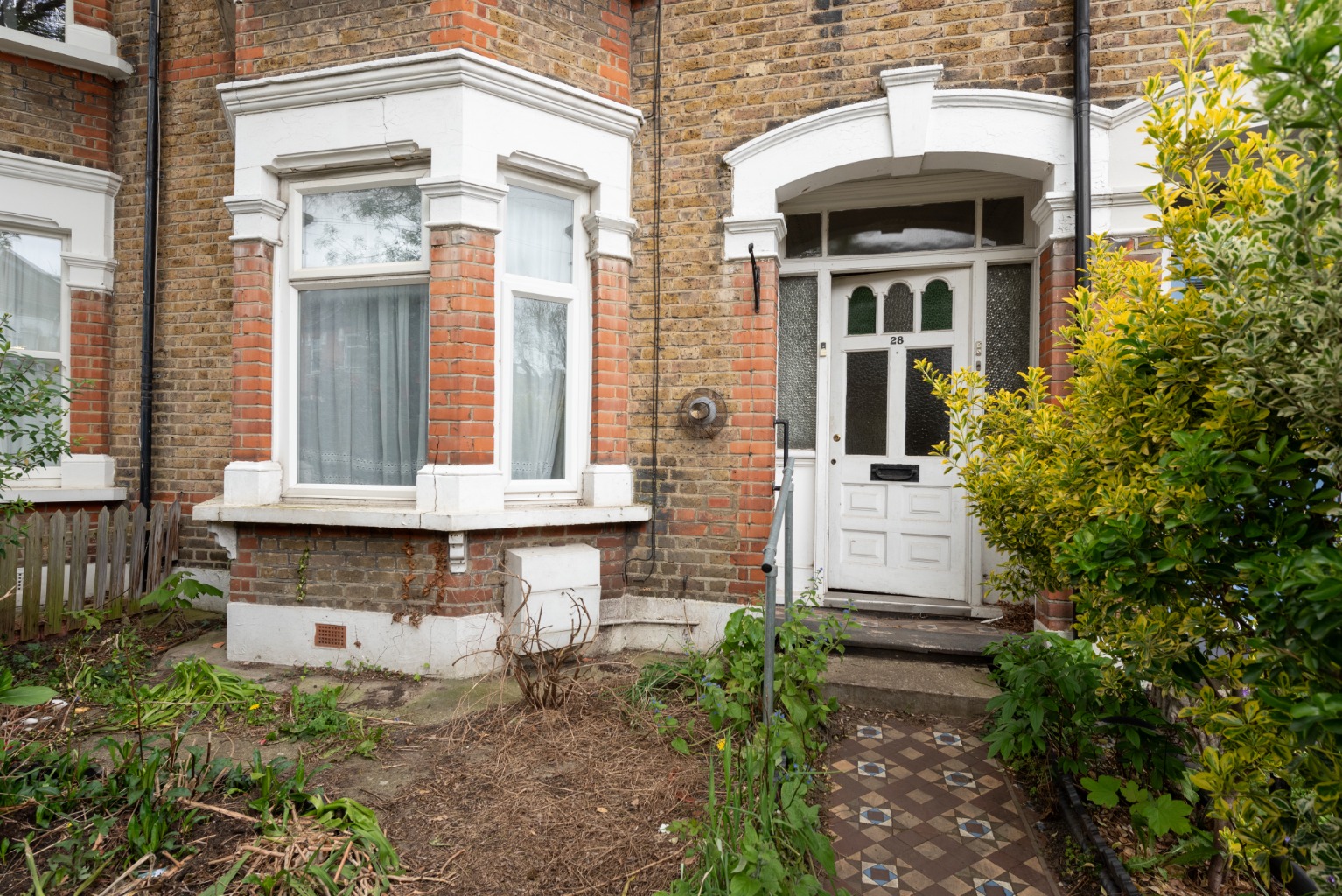 The property sits on a lovely residential street and retains its grand architectural features, including a double height bay. A pathway of Victorian geometric tiles leads through a private south- facing front garden to an arched porch.